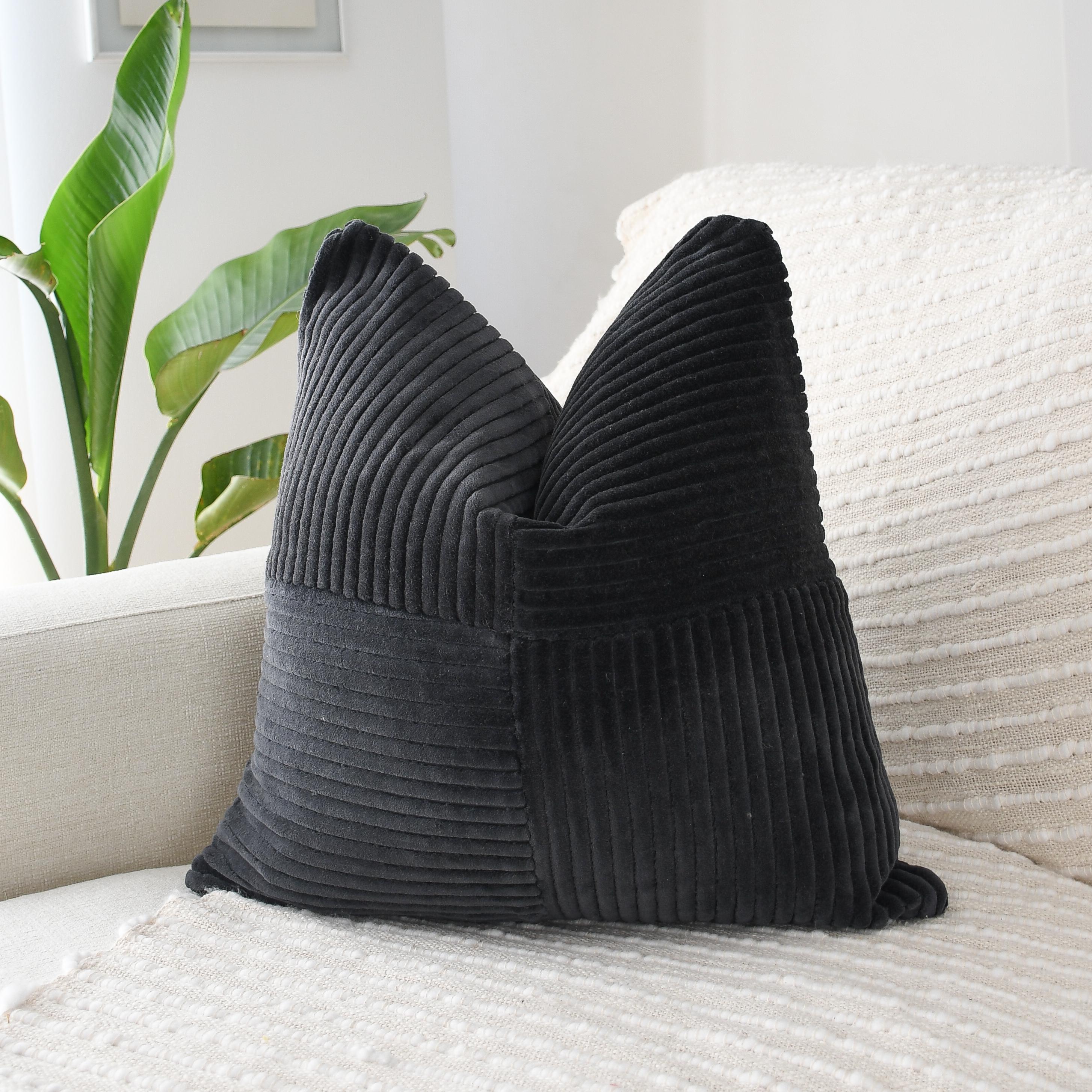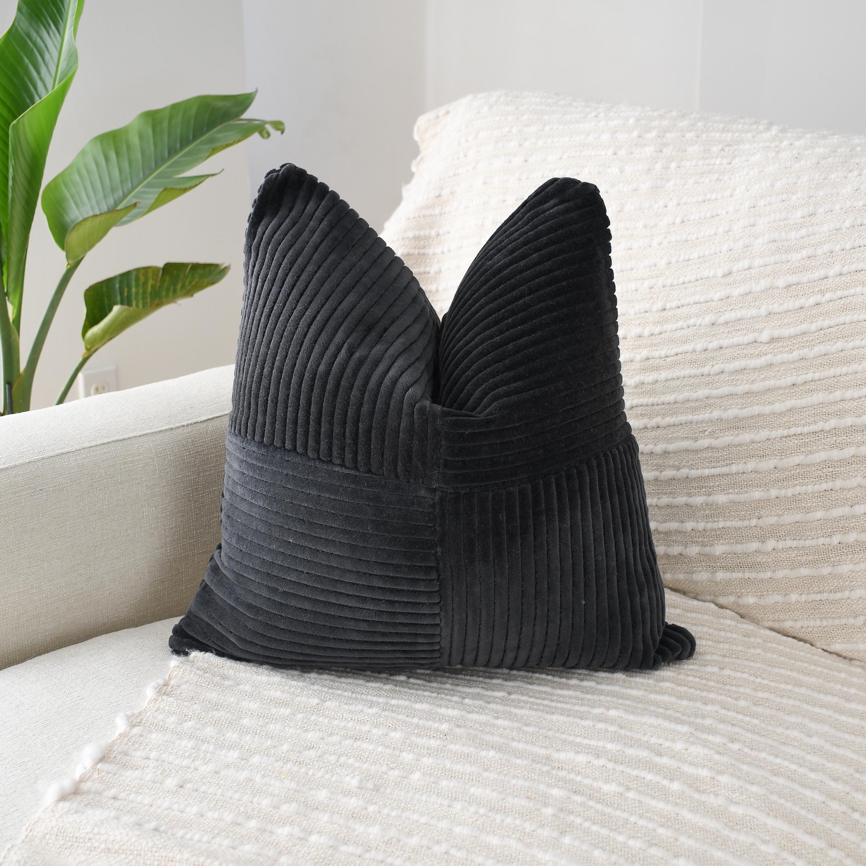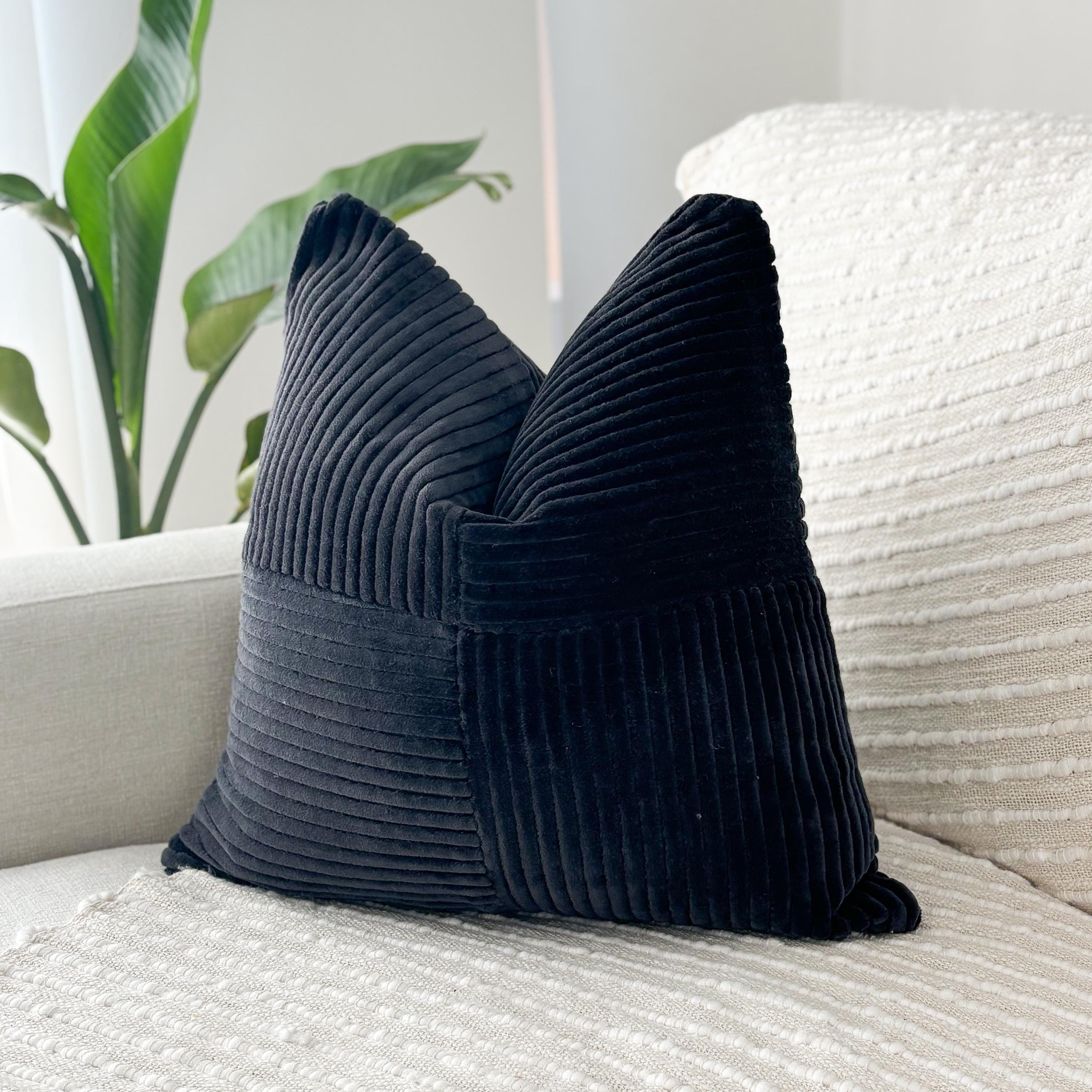 The deep charcoal-black velvet corduroy brings dramatic richness, while its soft, tactile surface adds instant dimension to any room. This is the kind of pillow that transforms a space—warm, modern, and beautifully structured.