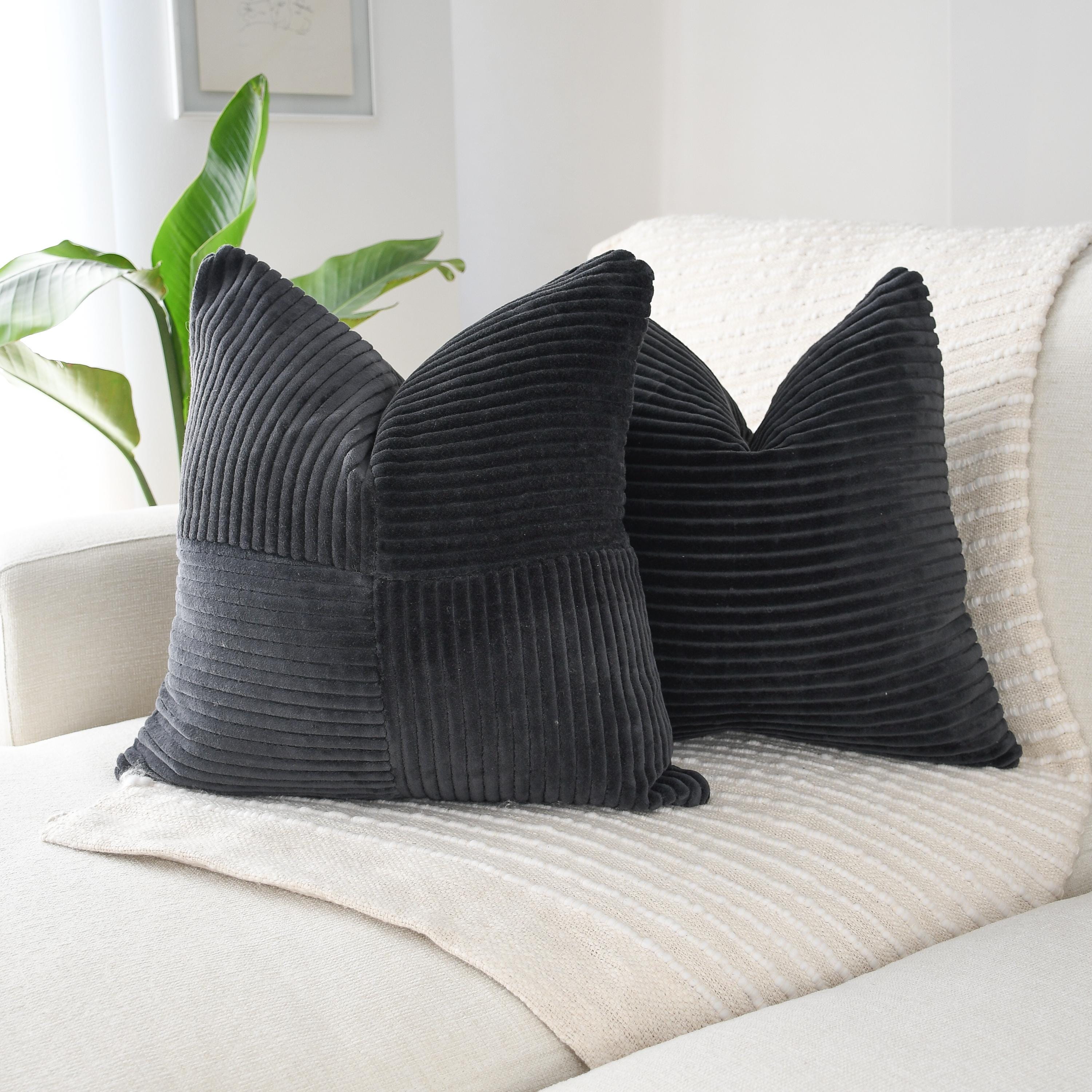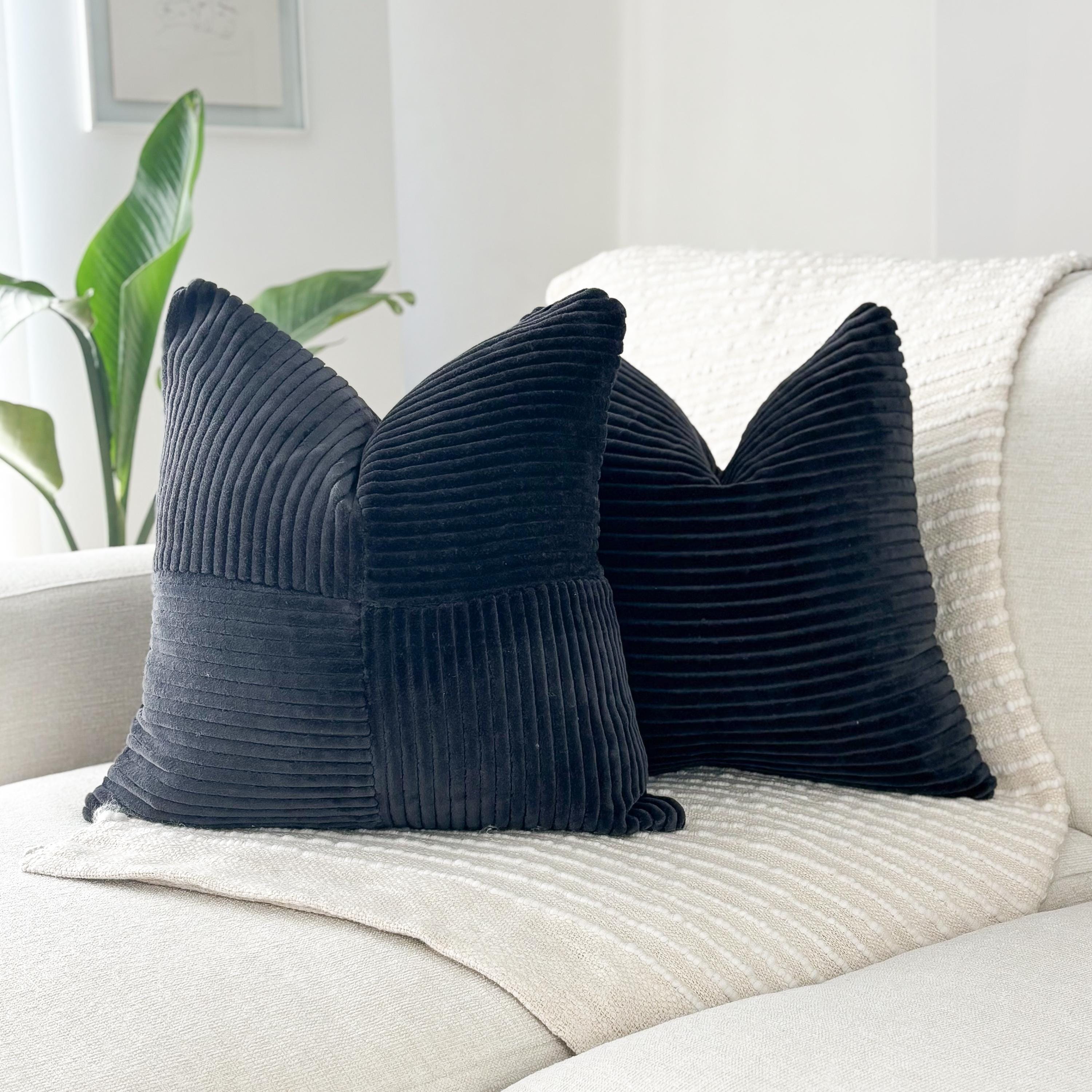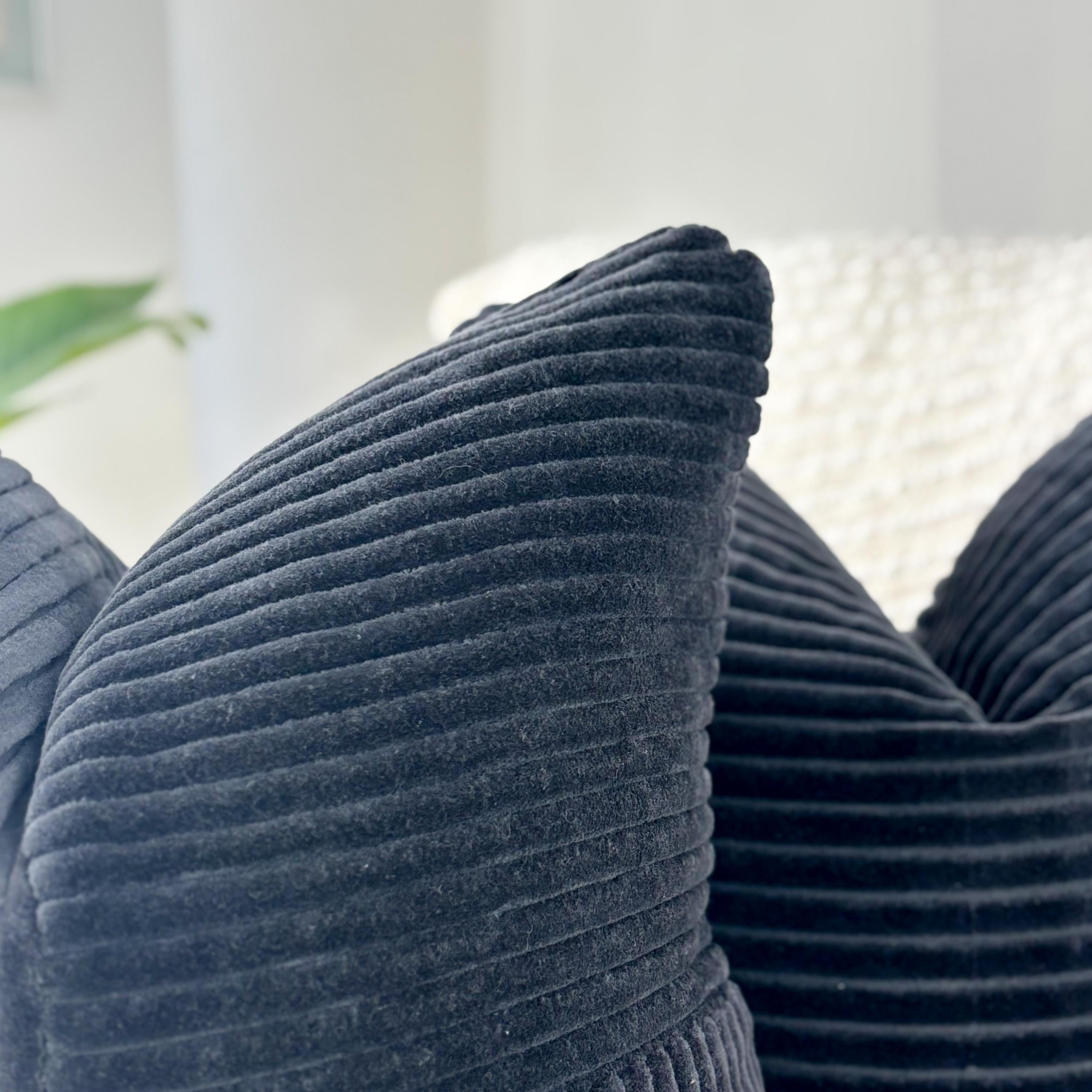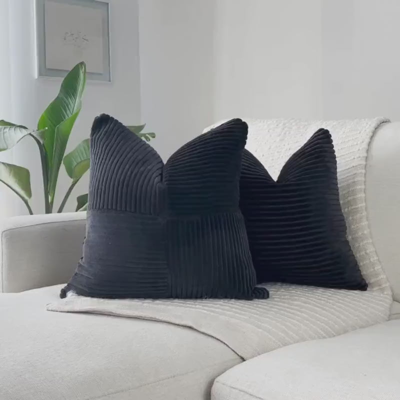 The deep charcoal-black velvet corduroy brings dramatic richness, while its soft, tactile surface adds instant dimension to any room. This is the kind of pillow that transforms a space—warm, modern, and beautifully structured.