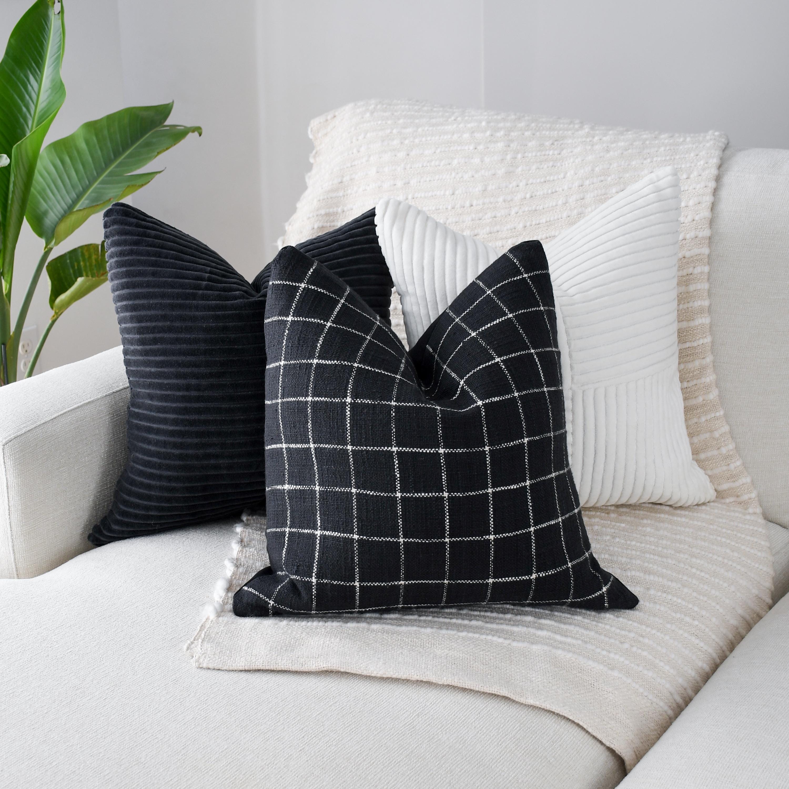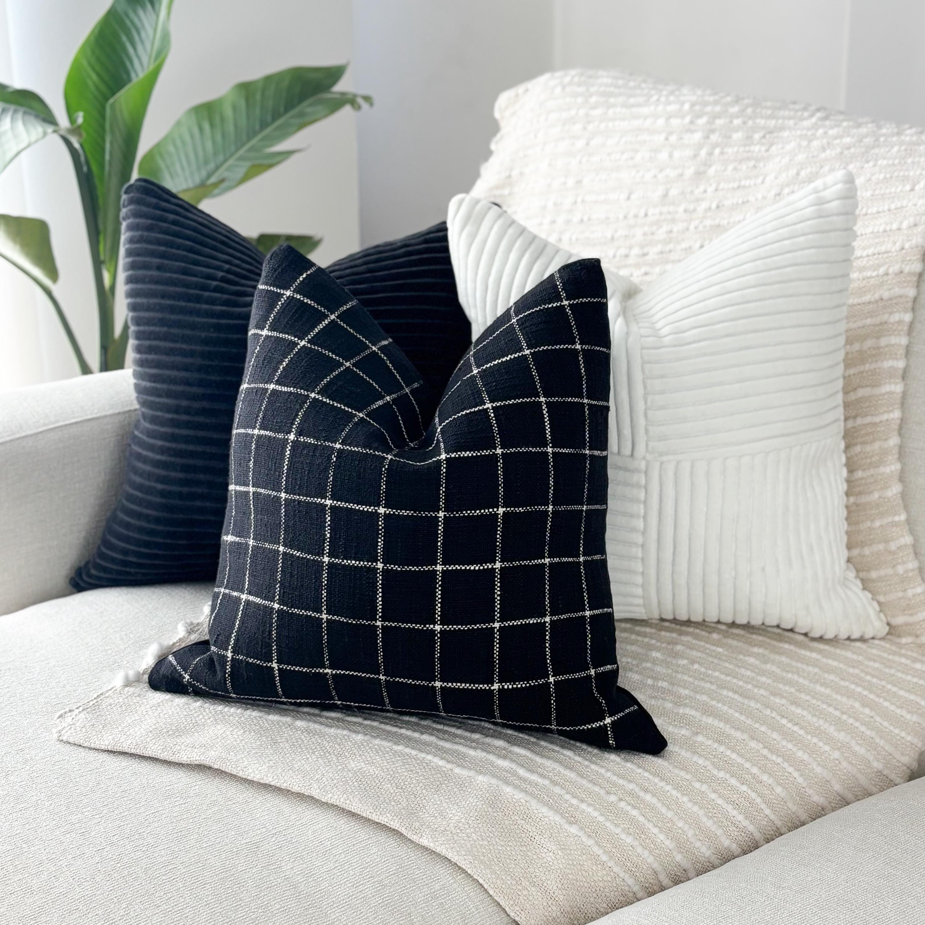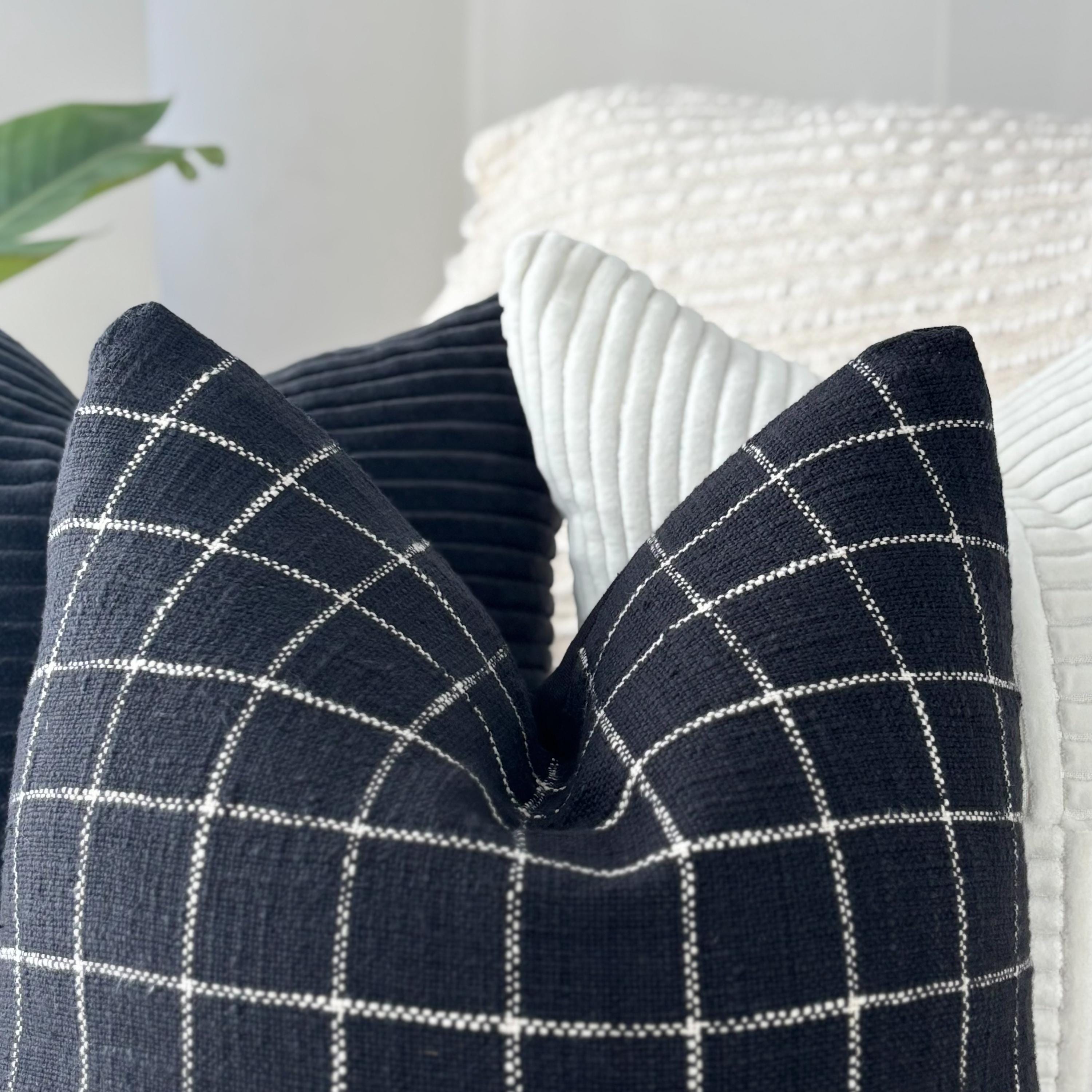 The black and white checkered pillow grounds the set with its clean stitched grid pattern. The black canvas backing adds structure and a matte contrast, giving the pillow a tailored, modern finish. Its crisp lines make it the perfect anchor piece for any monochrome styling.