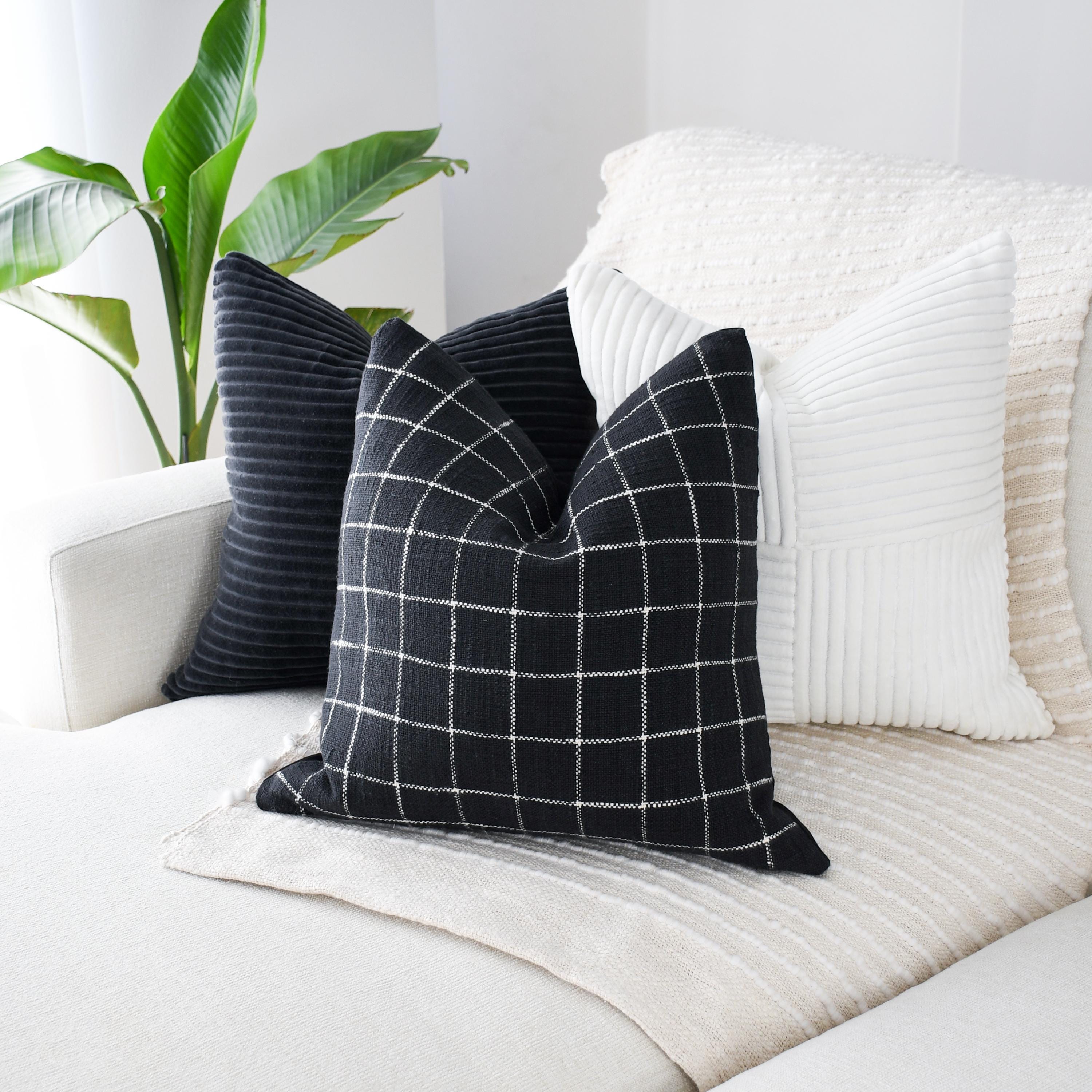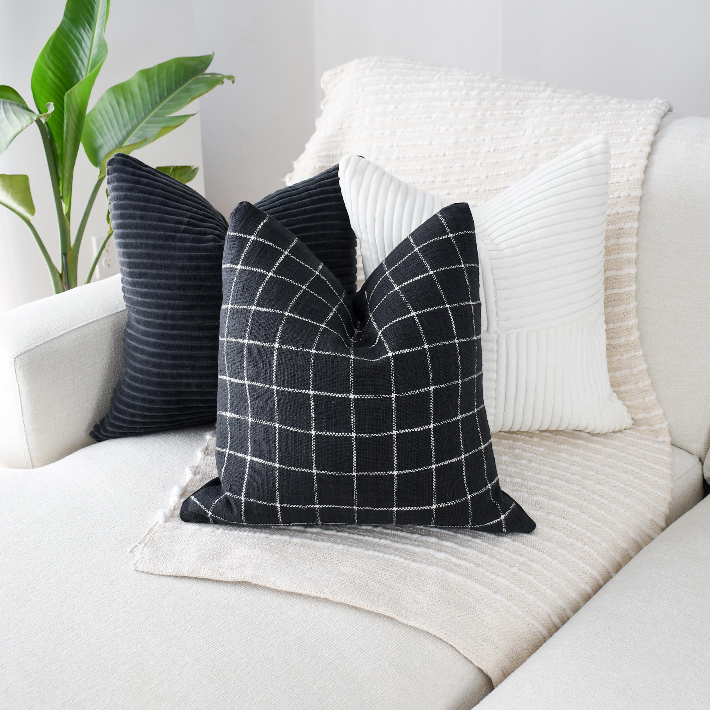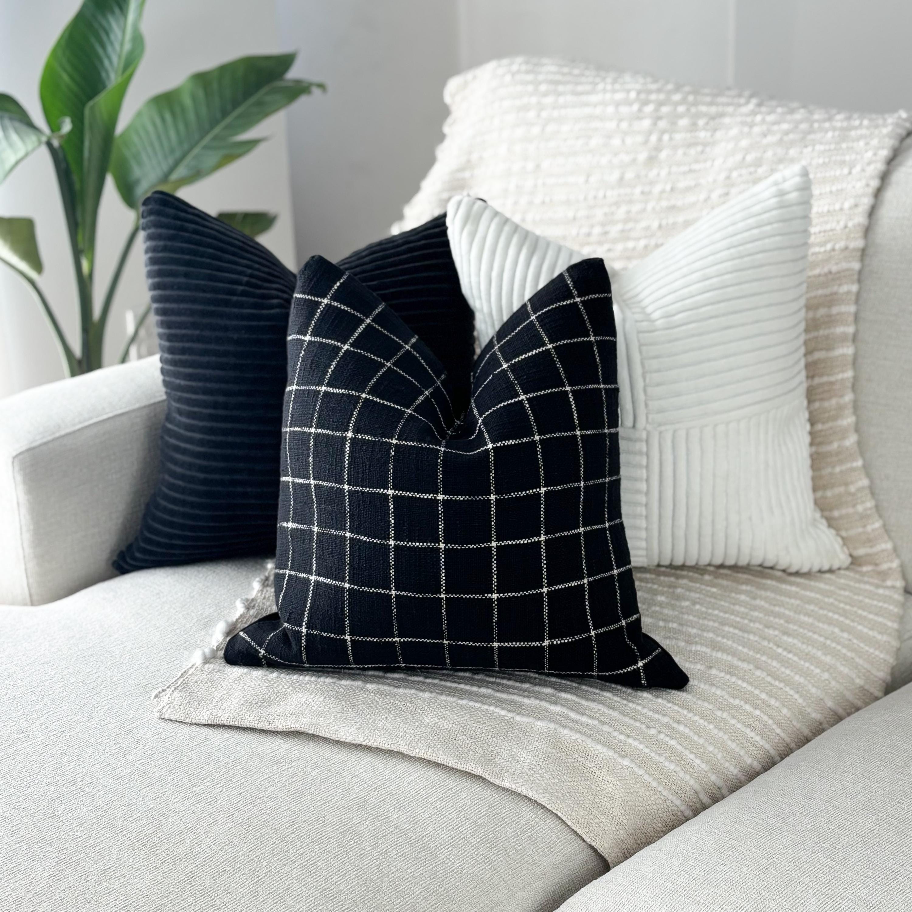 The black and white checkered pillow grounds the set with its clean stitched grid pattern. The black canvas backing adds structure and a matte contrast, giving the pillow a tailored, modern finish. Its crisp lines make it the perfect anchor piece for any monochrome styling.