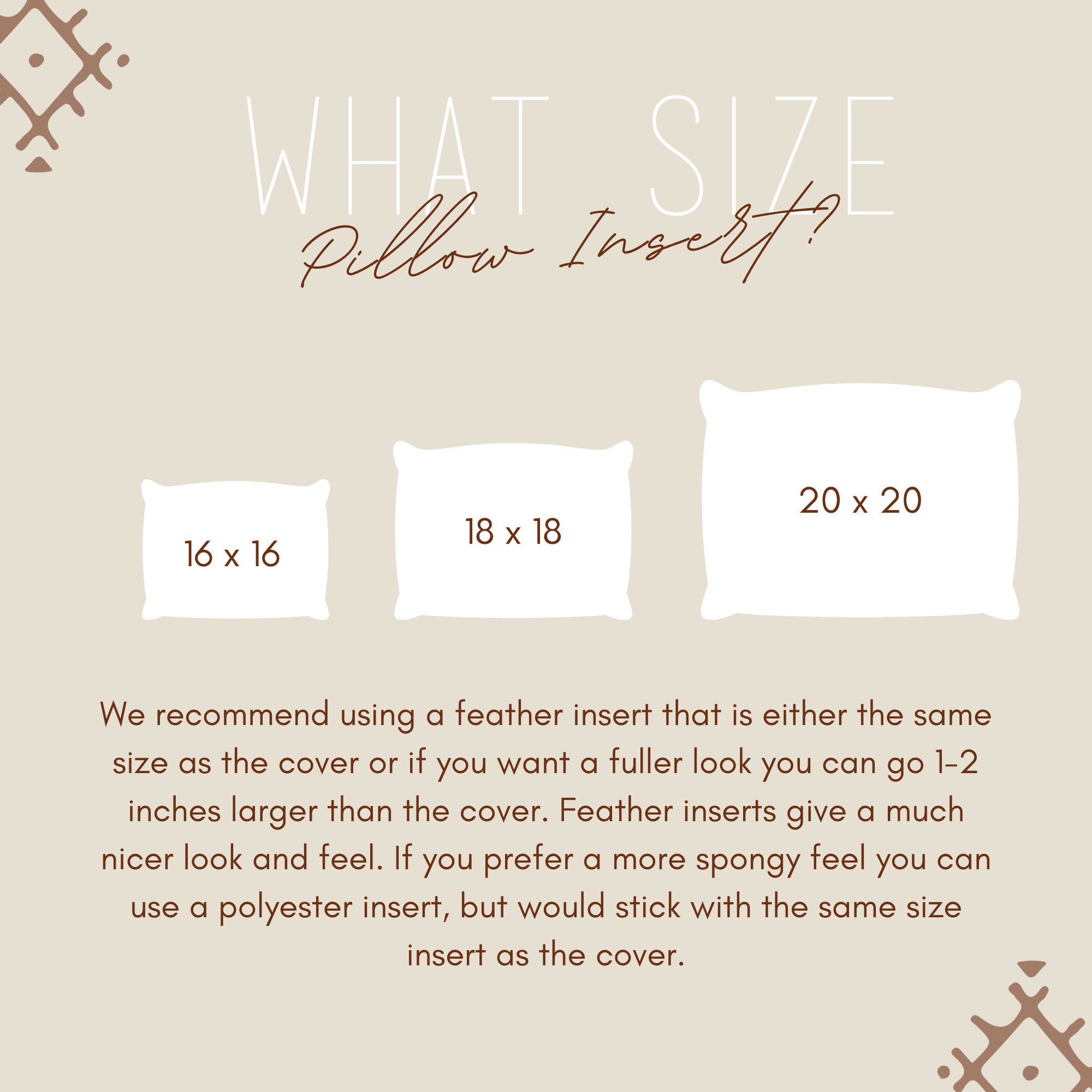 We recommend a 18x18 feather pillow insert for optimal fluff and comfort of the pillow.
