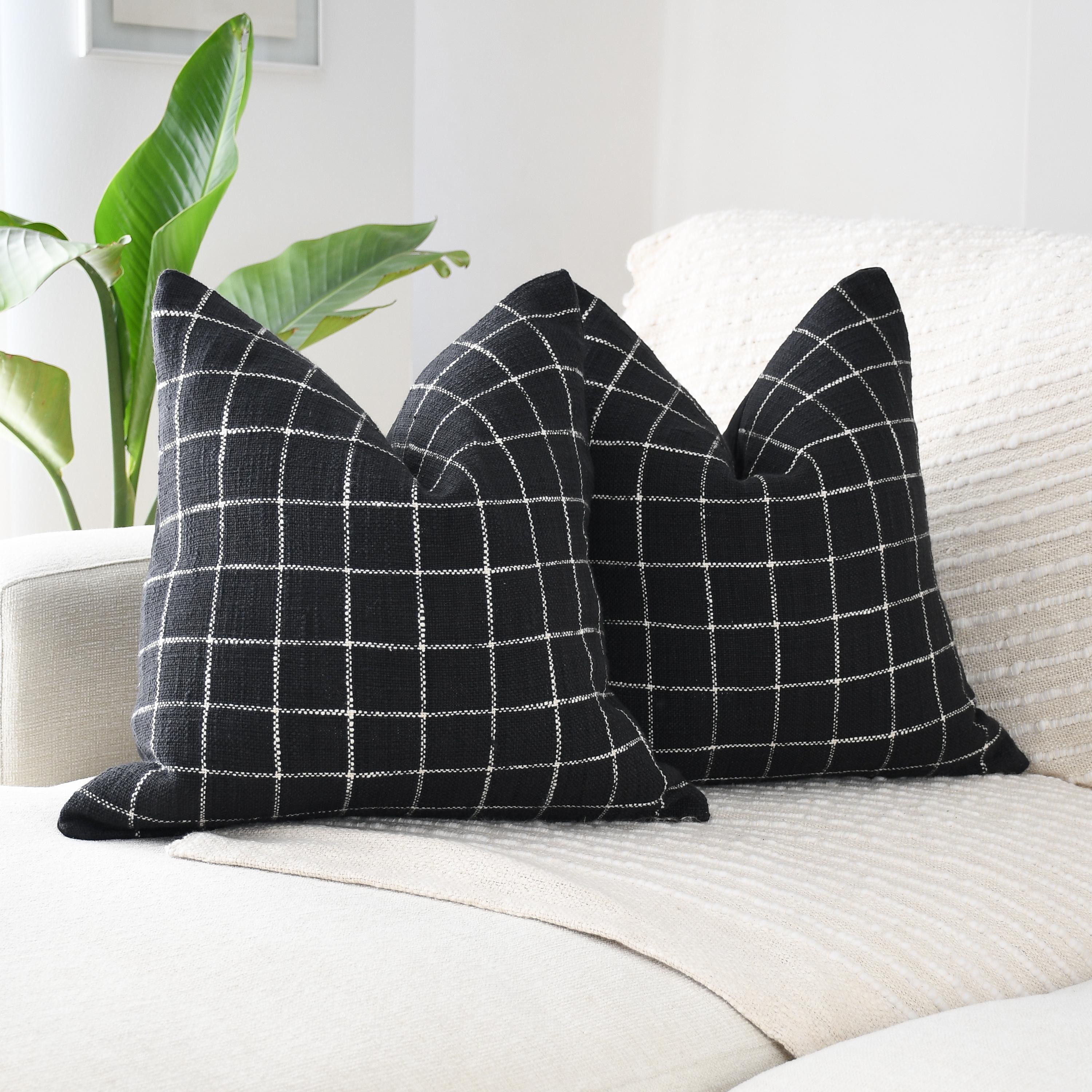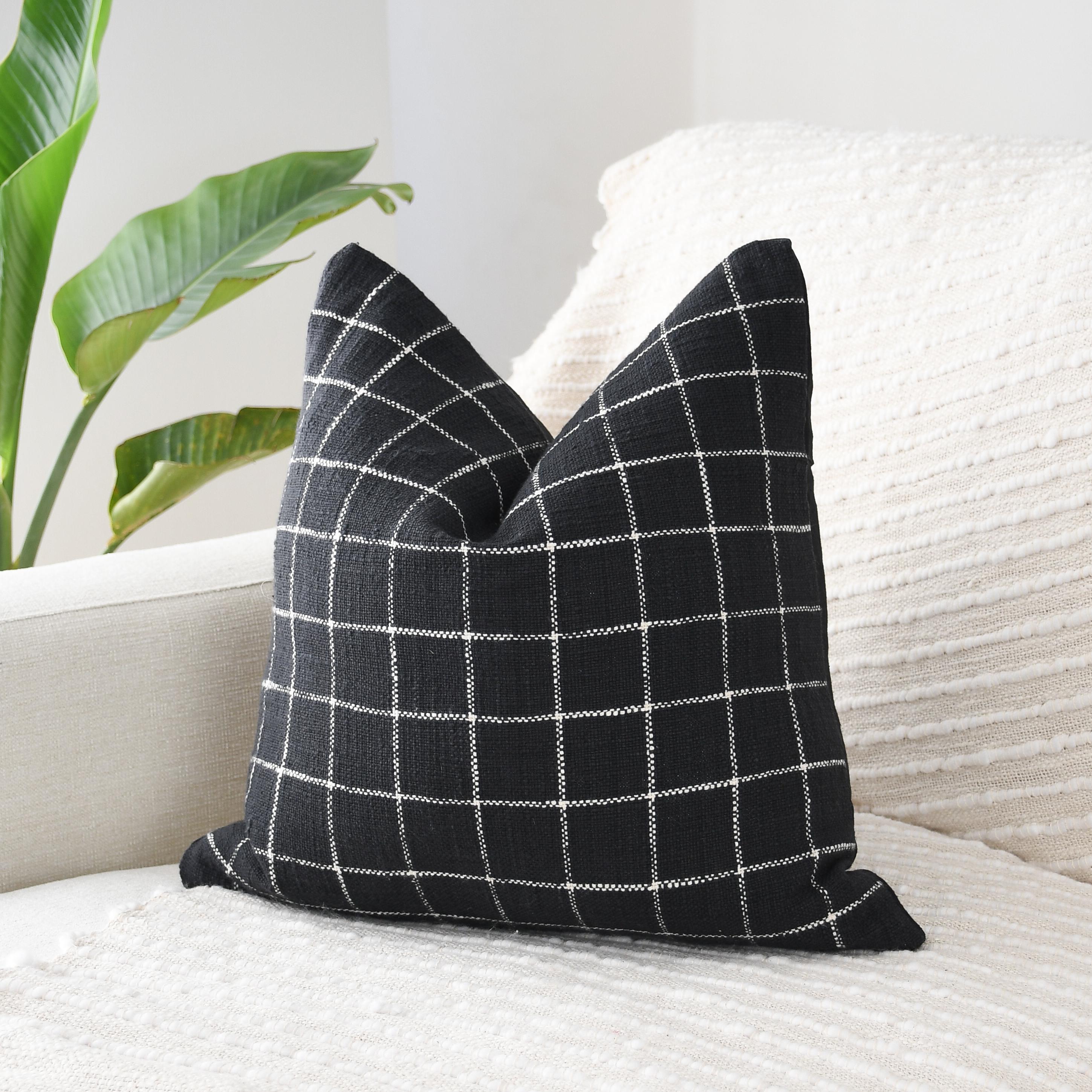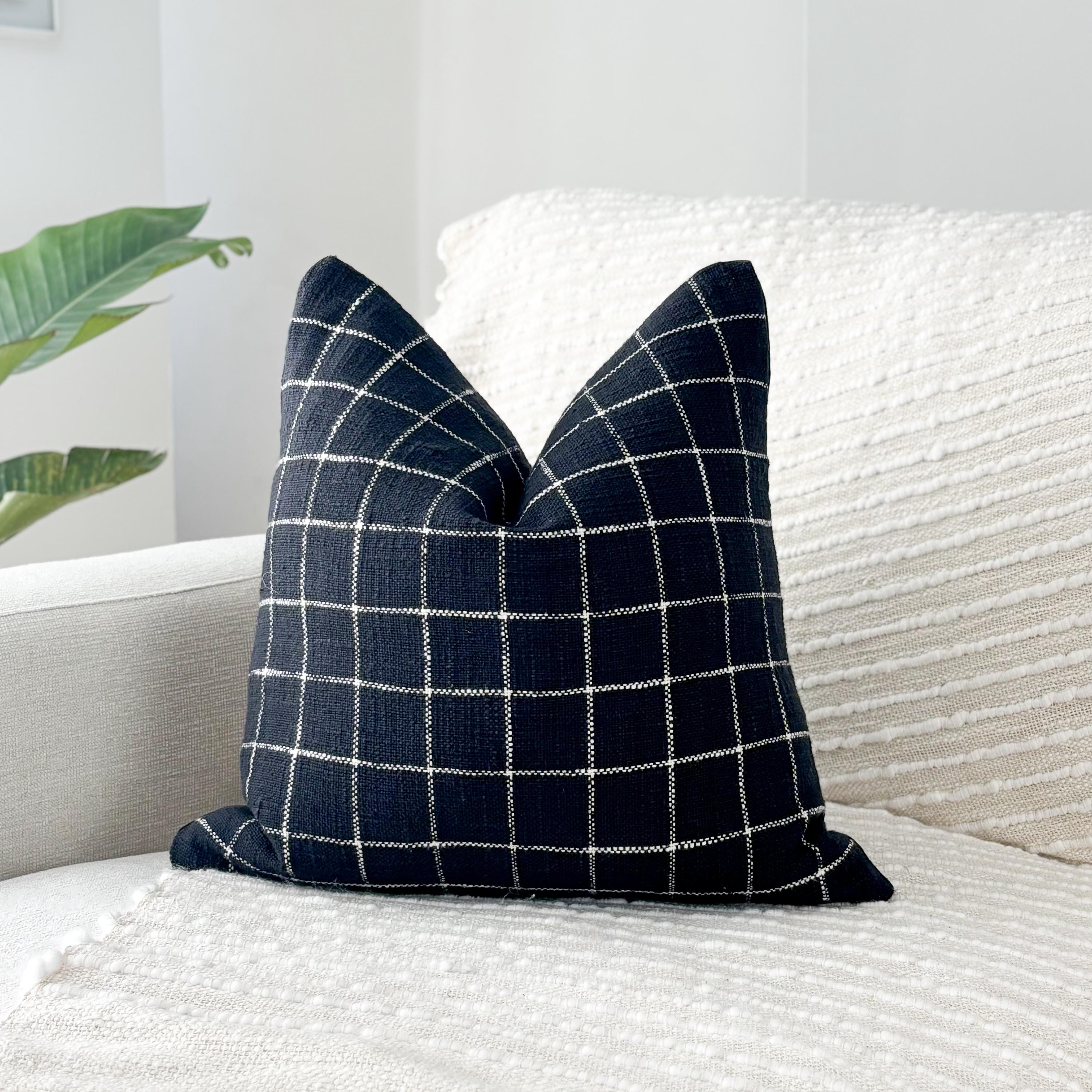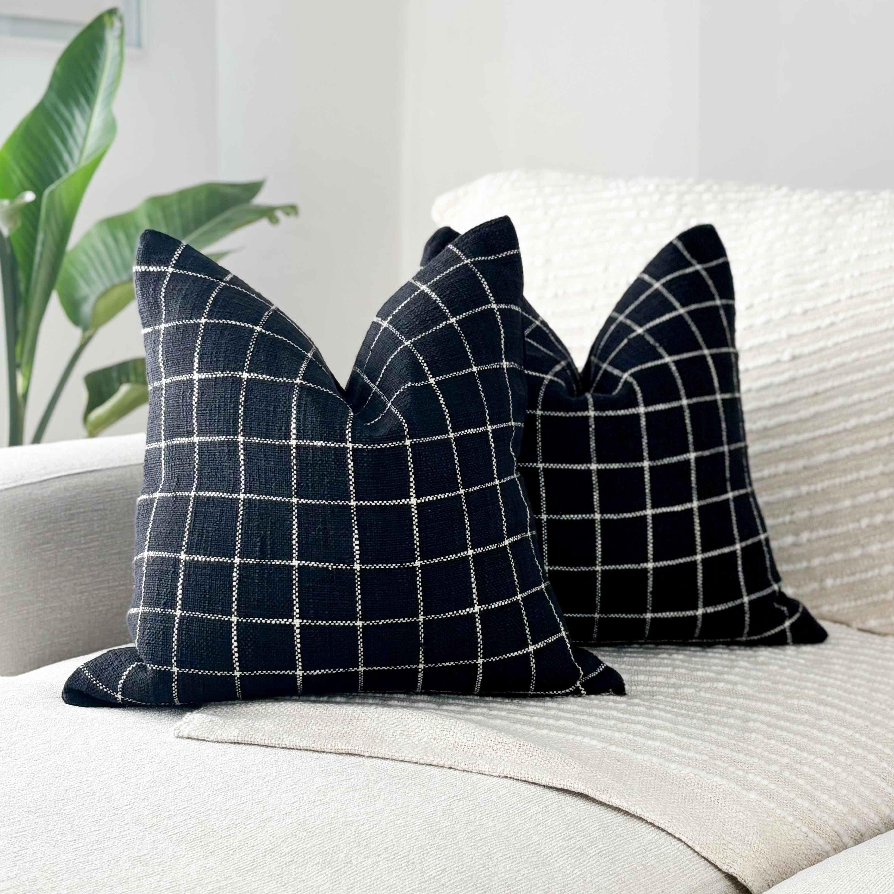 These beautiful pillows use hand woven fabrics imported from India. (Pillow Insert NOT included). Bring clean lines and elevated contrast into your home with our Black Checkered Modern Accent Pillow Cover. Designed in an 18x18 size, this pillow features a bold black-and-white stitched grid pattern on the front, paired with a smooth solid black canvas backing for a sleek, reversible finish.