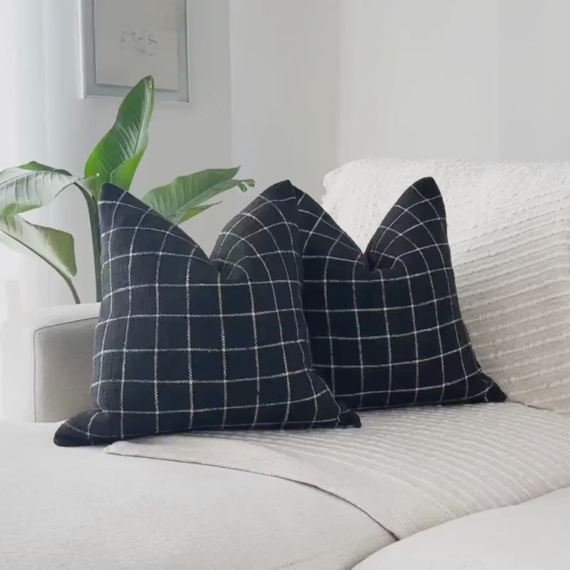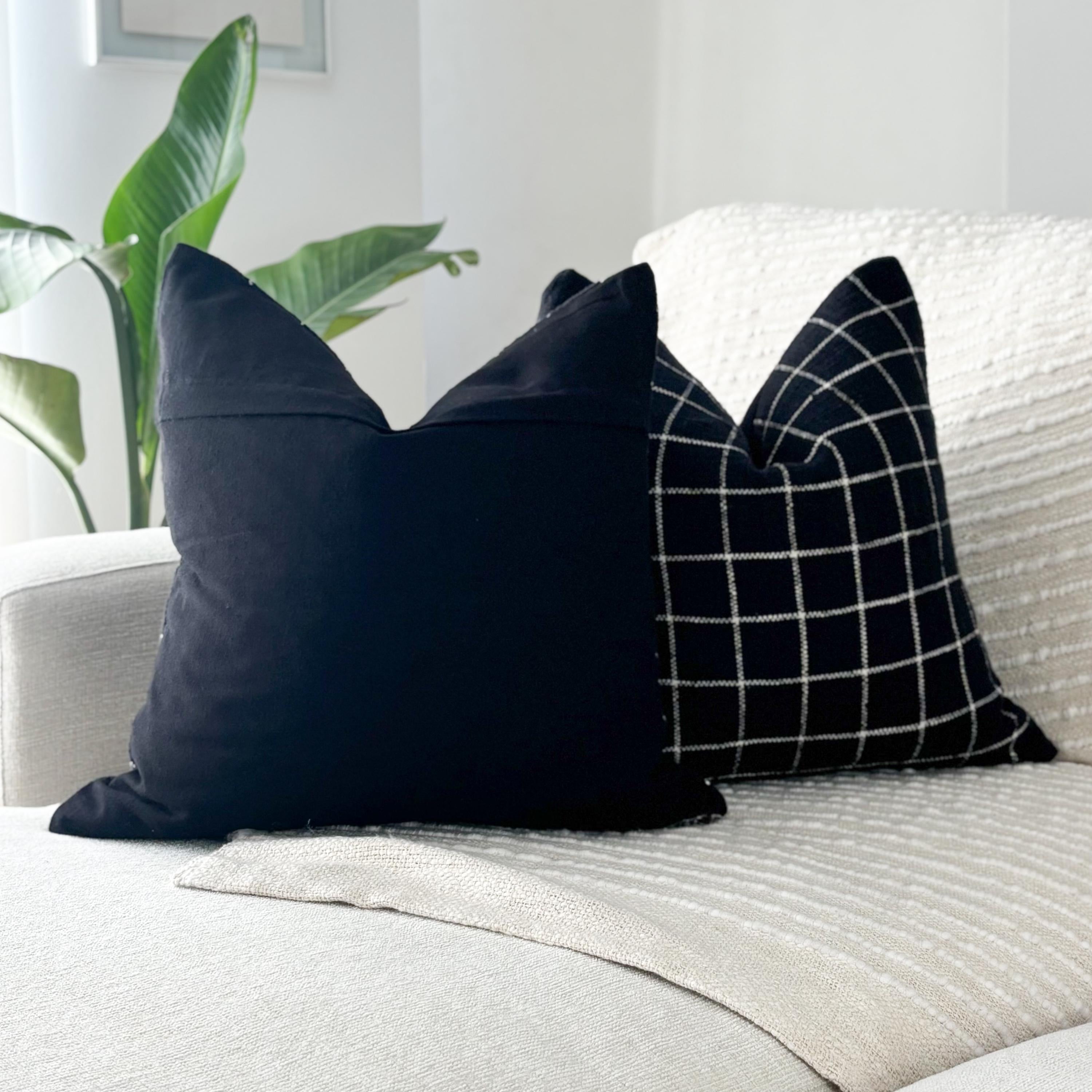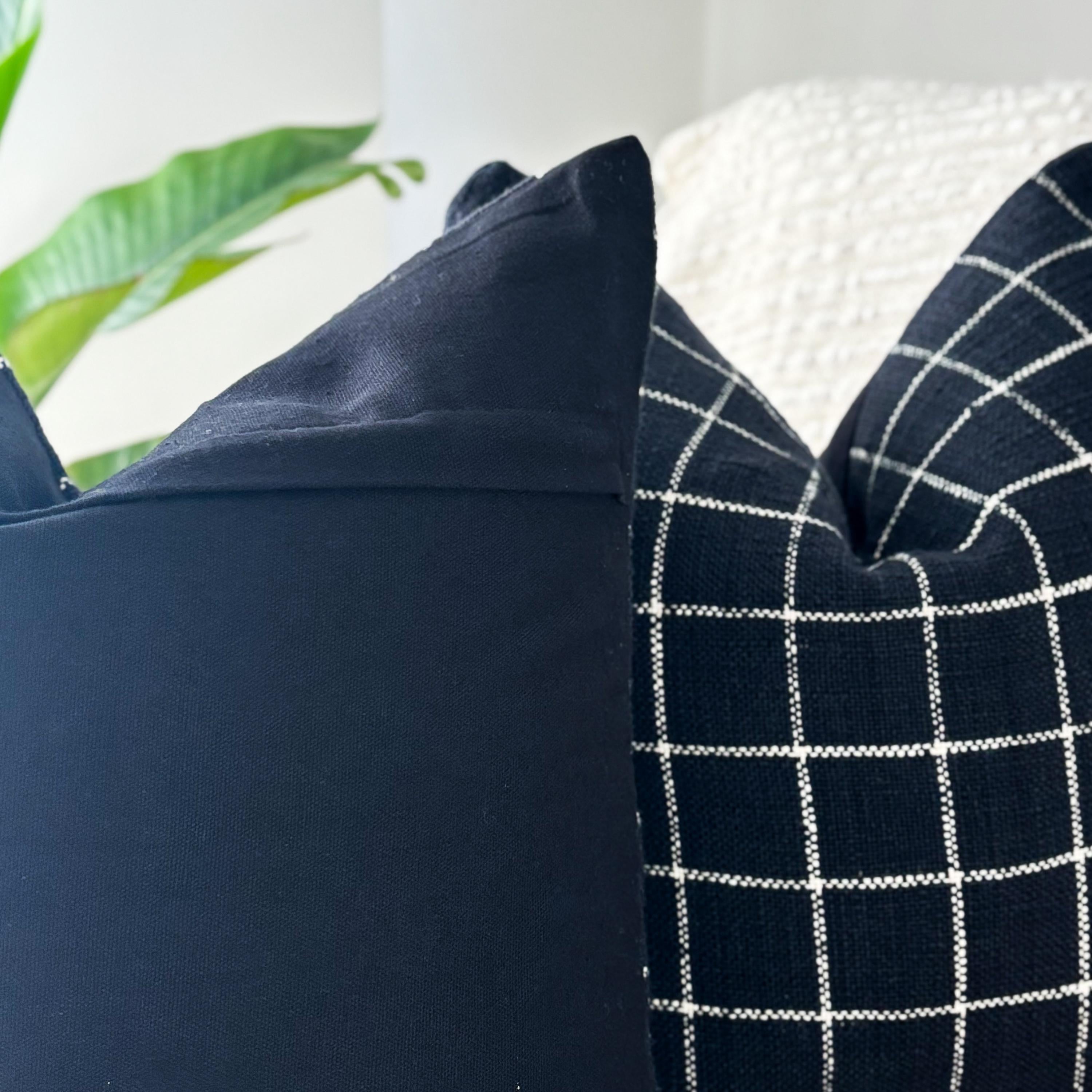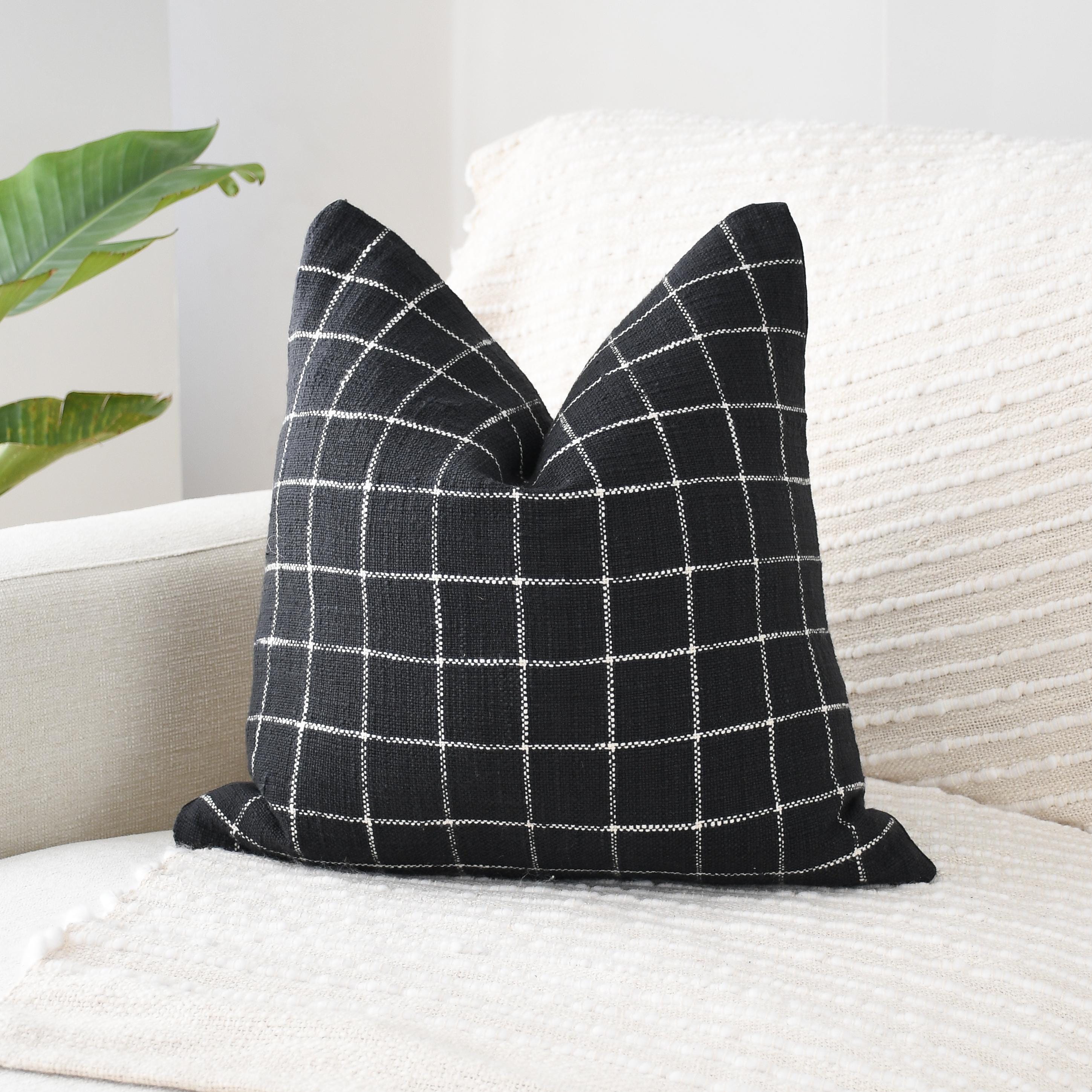 These beautiful pillows use hand woven fabrics imported from India. (Pillow Insert NOT included). Bring clean lines and elevated contrast into your home with our Black Checkered Modern Accent Pillow Cover. Designed in an 18x18 size, this pillow features a bold black-and-white stitched grid pattern on the front, paired with a smooth solid black canvas backing for a sleek, reversible finish.