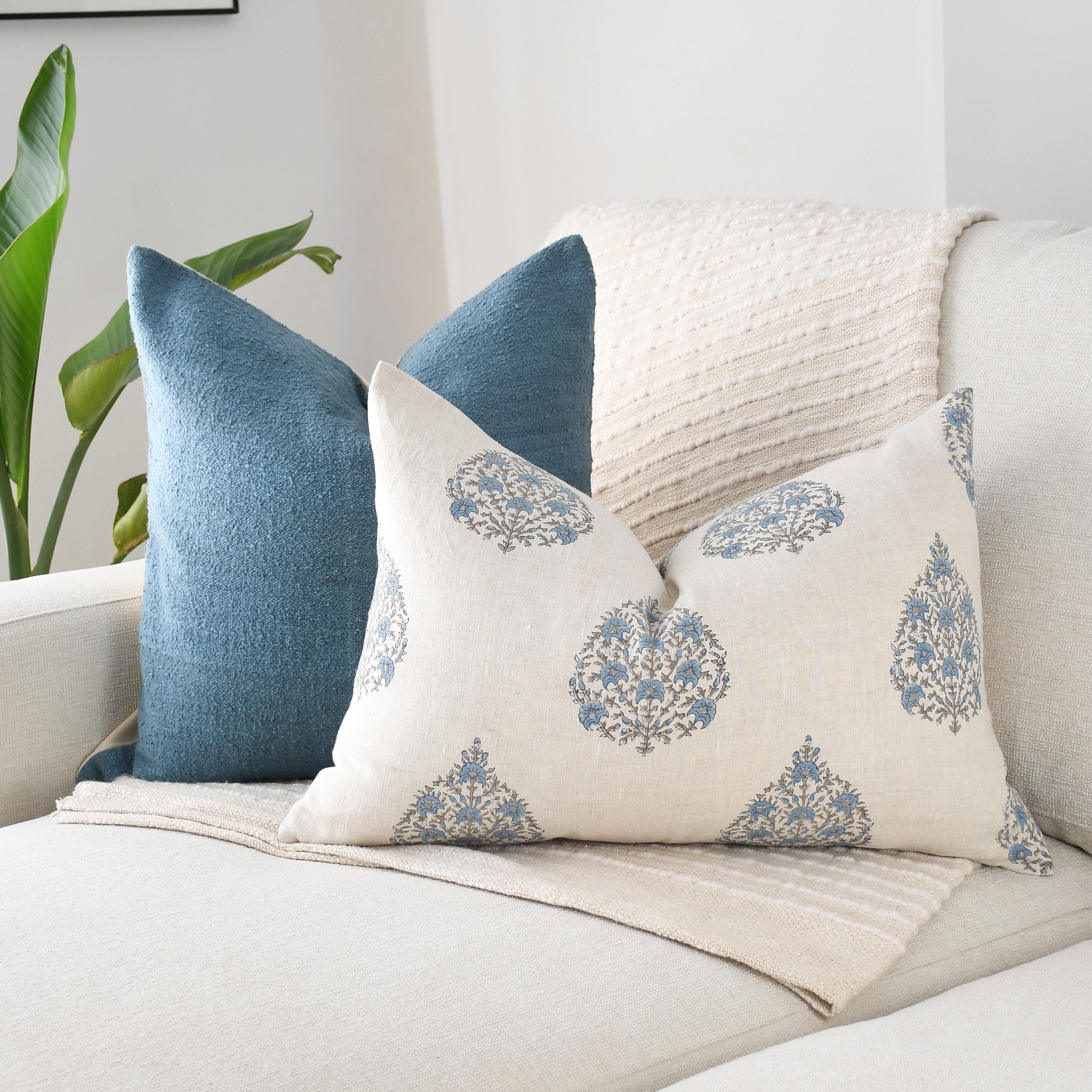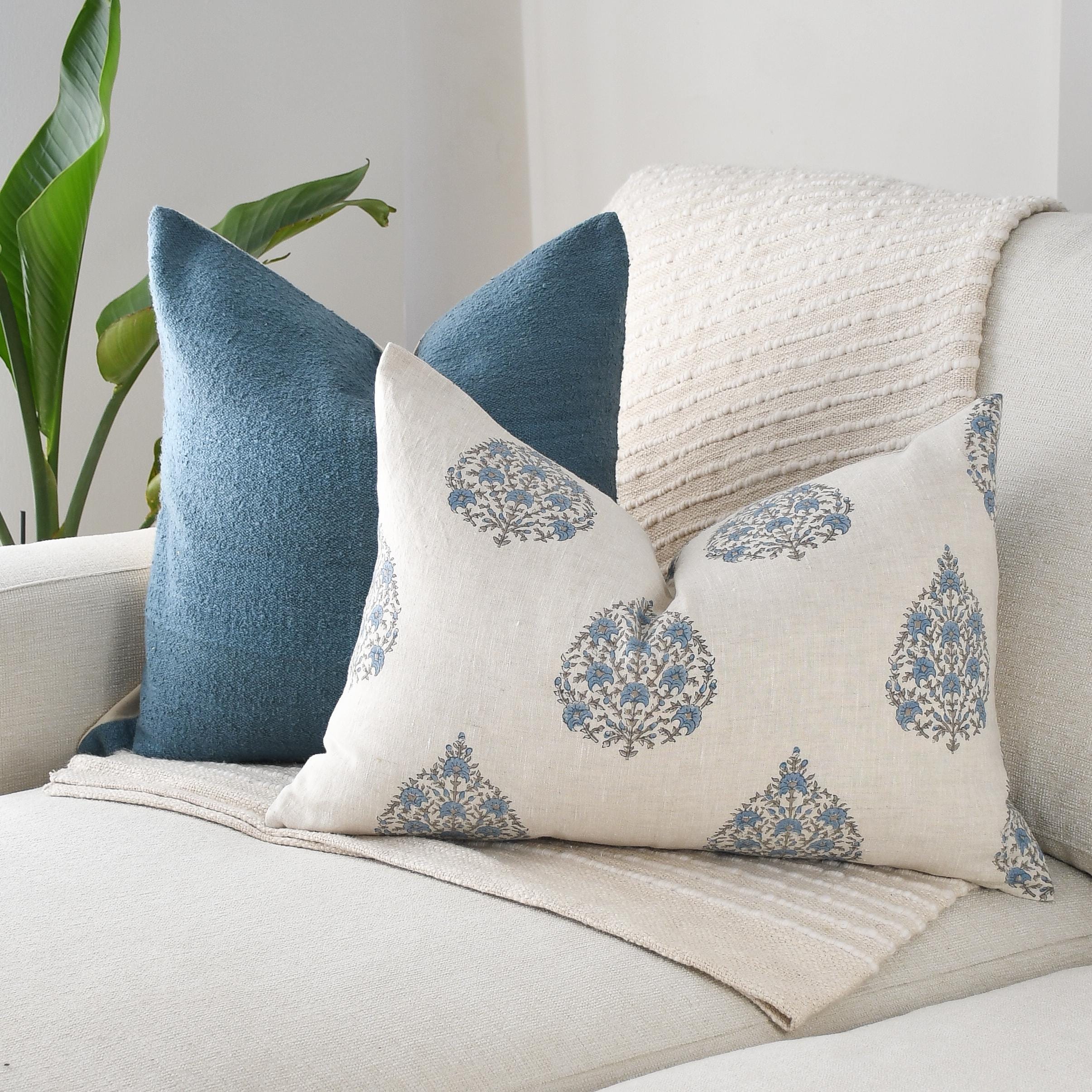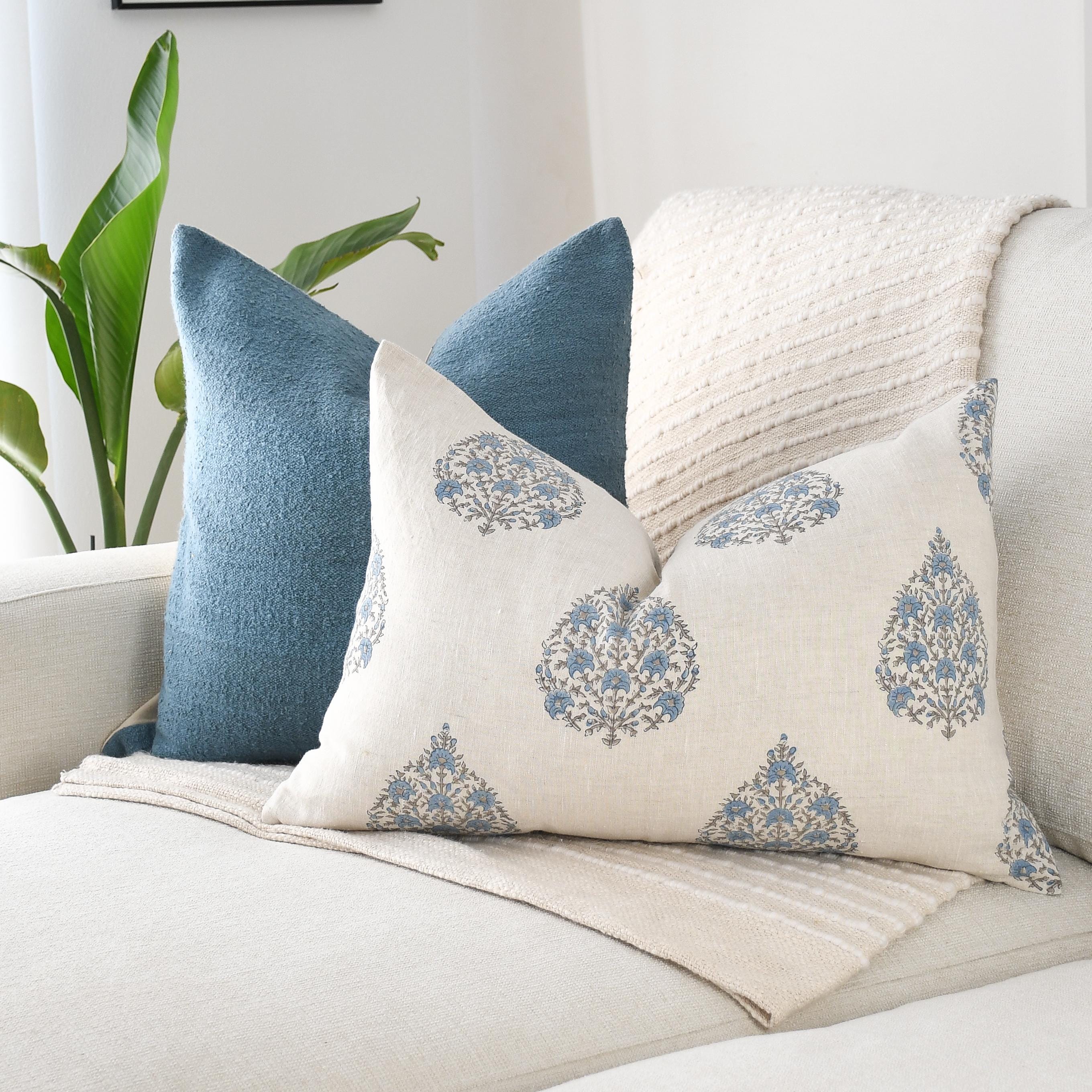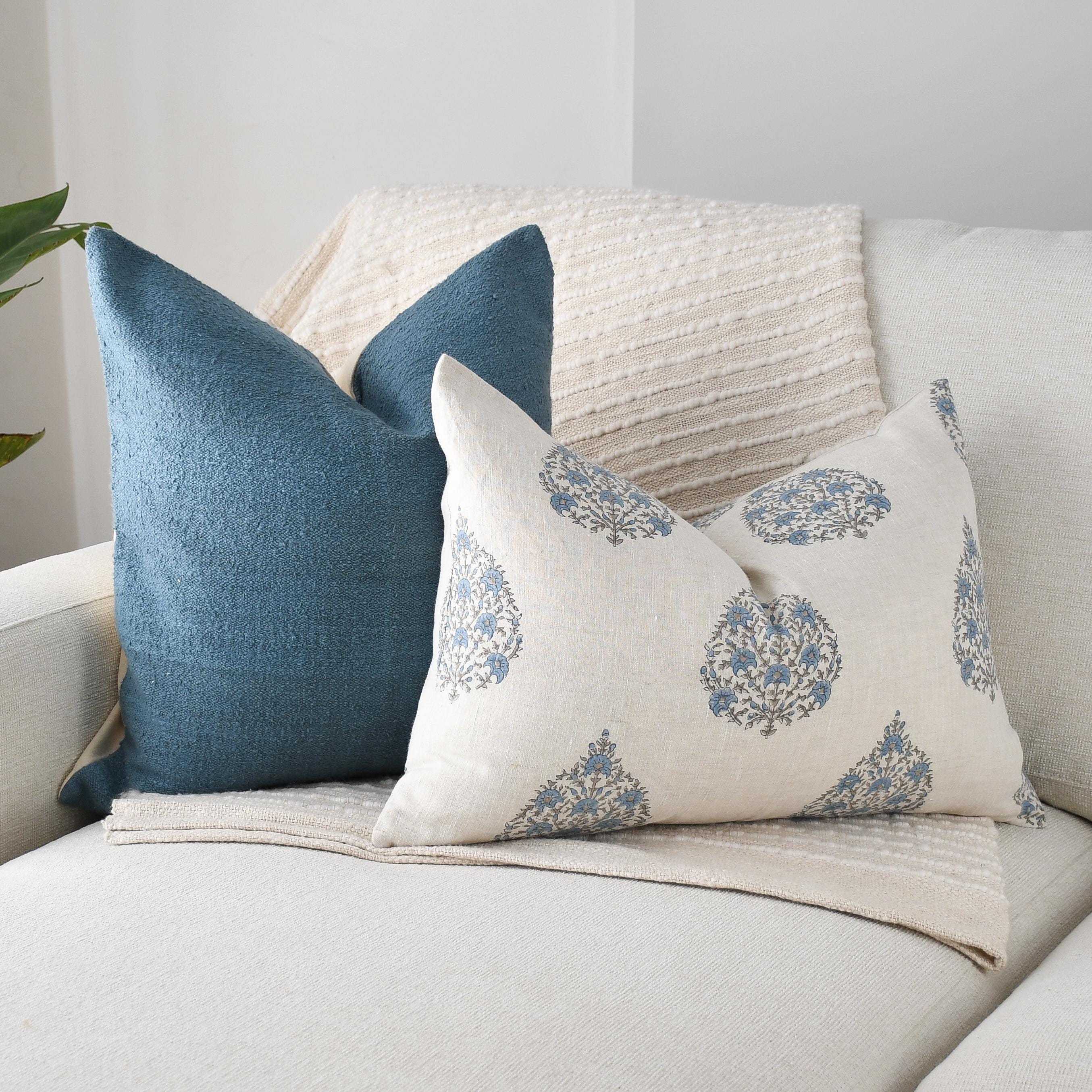 These cotton and linen pillows use hand woven fabrics imported from India (Pillow Insert NOT included). Bring a soft, calming elegance to your home with this Blue Block Print & Coastal Solid Pillow Duo. Thoughtfully curated for a serene yet elevated look, this set blends artisan detail with modern simplicity for effortless styling.