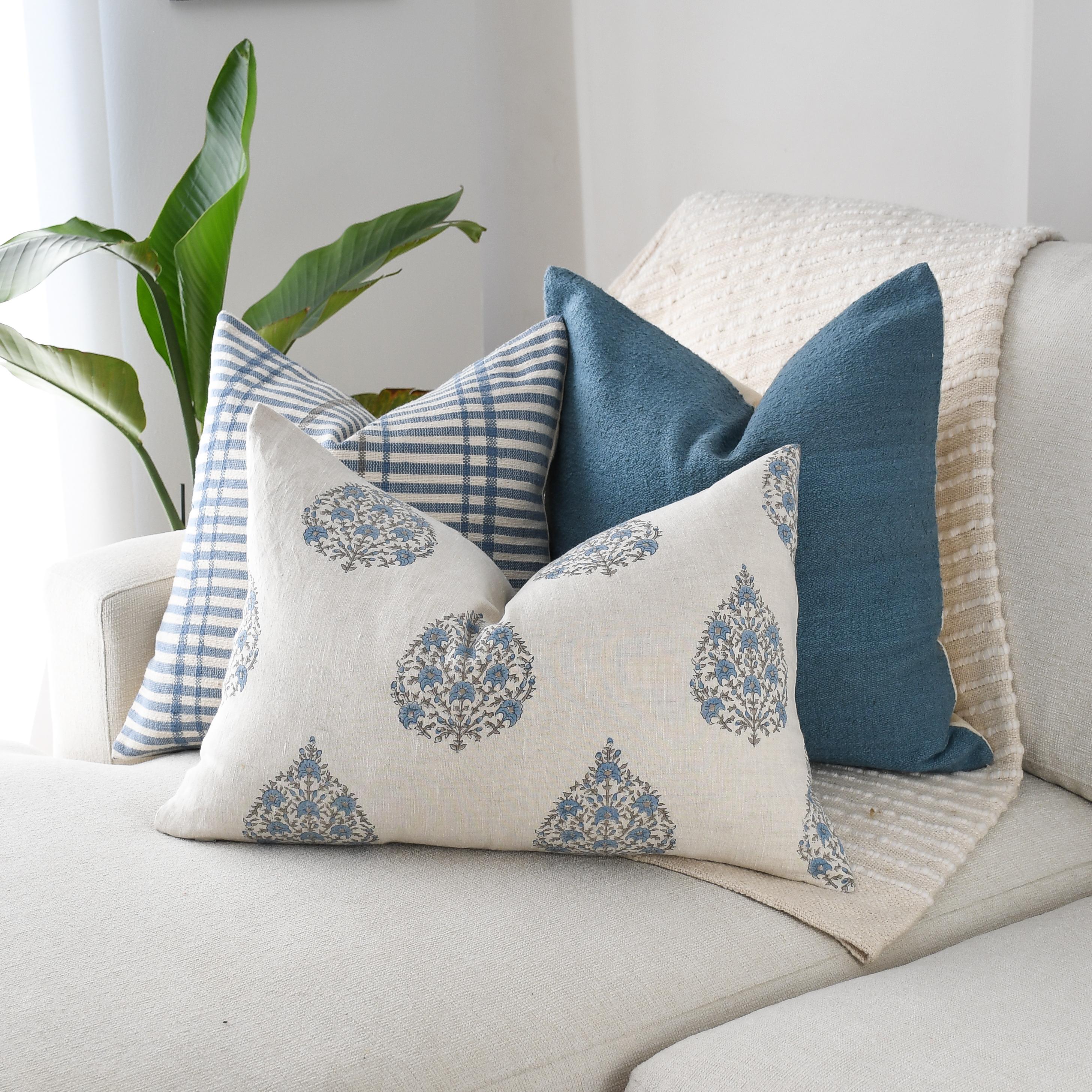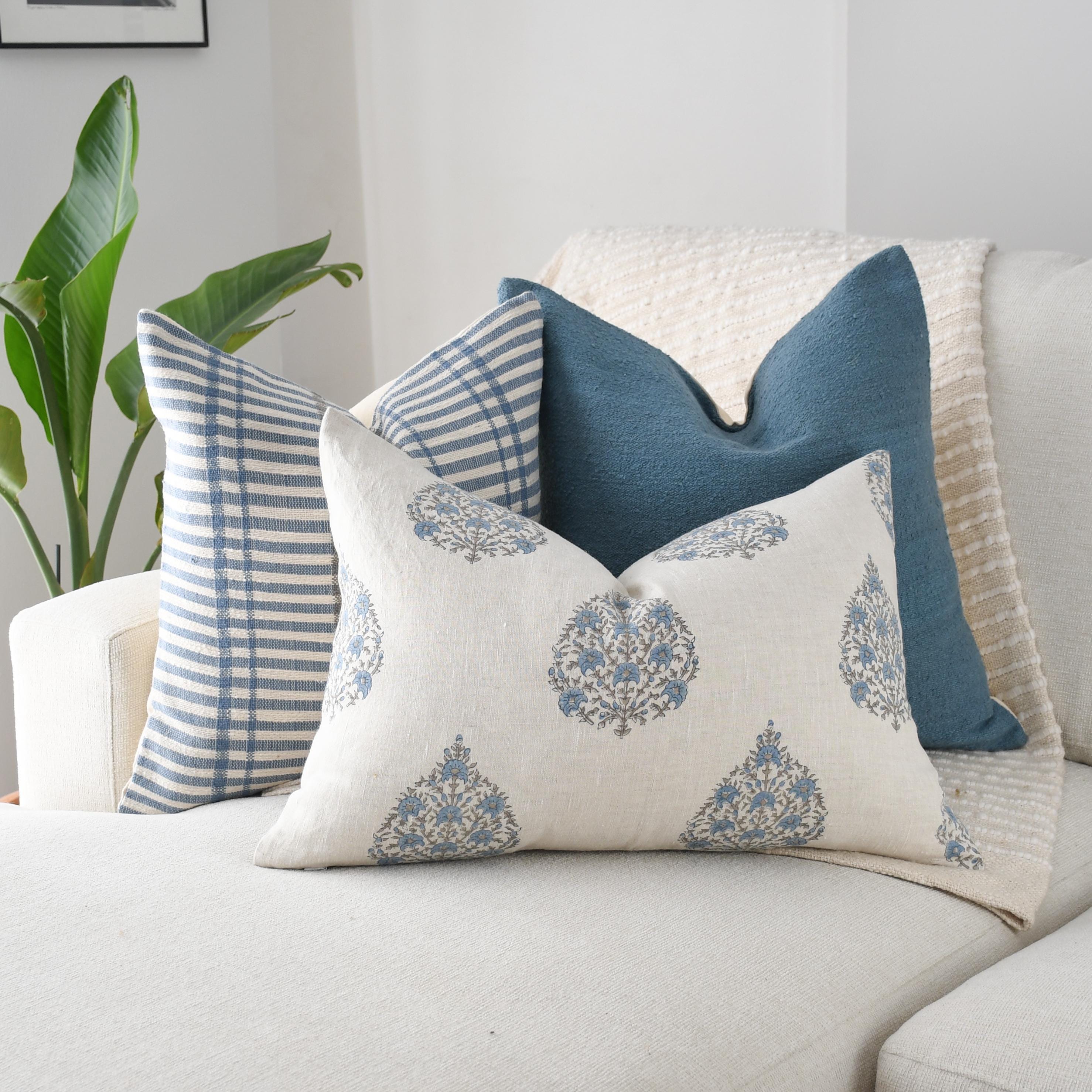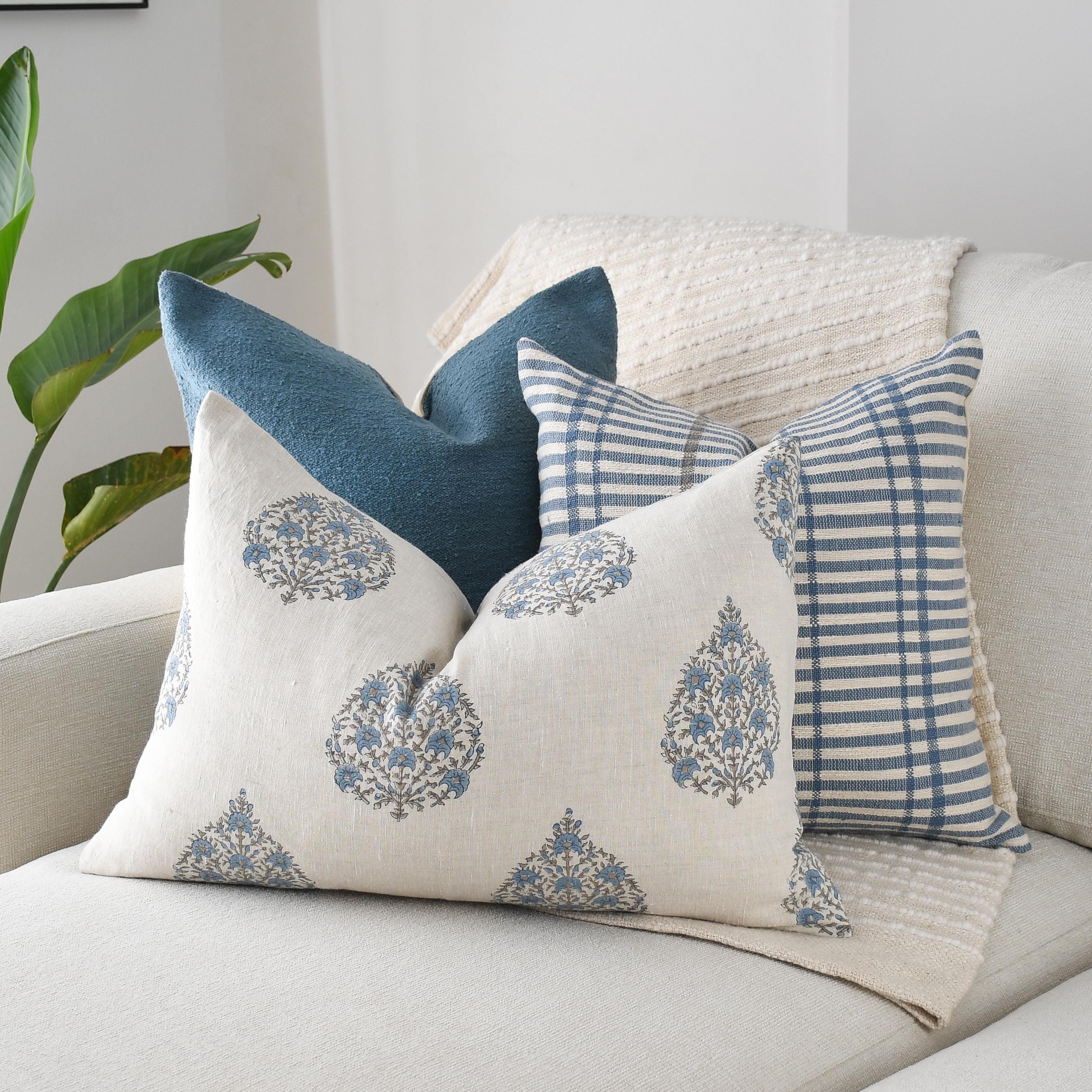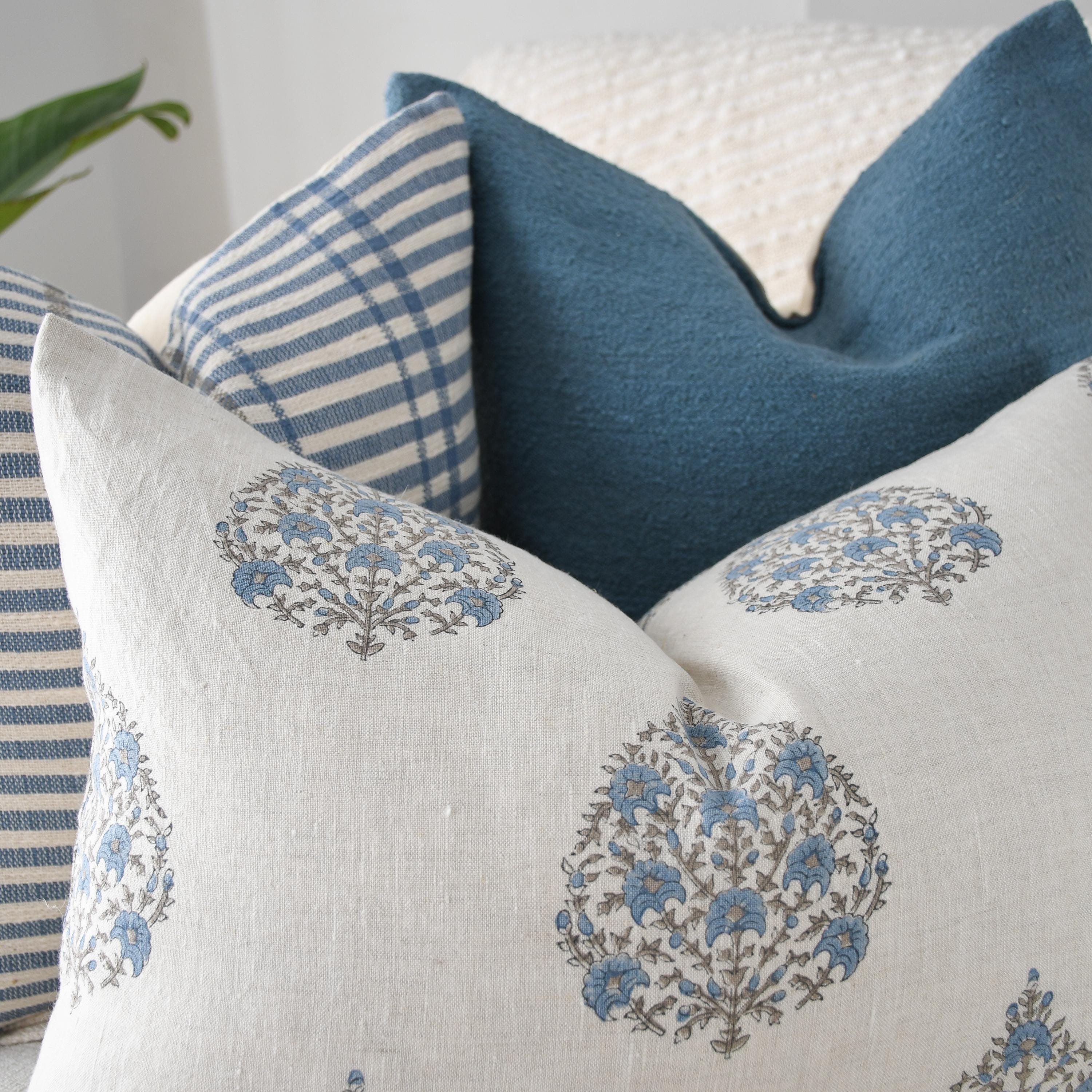 These cotton and linen pillows use hand woven fabrics imported from India (Pillow Insert NOT included). Bring a serene, coastal-inspired elegance to your home with this Blue Coastal Linen and Block Print Pillow Trio. Each pillow introduces its own texture, tone, and artistry, creating a layered look that feels both airy and thoughtfully curated.