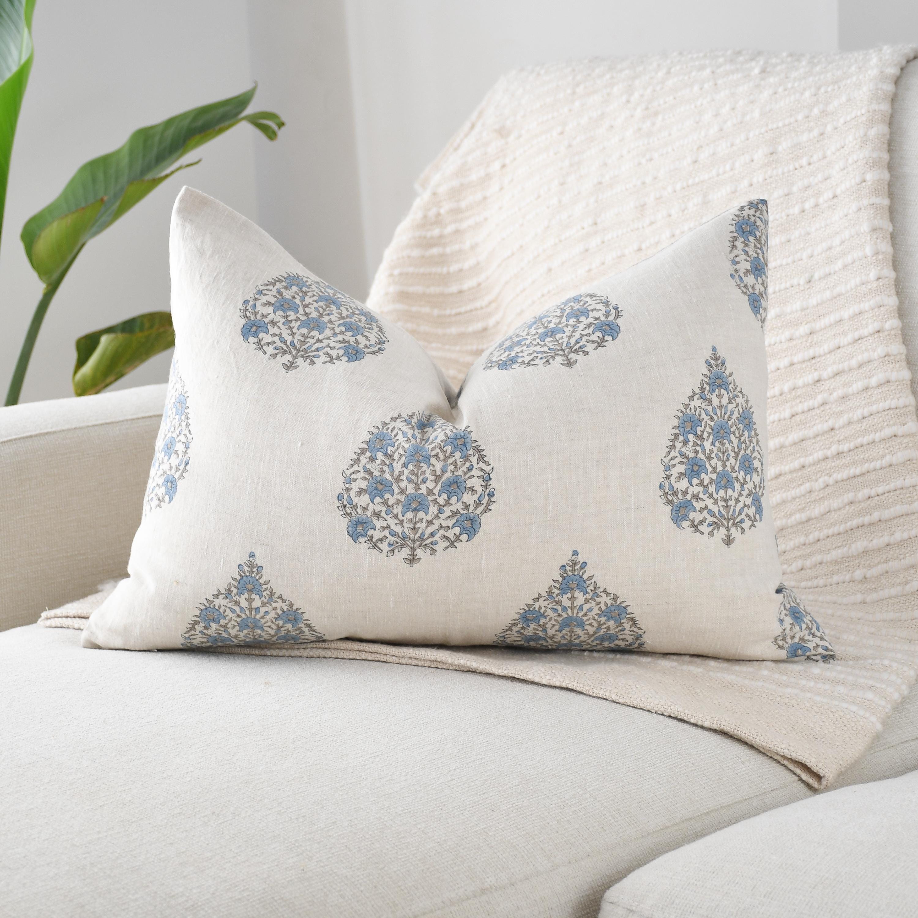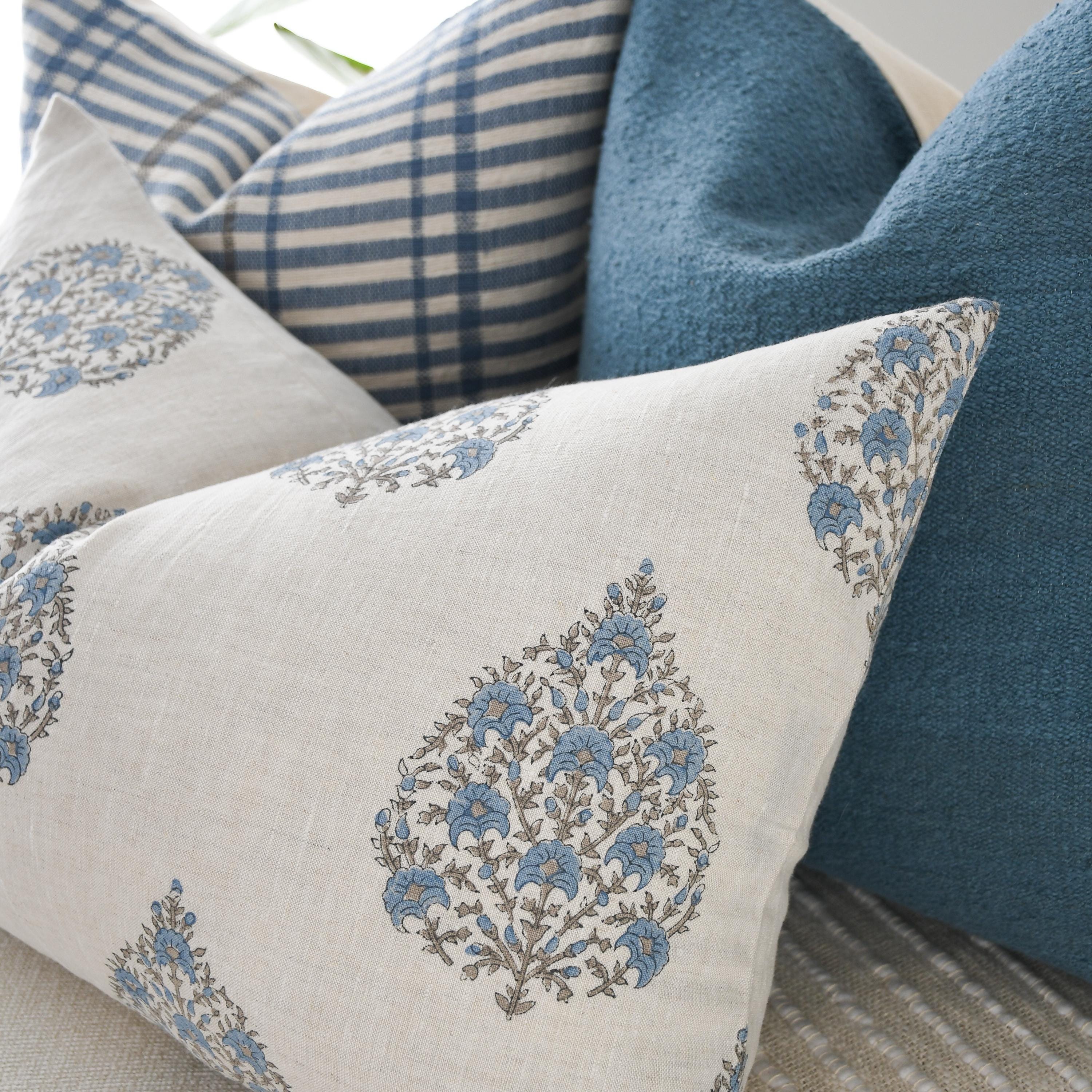 The linen floral block print lumbar is the centerpiece of the set, featuring a soft ivory base adorned with intricate blue botanical motifs. The double-sided linen texture adds a natural, handcrafted feel that instantly elevates any space.