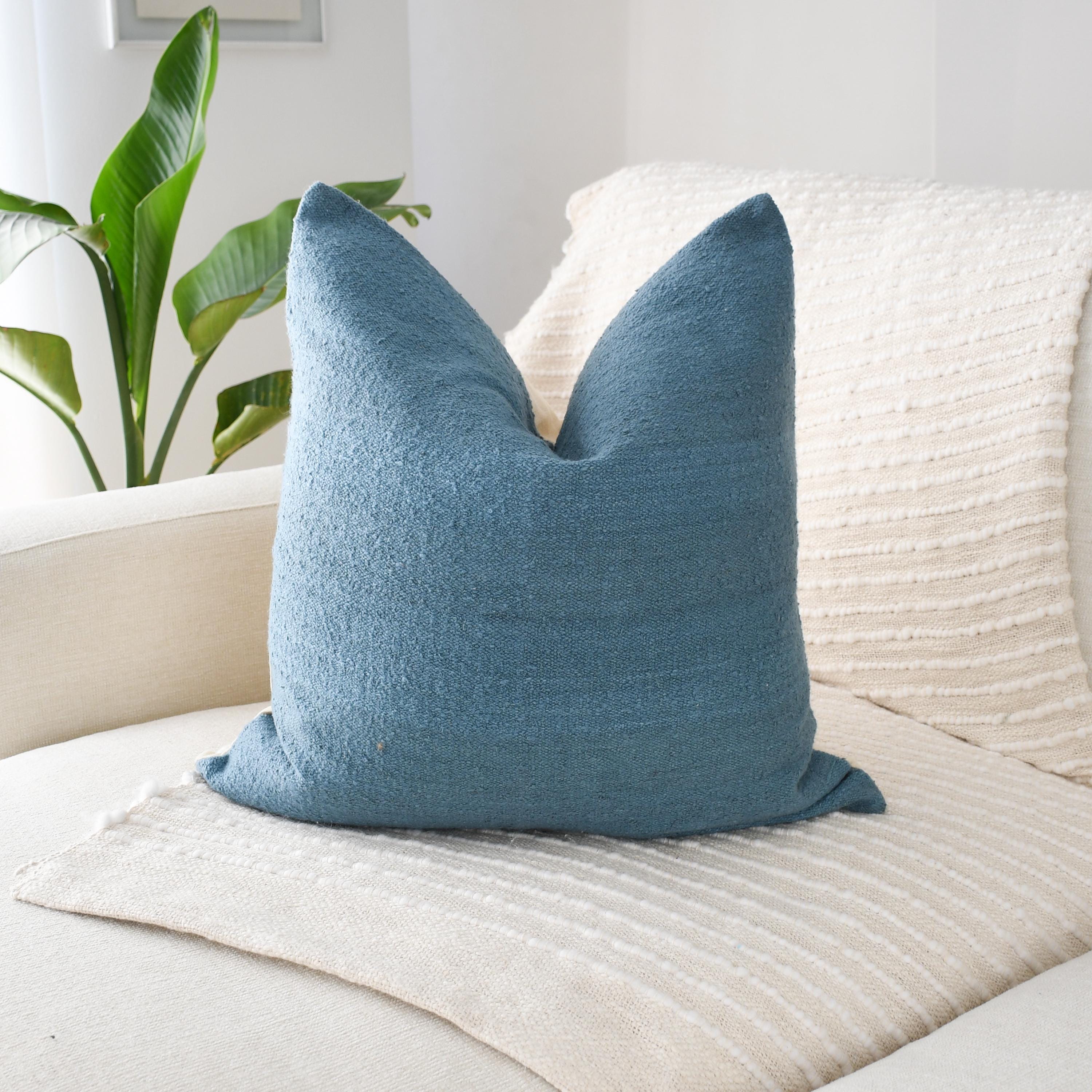 Behind it, the coastal blue cotton pillow brings a refreshing pop of color reminiscent of ocean hues. Its soft woven texture and natural canvas backing give it a relaxed yet elevated presence—perfect for grounding the palette with rich dimension.
