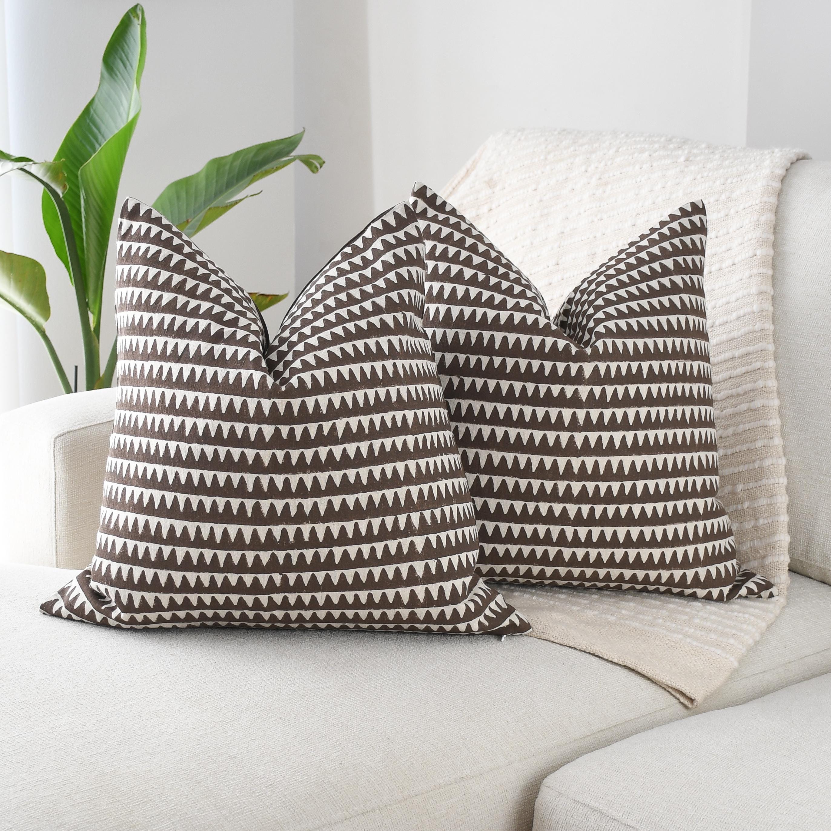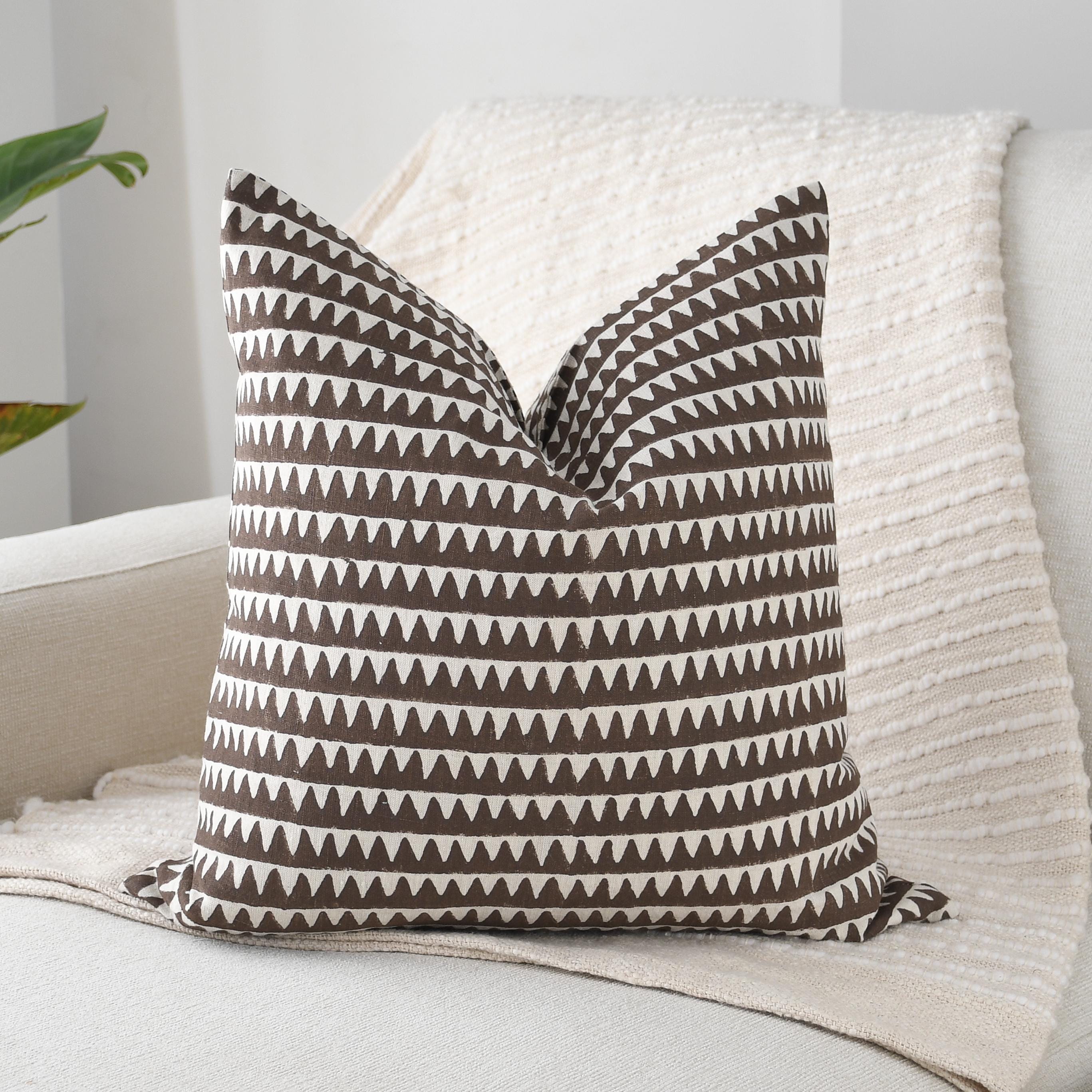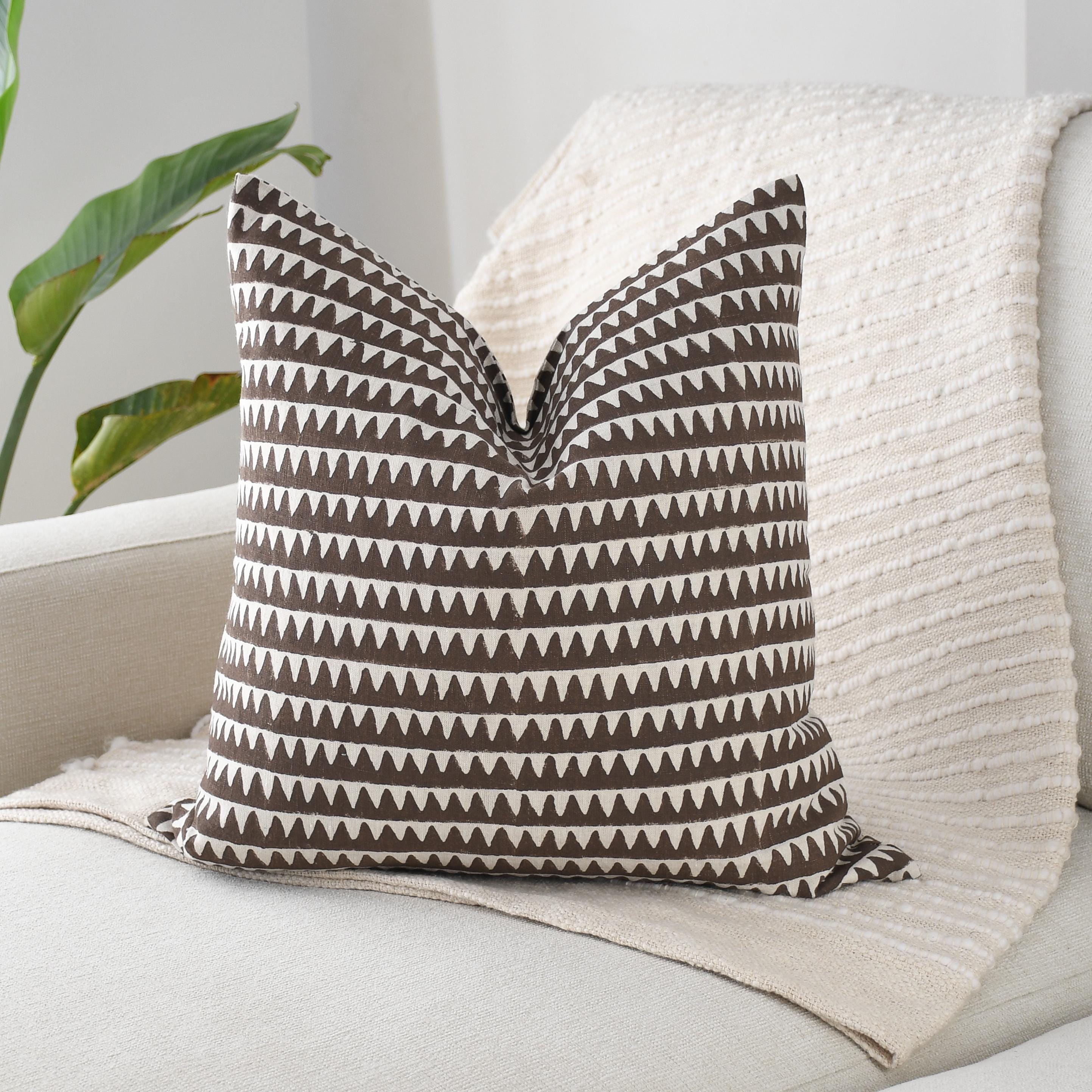 These beautiful pillows use hand woven fabrics imported from India. (Pillow Insert NOT included) Bold, modern, and effortlessly stylish, our Brown Geometric Designer Pillow Cover adds striking visual rhythm to any space. The double-sided 20x20 cover features a rich chocolate-brown base accented by crisp ivory triangular motifs, creating a clean, repeating pattern that feels both contemporary and timeless.