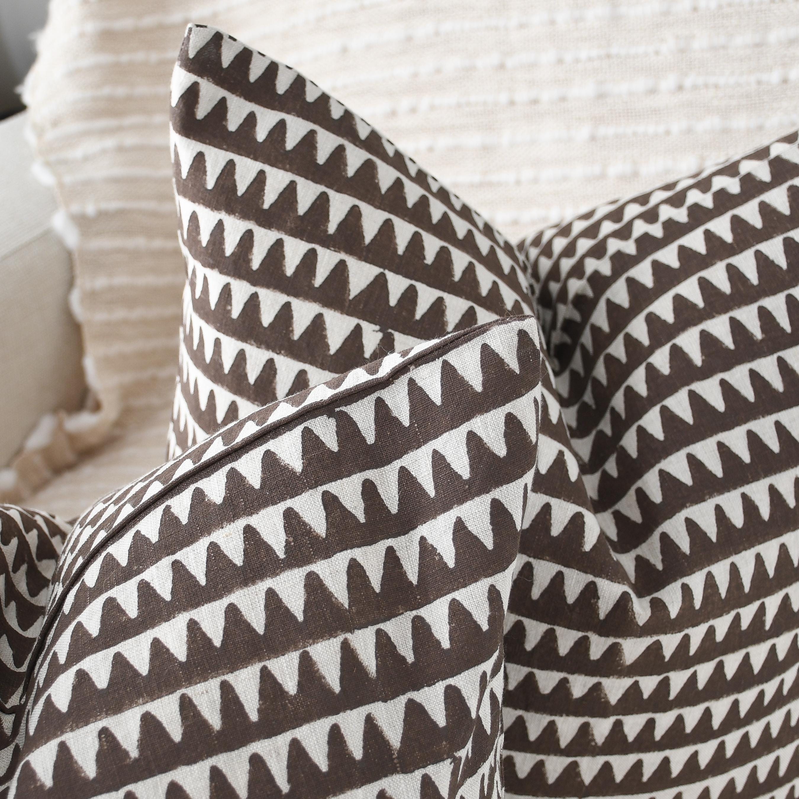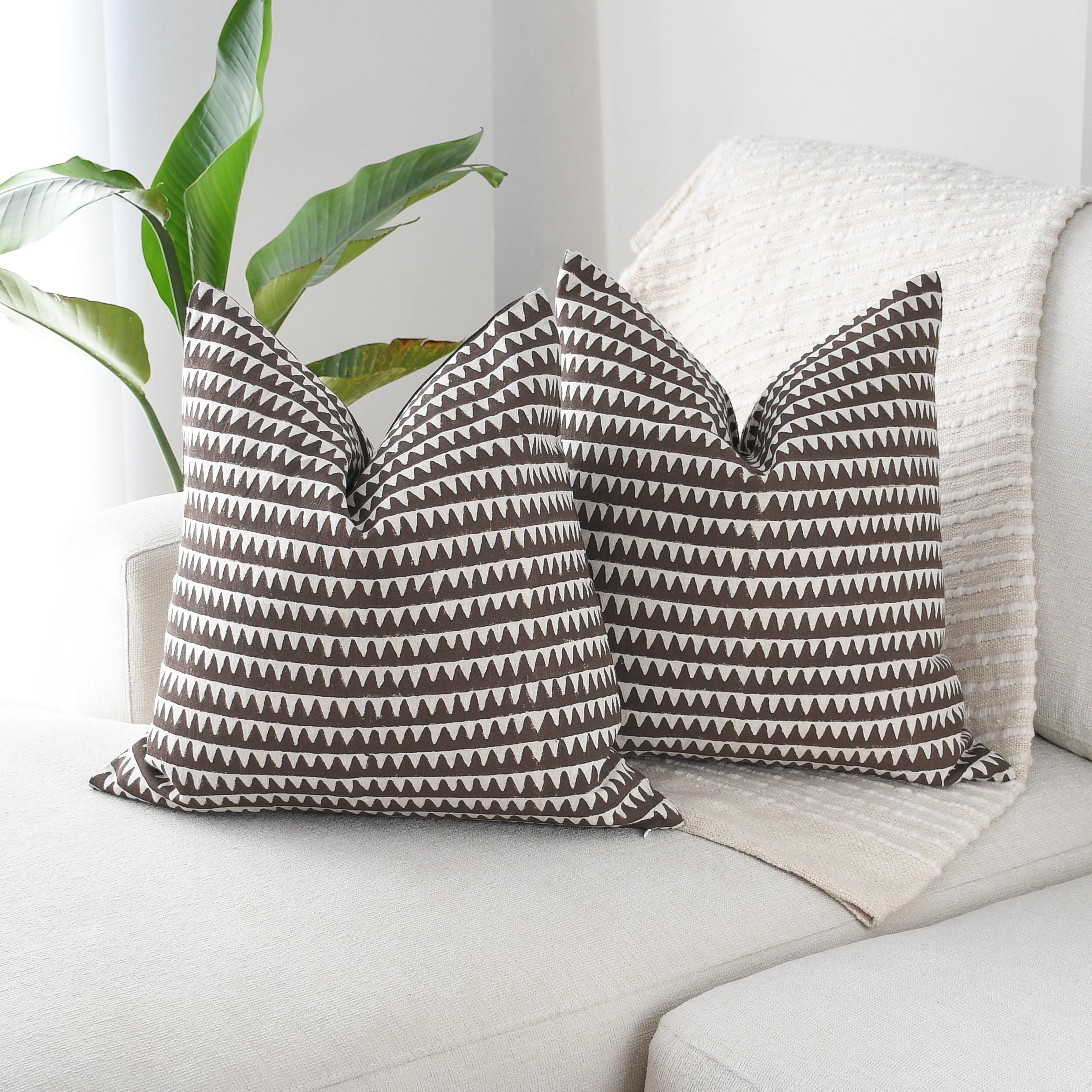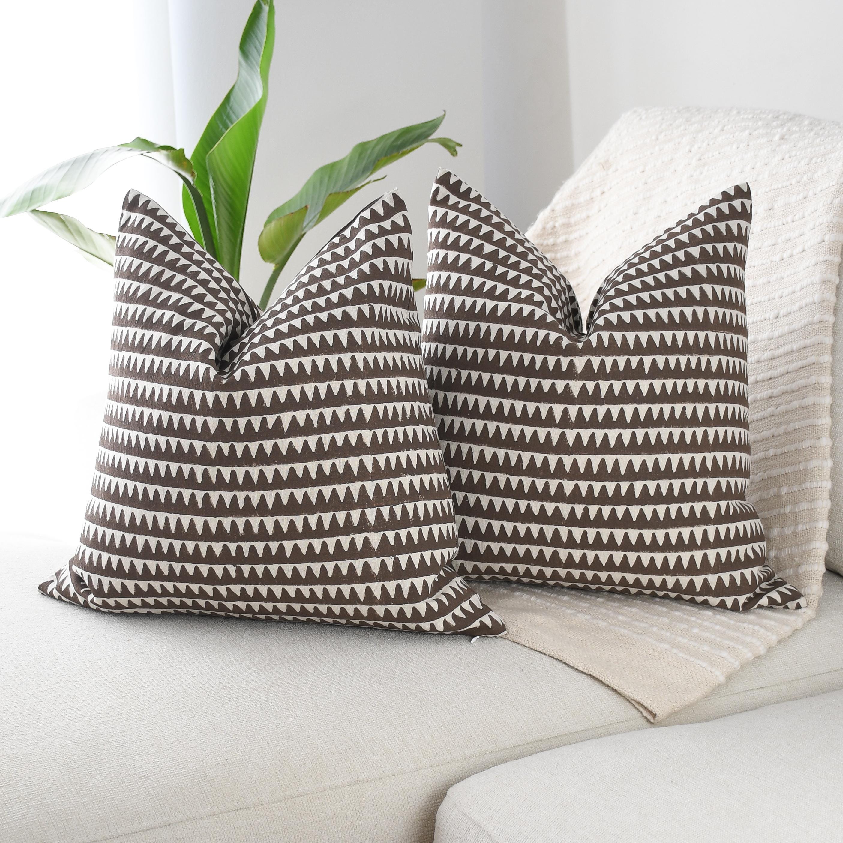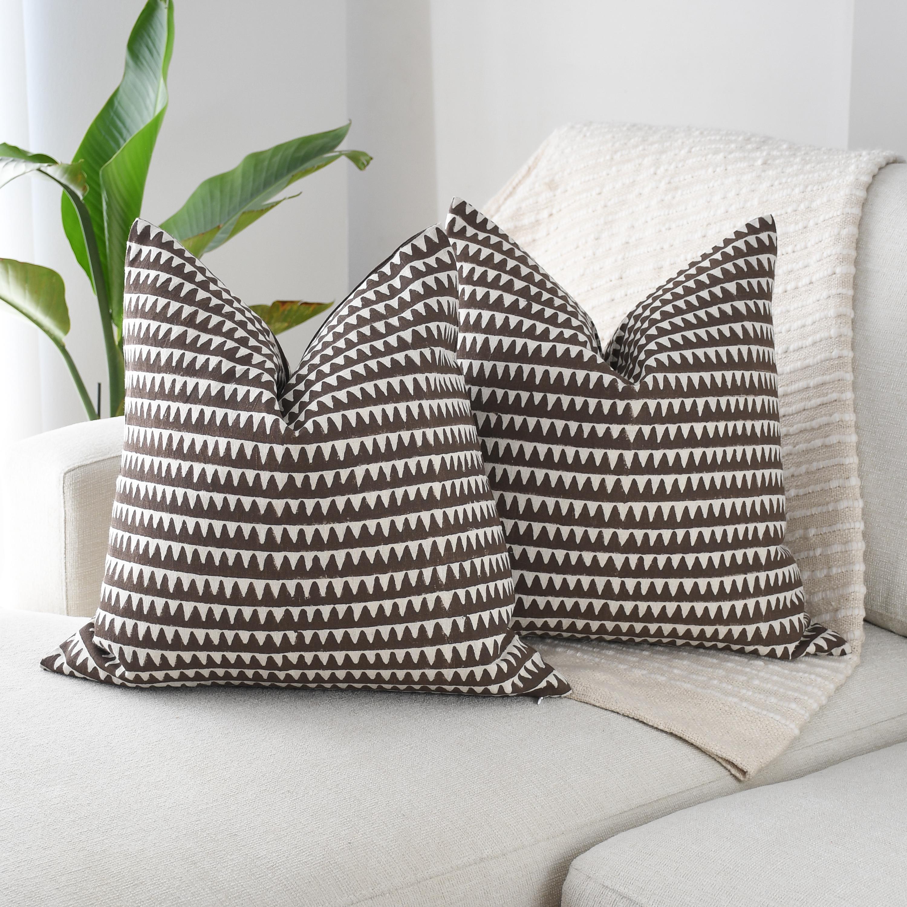 These beautiful pillows use hand woven fabrics imported from India. (Pillow Insert NOT included) Bold, modern, and effortlessly stylish, our Brown Geometric Designer Pillow Cover adds striking visual rhythm to any space. The double-sided 20x20 cover features a rich chocolate-brown base accented by crisp ivory triangular motifs, creating a clean, repeating pattern that feels both contemporary and timeless.
