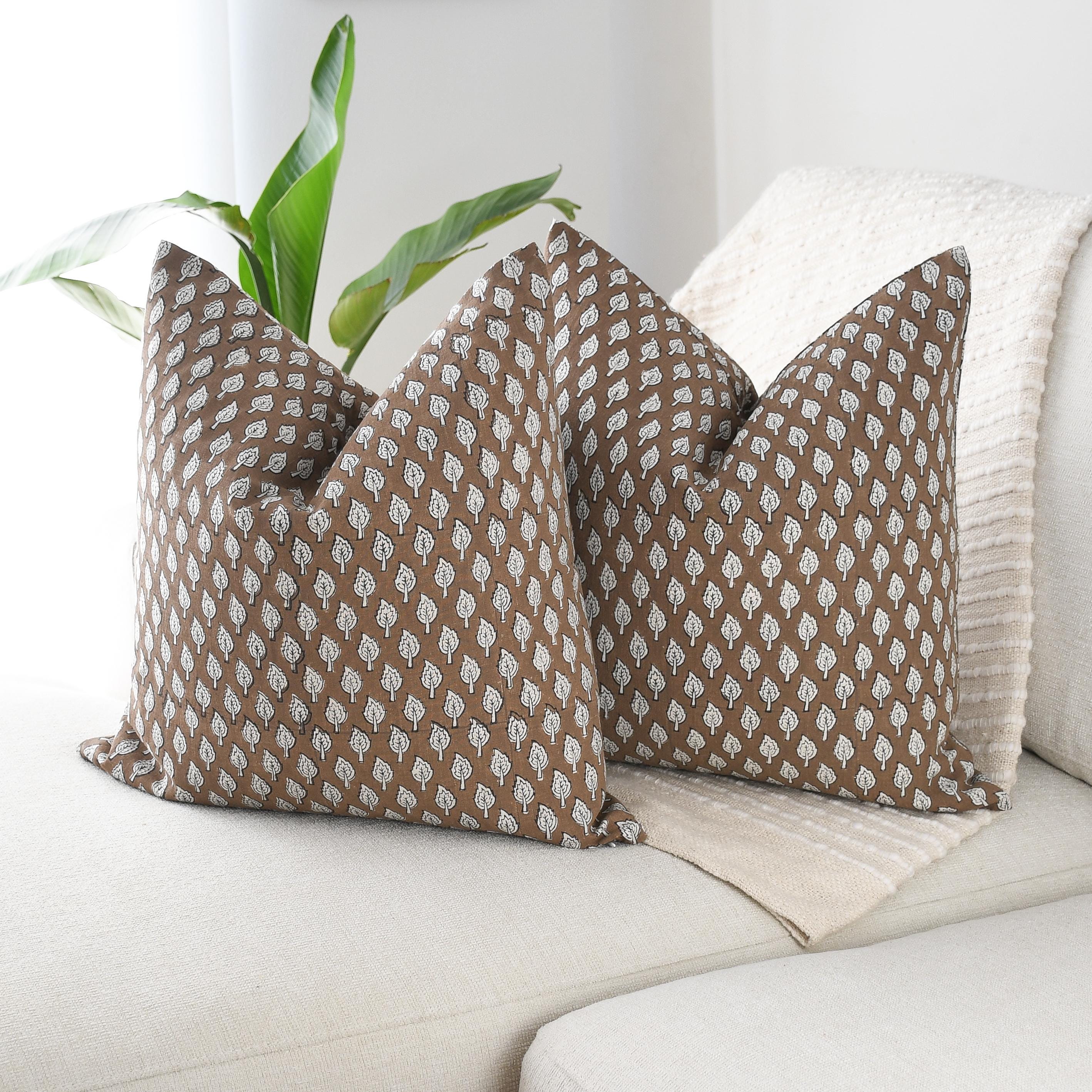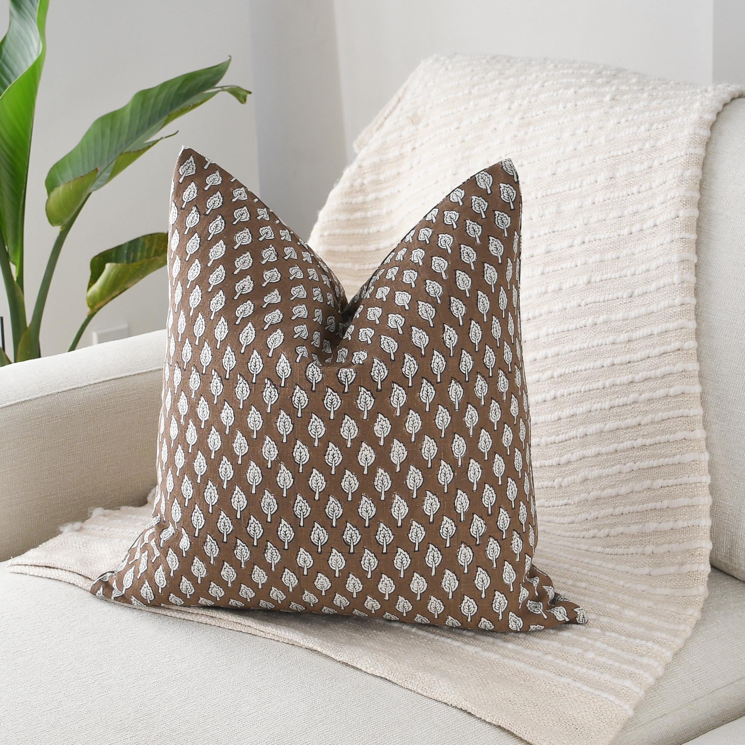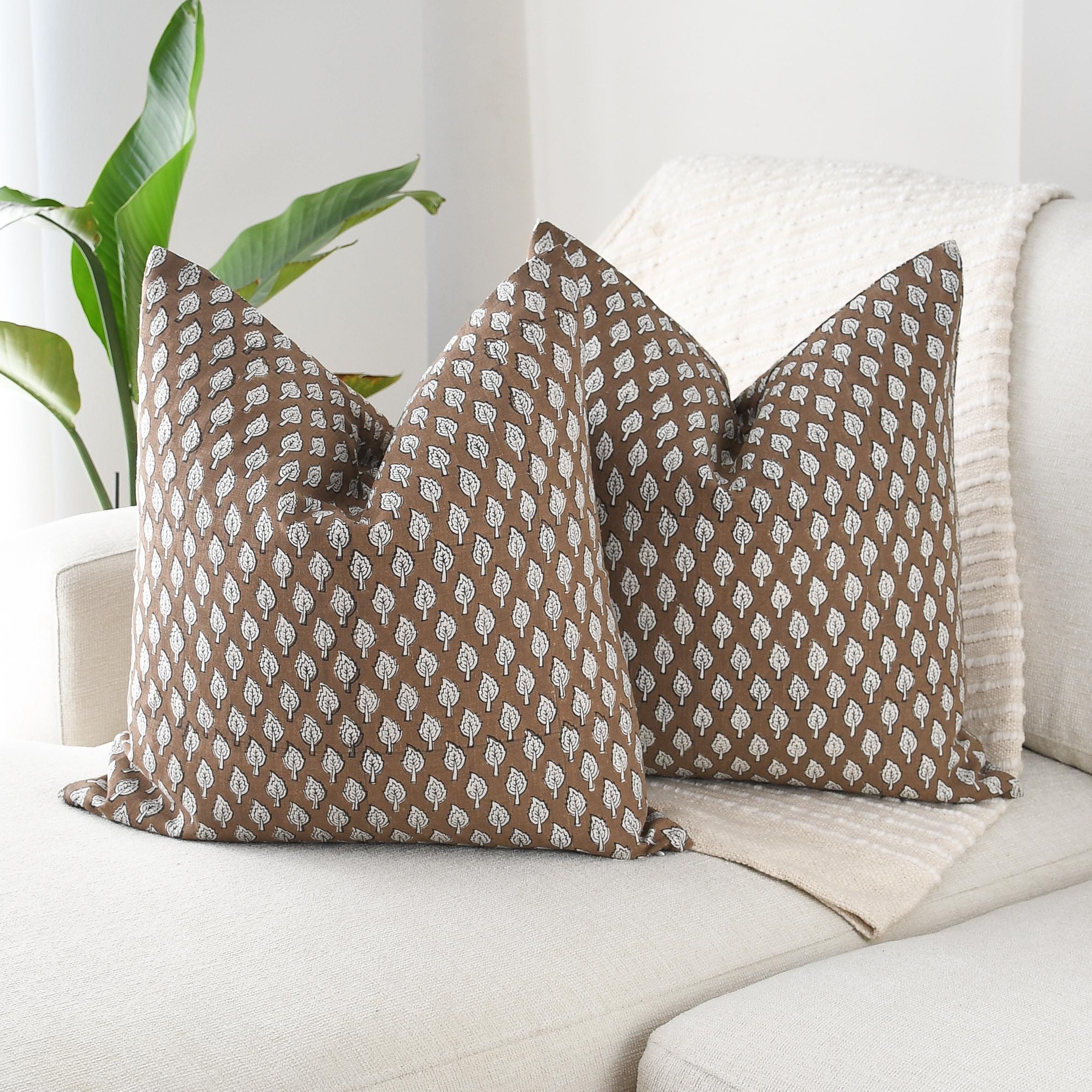 These beautiful pillows use hand woven fabrics imported from India. (Pillow Insert NOT included) Create an inviting, artisan-inspired atmosphere with our Brown Leaf Block Print Pillow Cover, a 20x20 double-sided design that blends handcrafted charm with modern warmth. The pillow features a repeat leaf motif in soft ivory against a rich cocoa-brown background, offering a gentle contrast that feels earthy, organic, and refined.