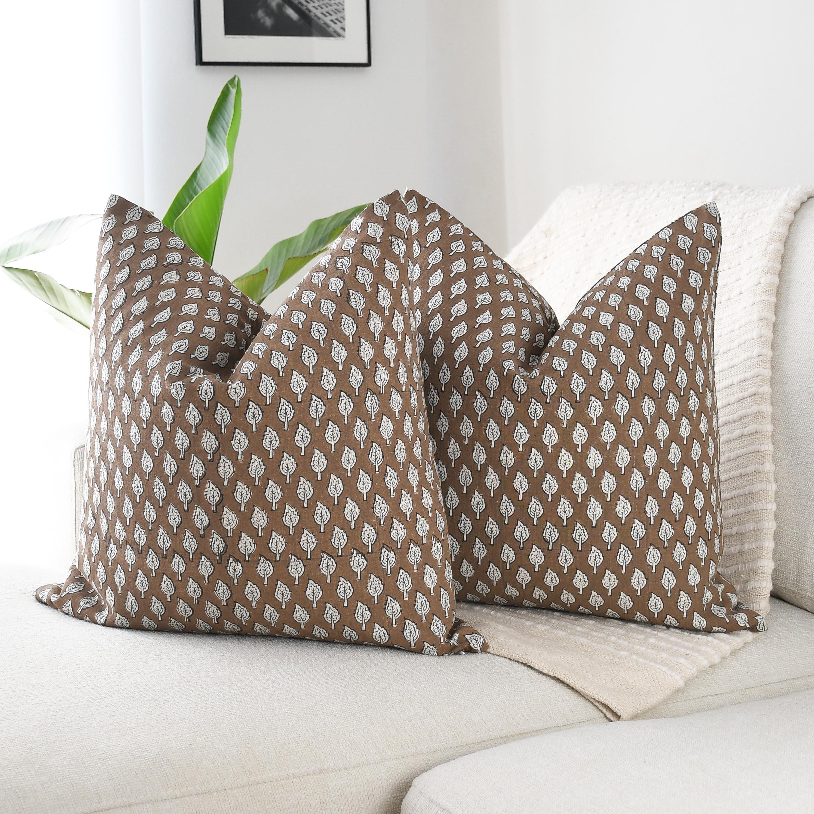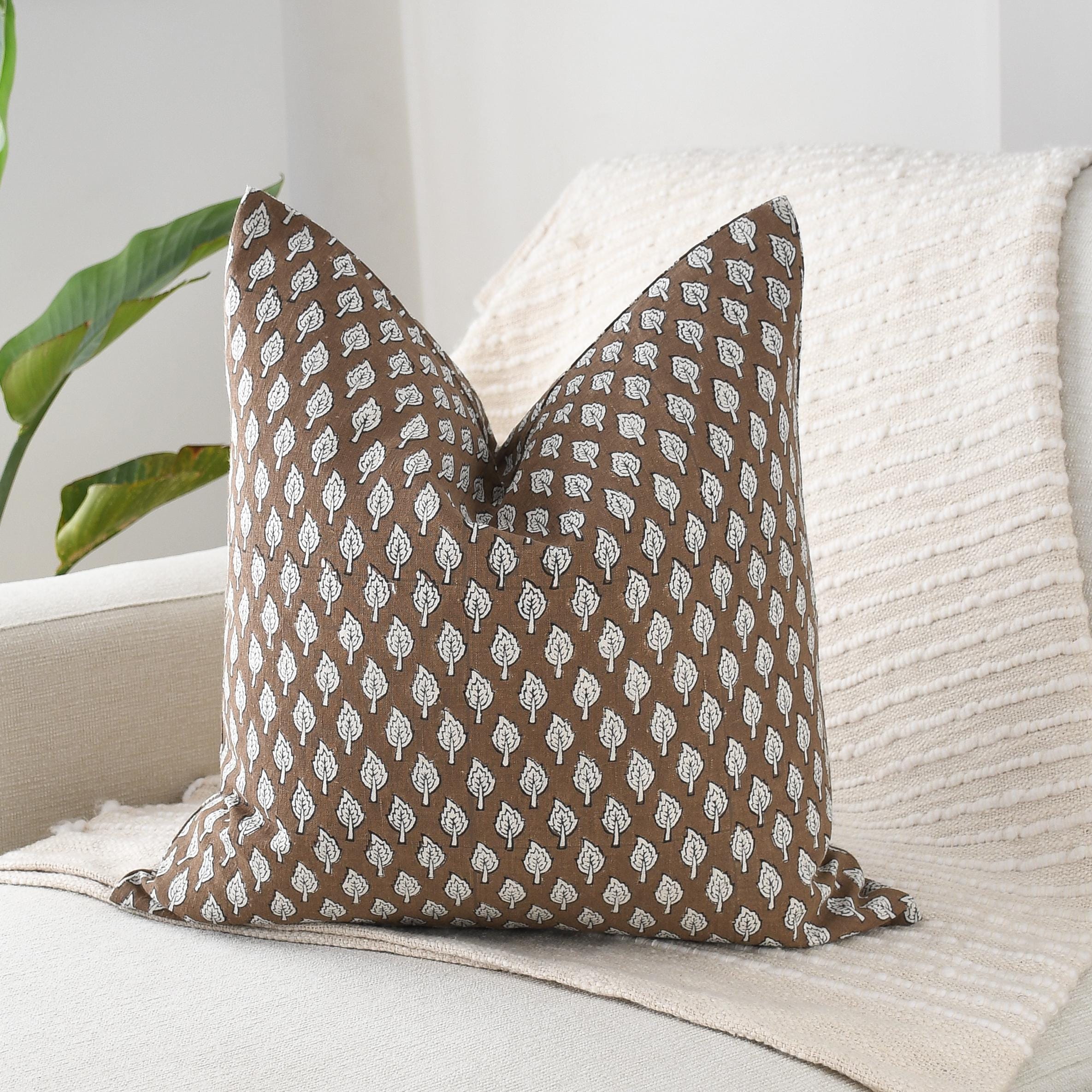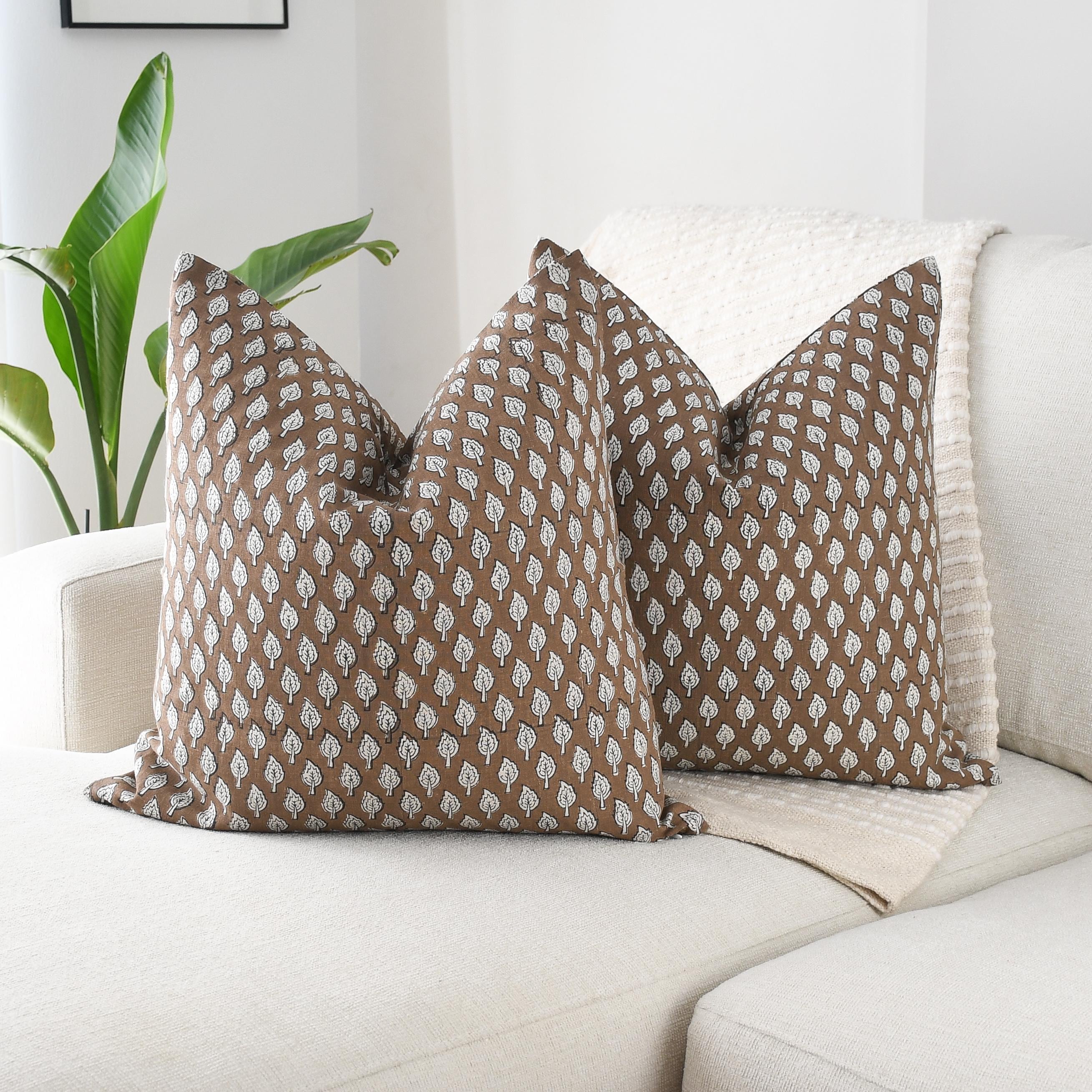These beautiful pillows use hand woven fabrics imported from India. (Pillow Insert NOT included) Create an inviting, artisan-inspired atmosphere with our Brown Leaf Block Print Pillow Cover, a 20x20 double-sided design that blends handcrafted charm with modern warmth. The pillow features a repeat leaf motif in soft ivory against a rich cocoa-brown background, offering a gentle contrast that feels earthy, organic, and refined.