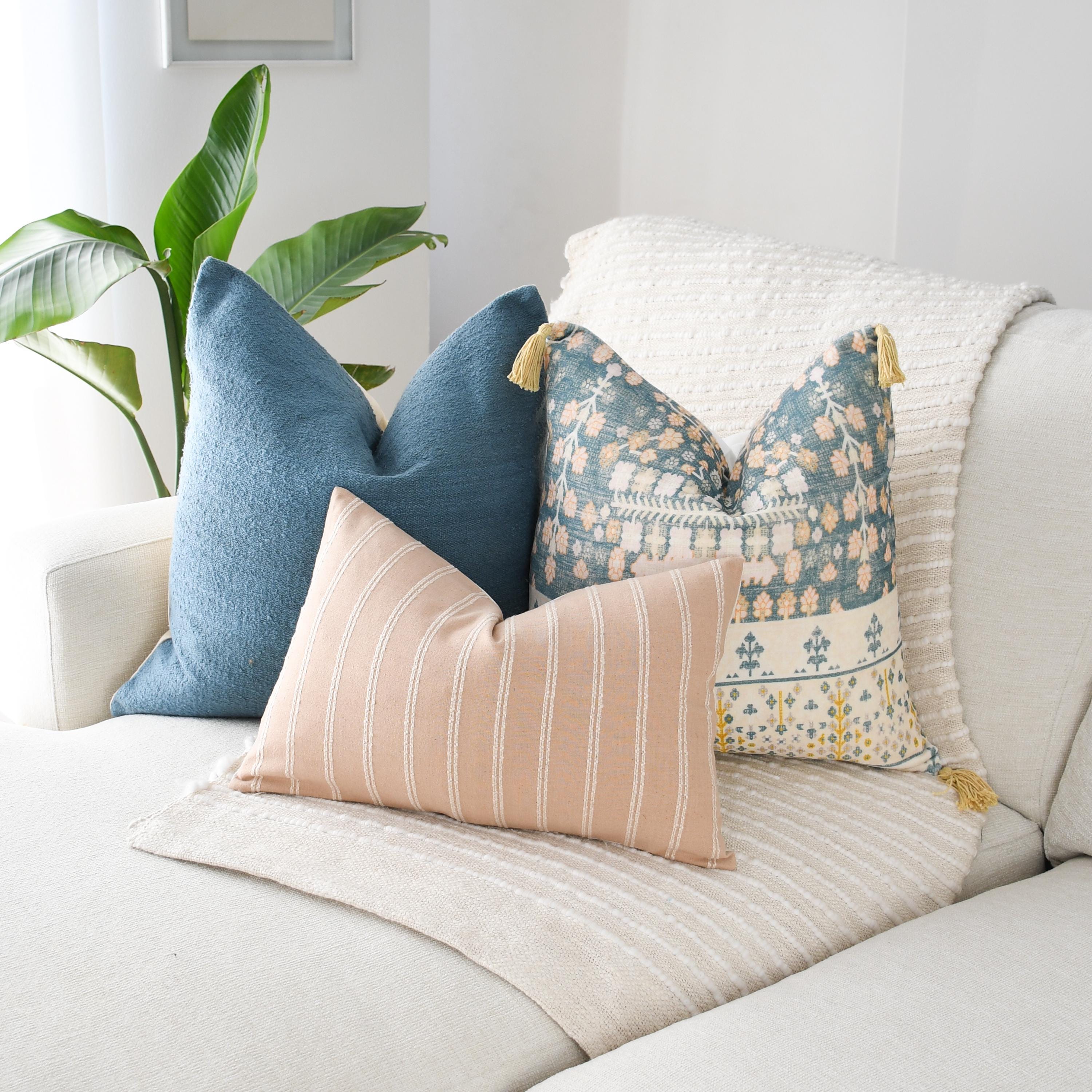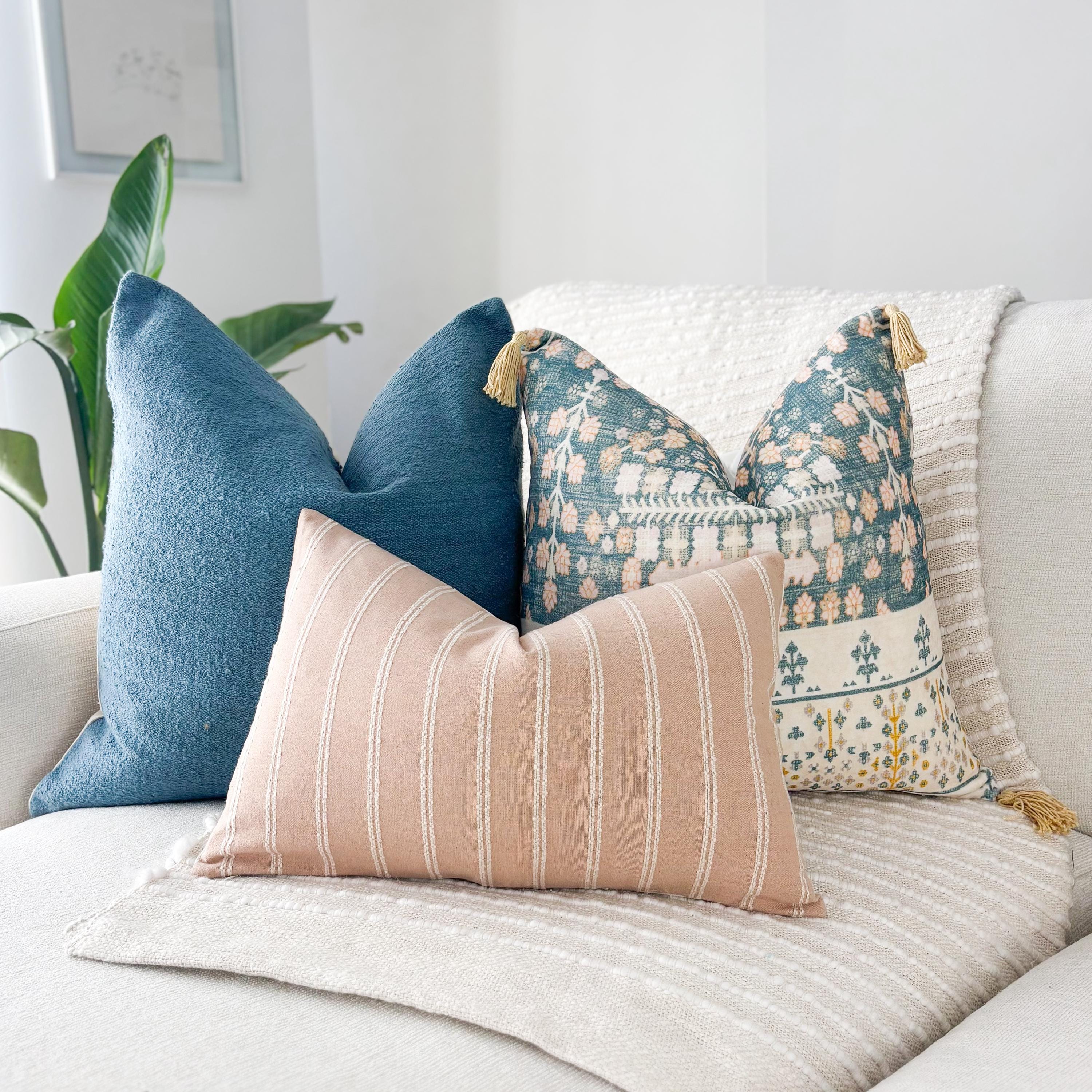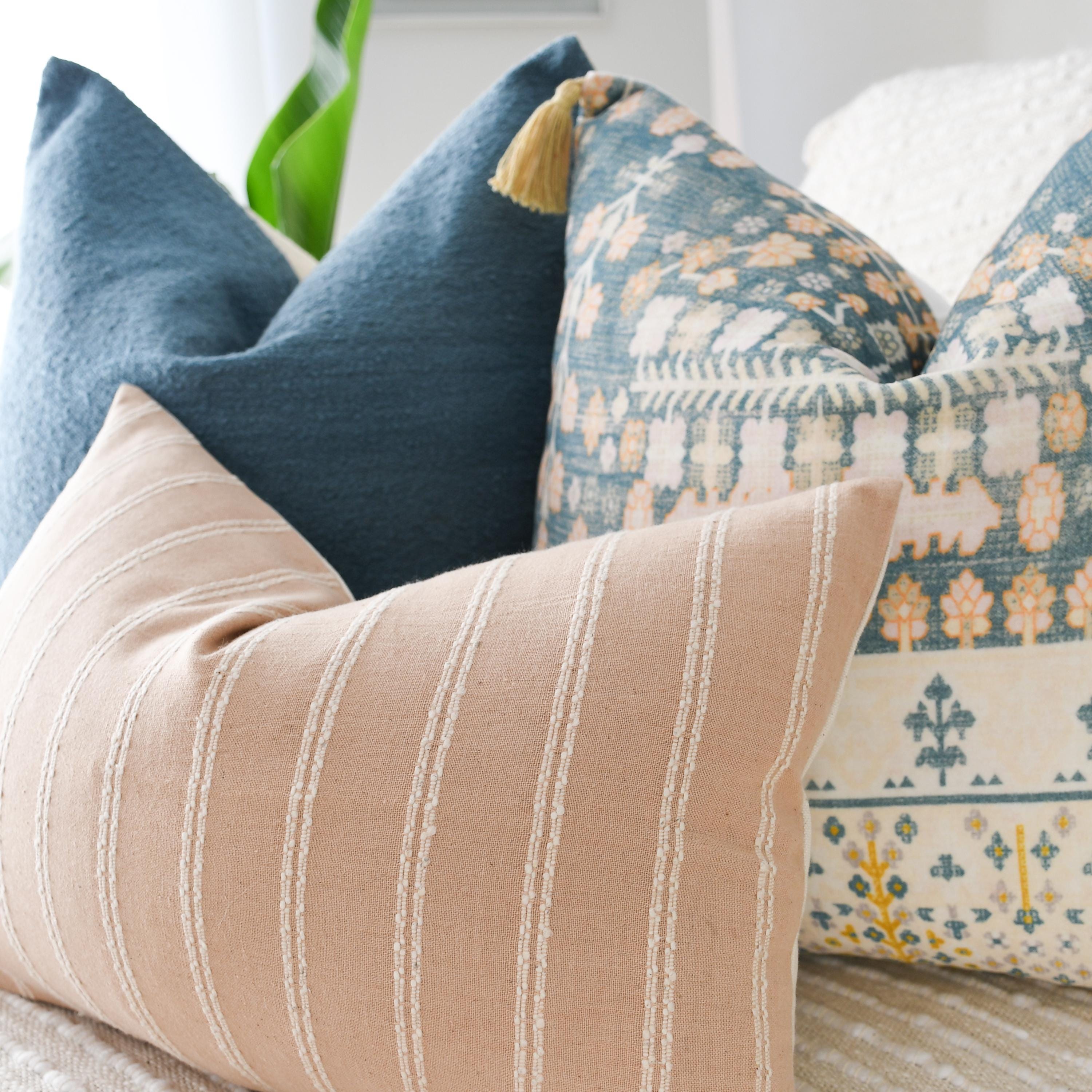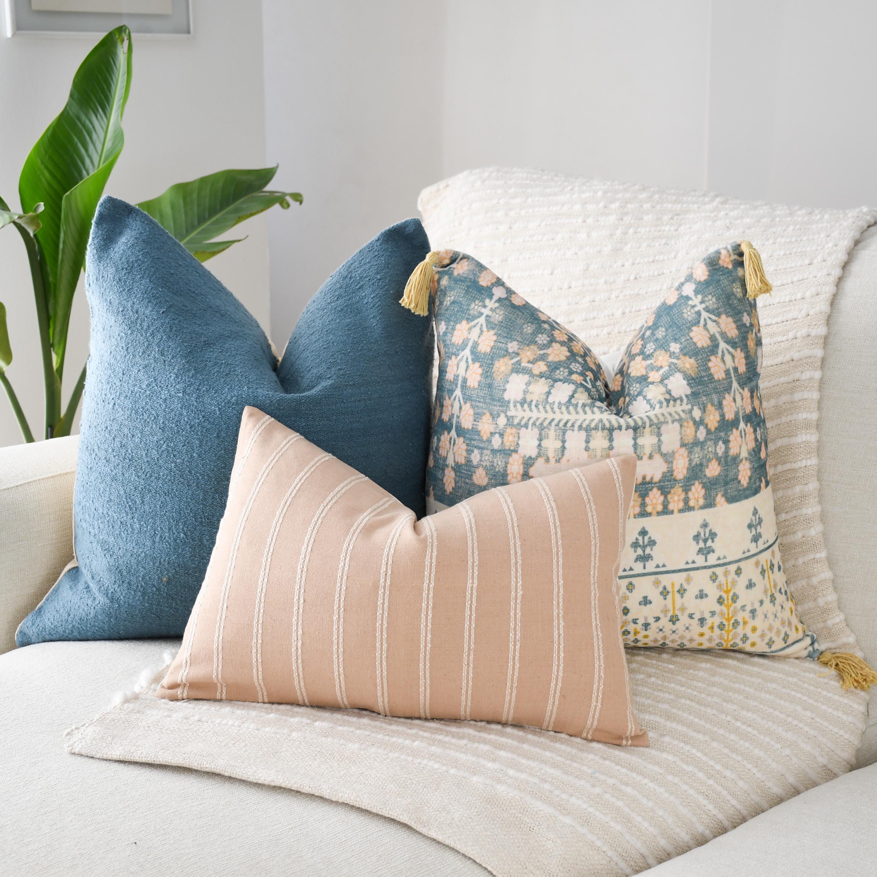 These cotton pillows use hand woven fabrics imported from India and Thailand (Pillow Insert NOT included). Soft coastal hues meet warm, inviting texture in this Coastal Blue and Blush Pillow Set. Designed as a carefully curated trio, it blends relaxed seaside tones with refined handcrafted details, creating a look that feels fresh, uplifting, and effortlessly styled.