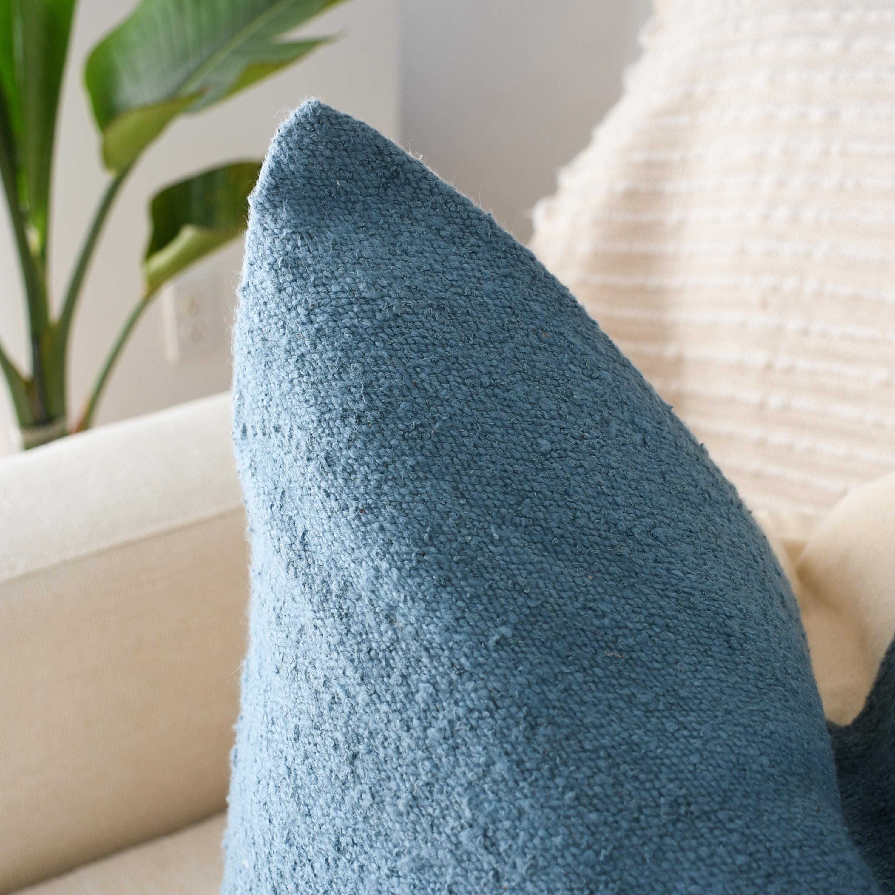 The cotton coastal blue pillow offers rich color with a natural canvas backing that keeps the look grounded. The soft, slightly nubby texture brings depth without overwhelming the palette, making it the perfect anchor for the arrangement.