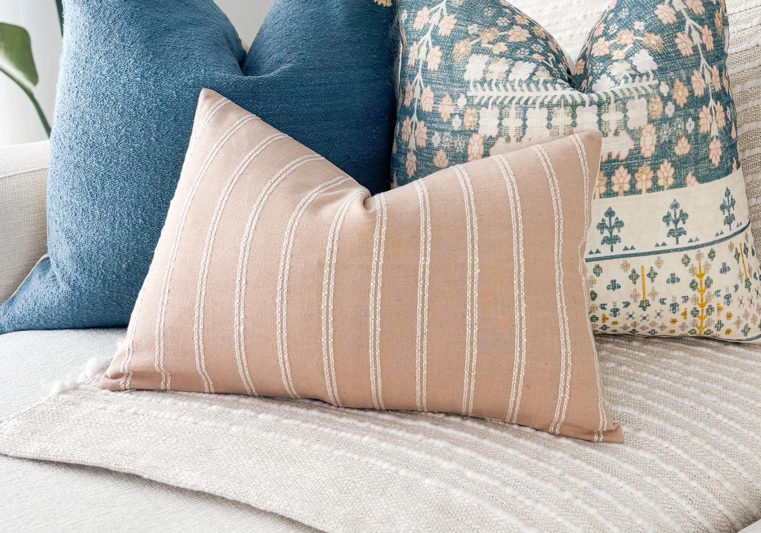 The pink lumbar adds a gentle pop of warmth with its blush-toned fabric and stitched vertical white lines. Its subtle texture and beige canvas backing make it a versatile layering piece that pairs beautifully with both bold and neutral tones.