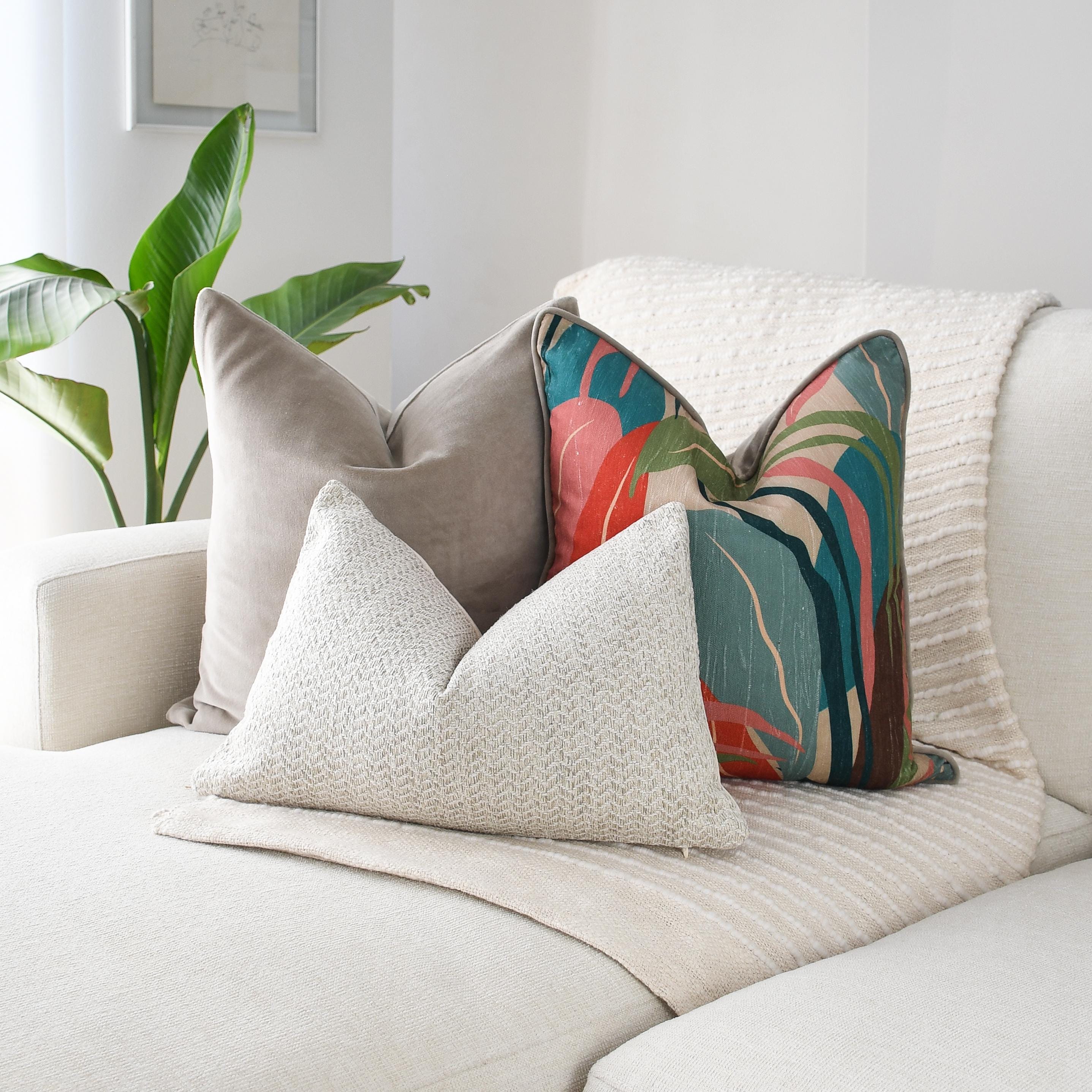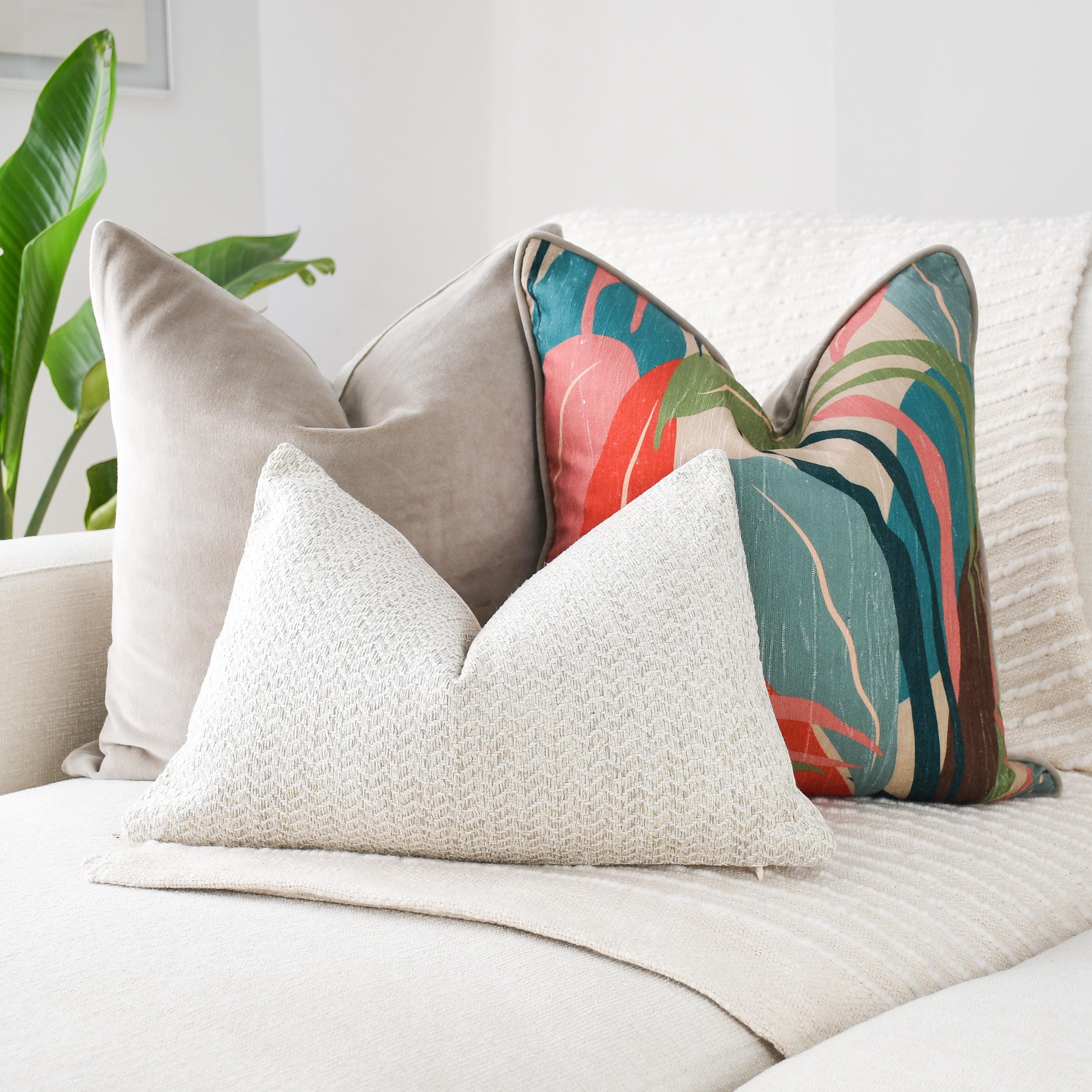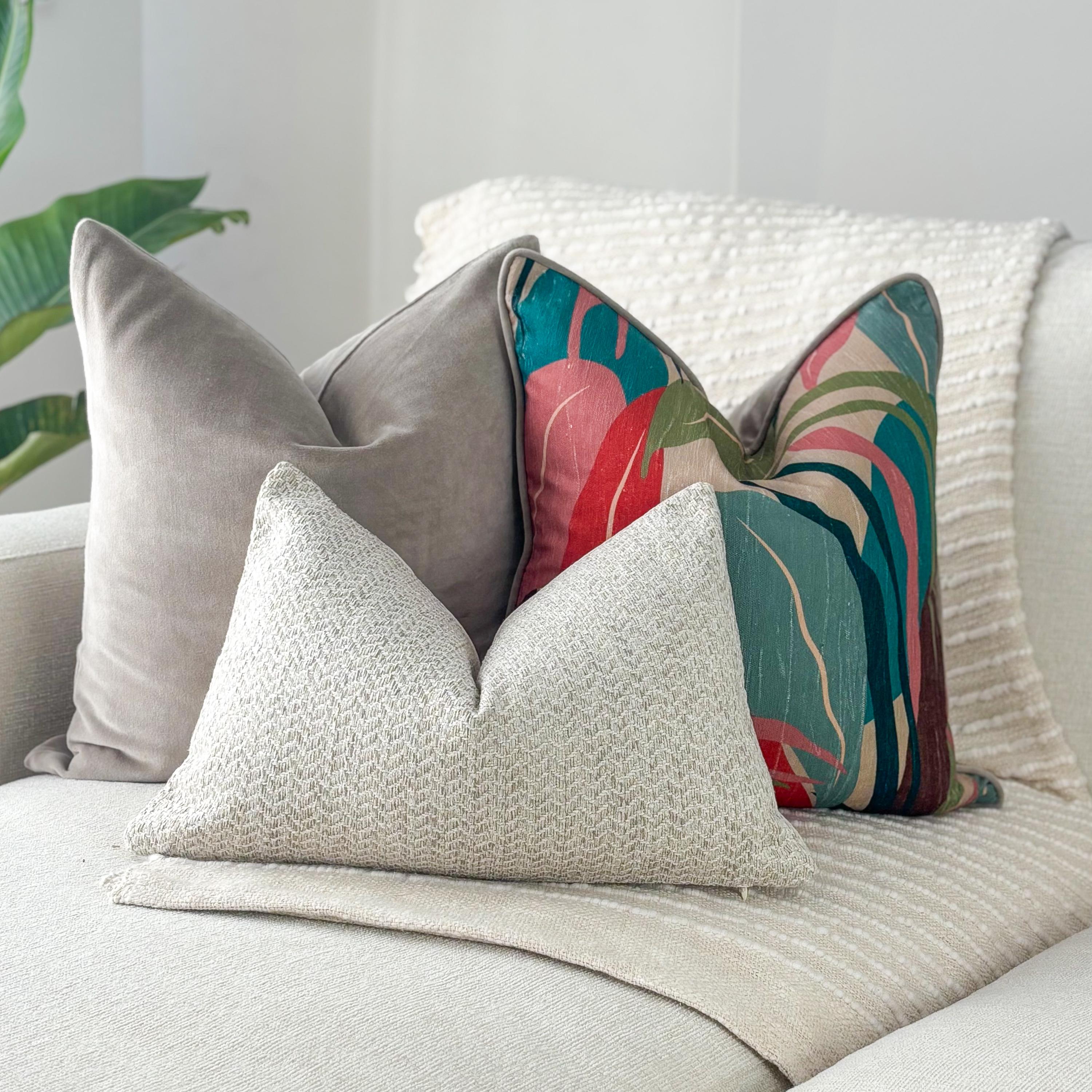 The light gray–ivory lumbar features a richly textured basket-weave blend, adding gentle dimension and softness. Its beige canvas backing keeps the palette warm and versatile, making it the perfect layering piece. The floral pillow becomes the visual highlight of the set, showcasing sweeping tropical shapes in shades of teal, coral, blush, and olive. A smooth gray velvet backing adds contrast and a luxurious hand feel.