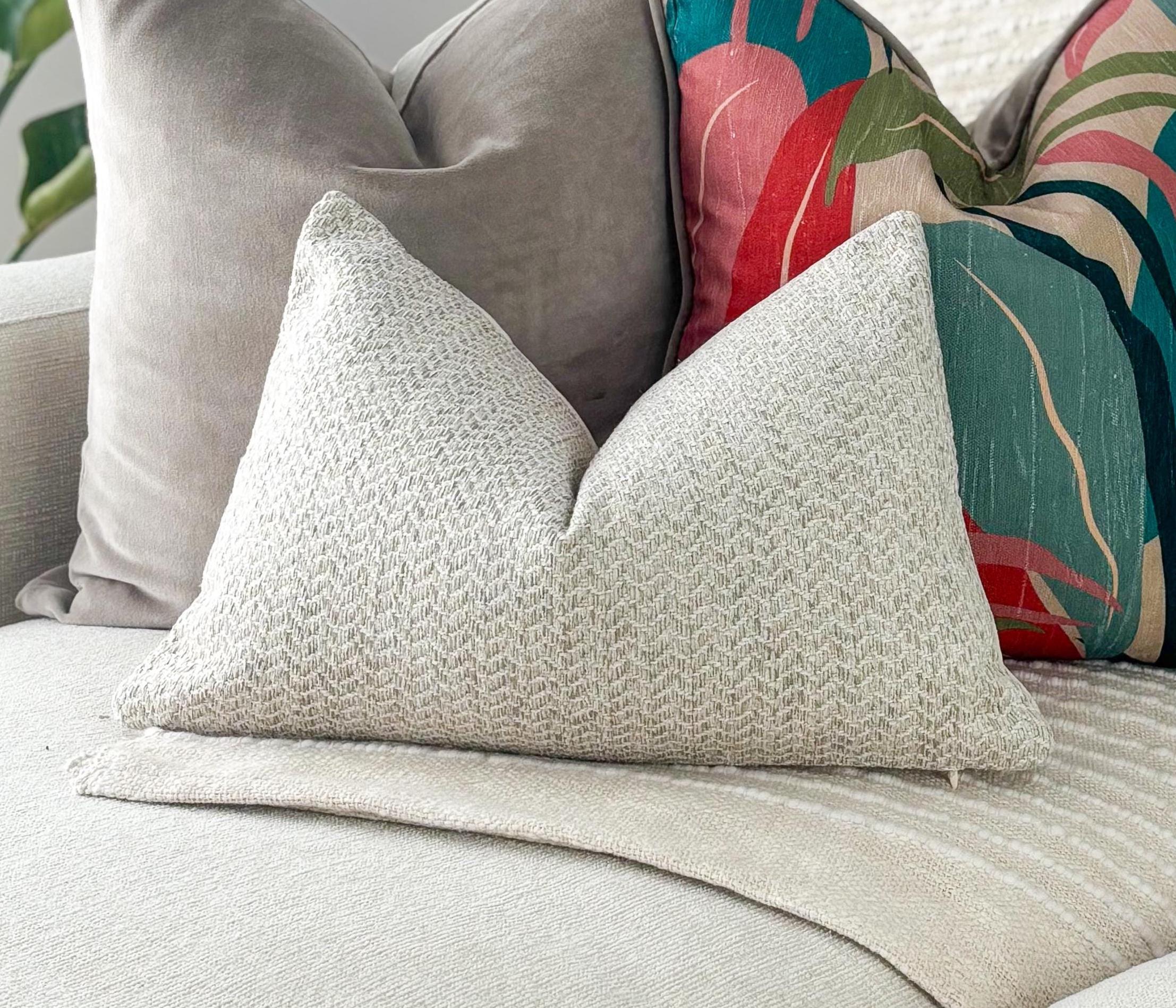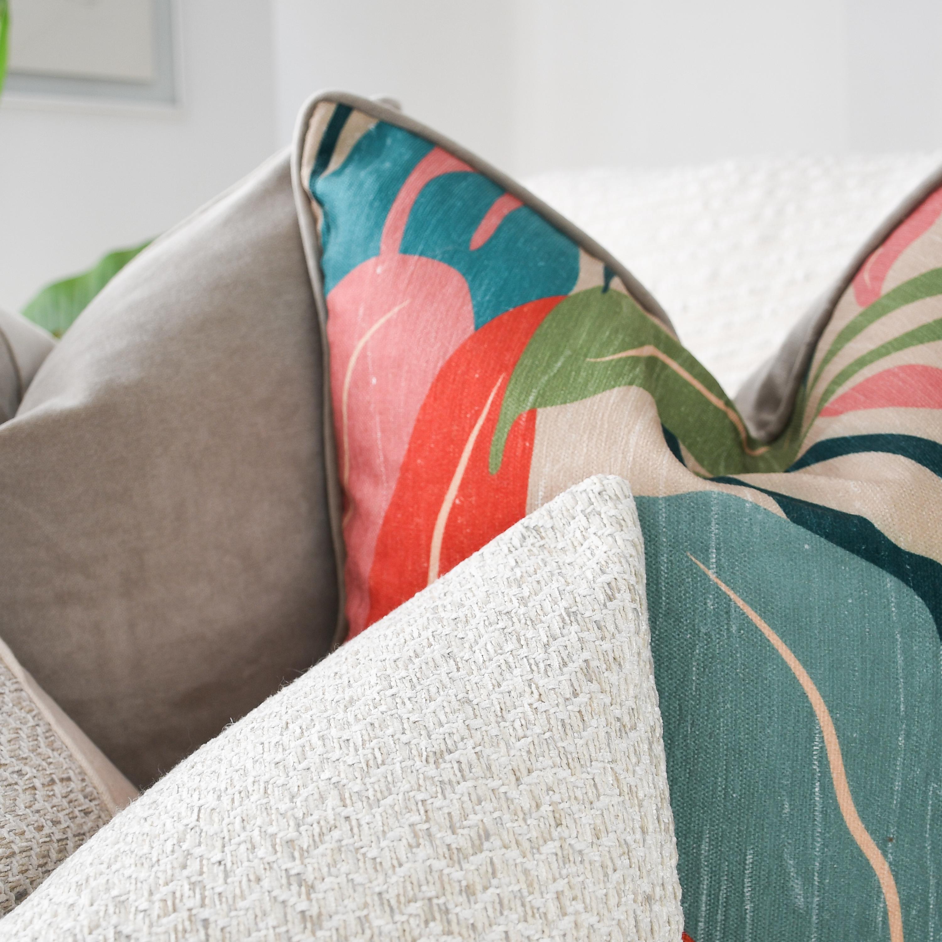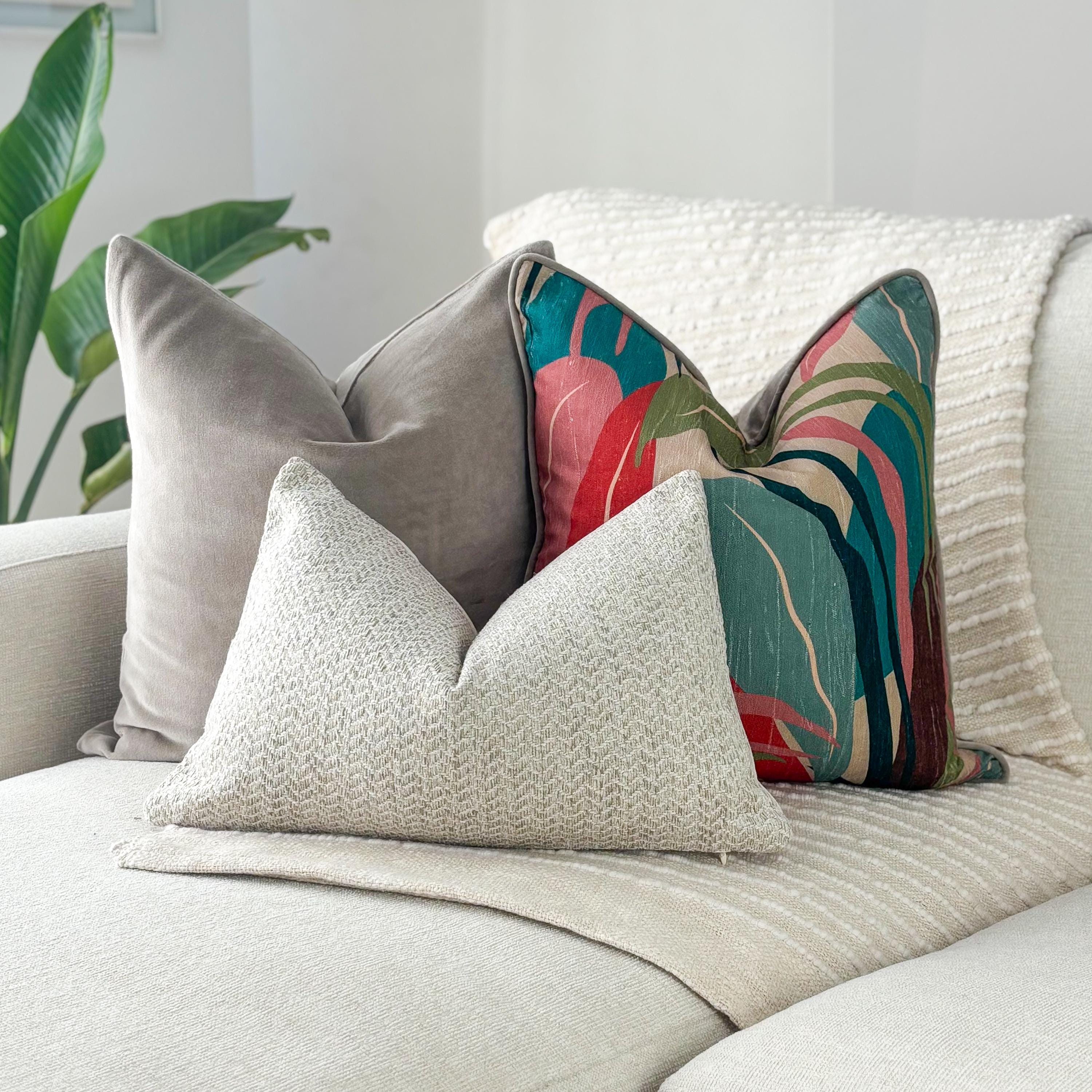 The light gray–ivory lumbar features a richly textured basket-weave blend, adding gentle dimension and softness. Its beige canvas backing keeps the palette warm and versatile, making it the perfect layering piece. The floral pillow becomes the visual highlight of the set, showcasing sweeping tropical shapes in shades of teal, coral, blush, and olive. A smooth gray velvet backing adds contrast and a luxurious hand feel.
