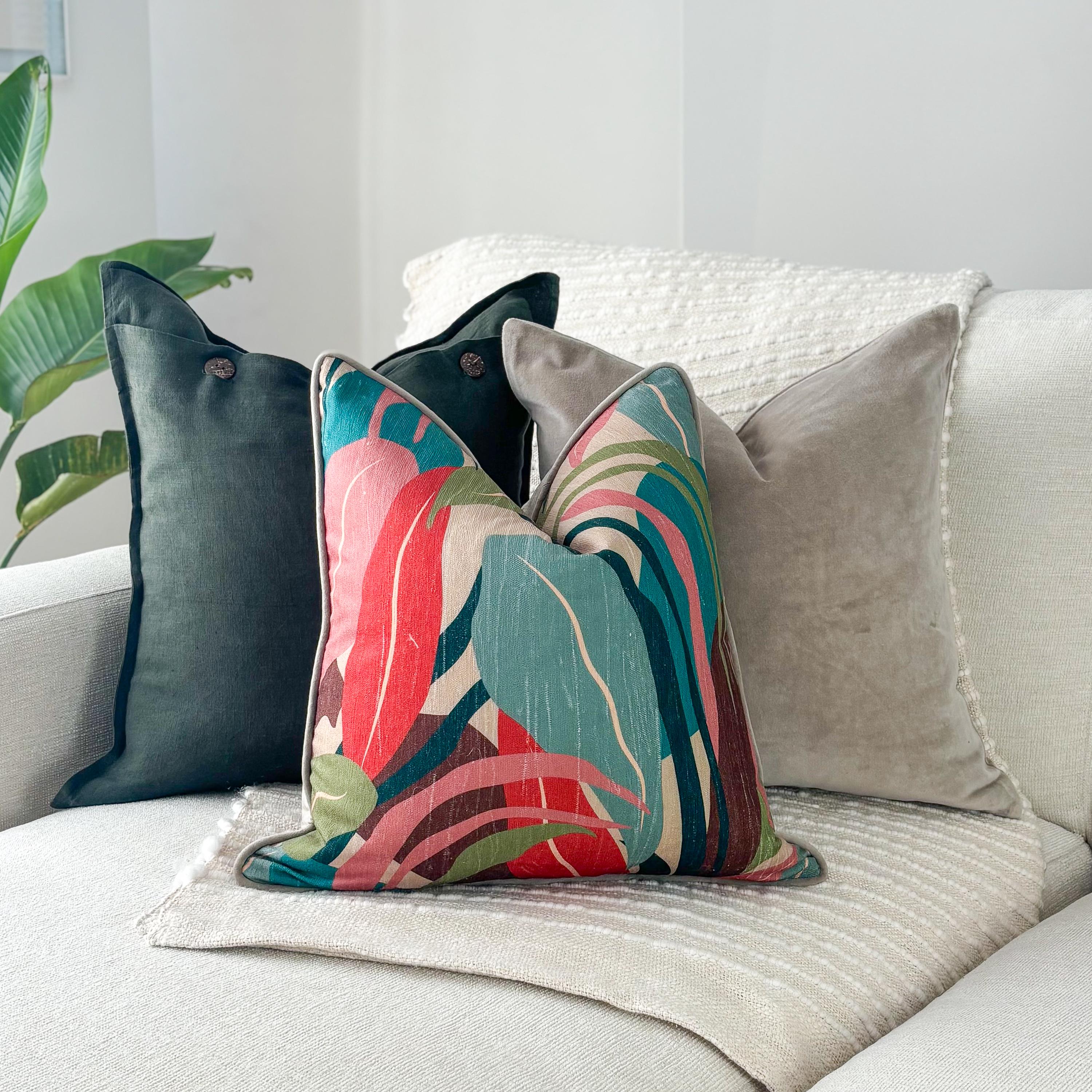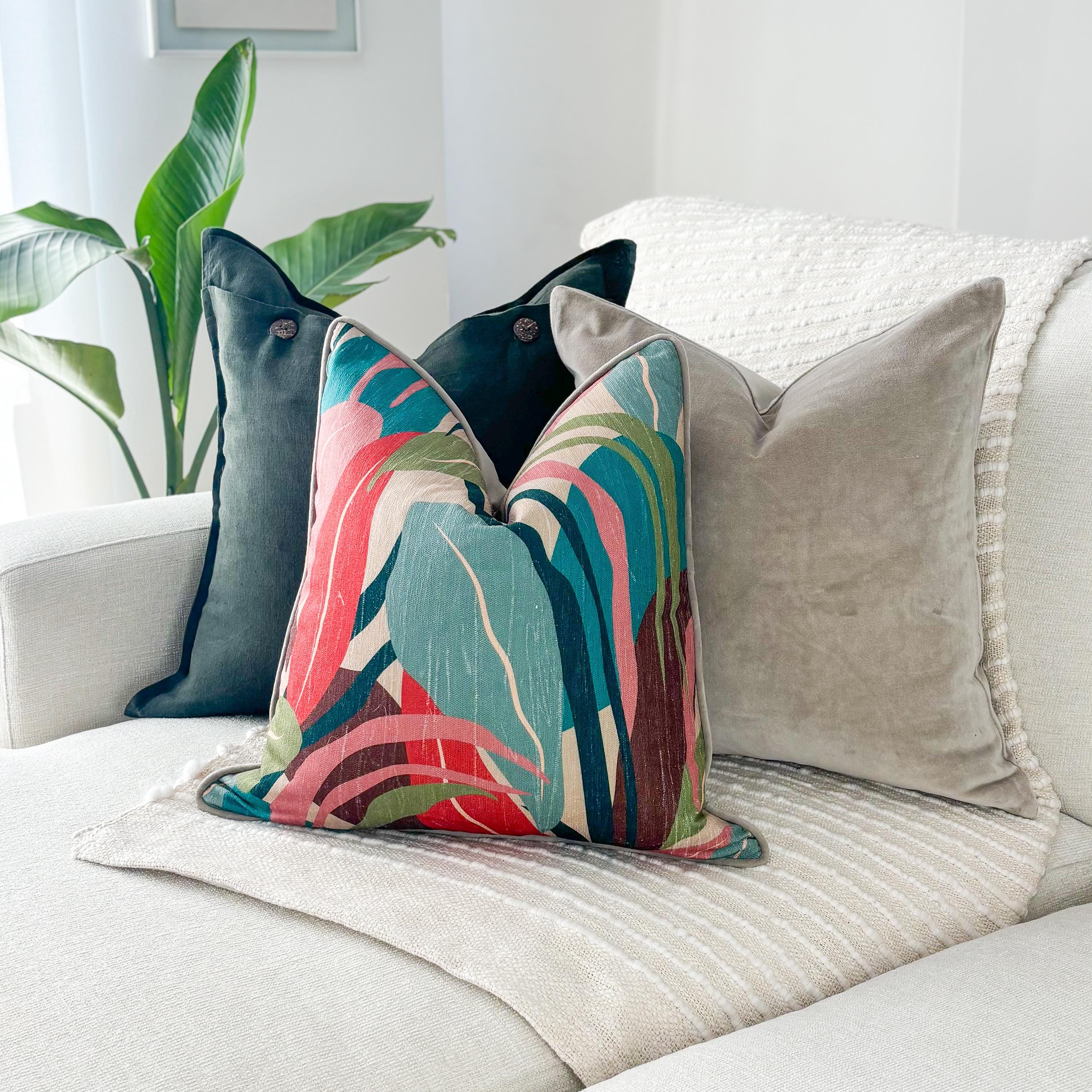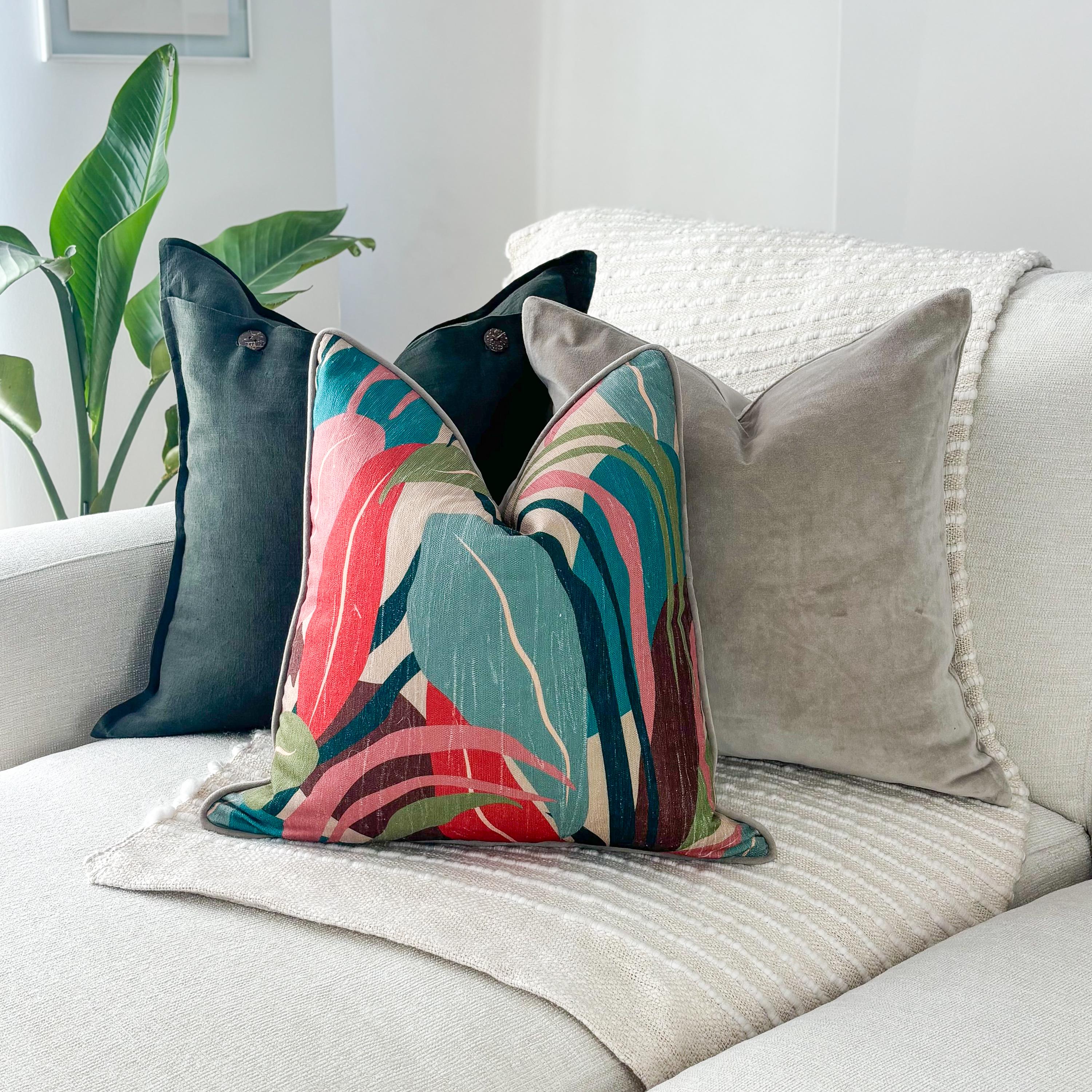 The floral pillow brings instant energy to the arrangement with sweeping botanical shapes in teal, coral, blush, olive, and deep berry. The woven texture adds a subtle sheen and movement, while the gray velvet backing introduces depth and softness.