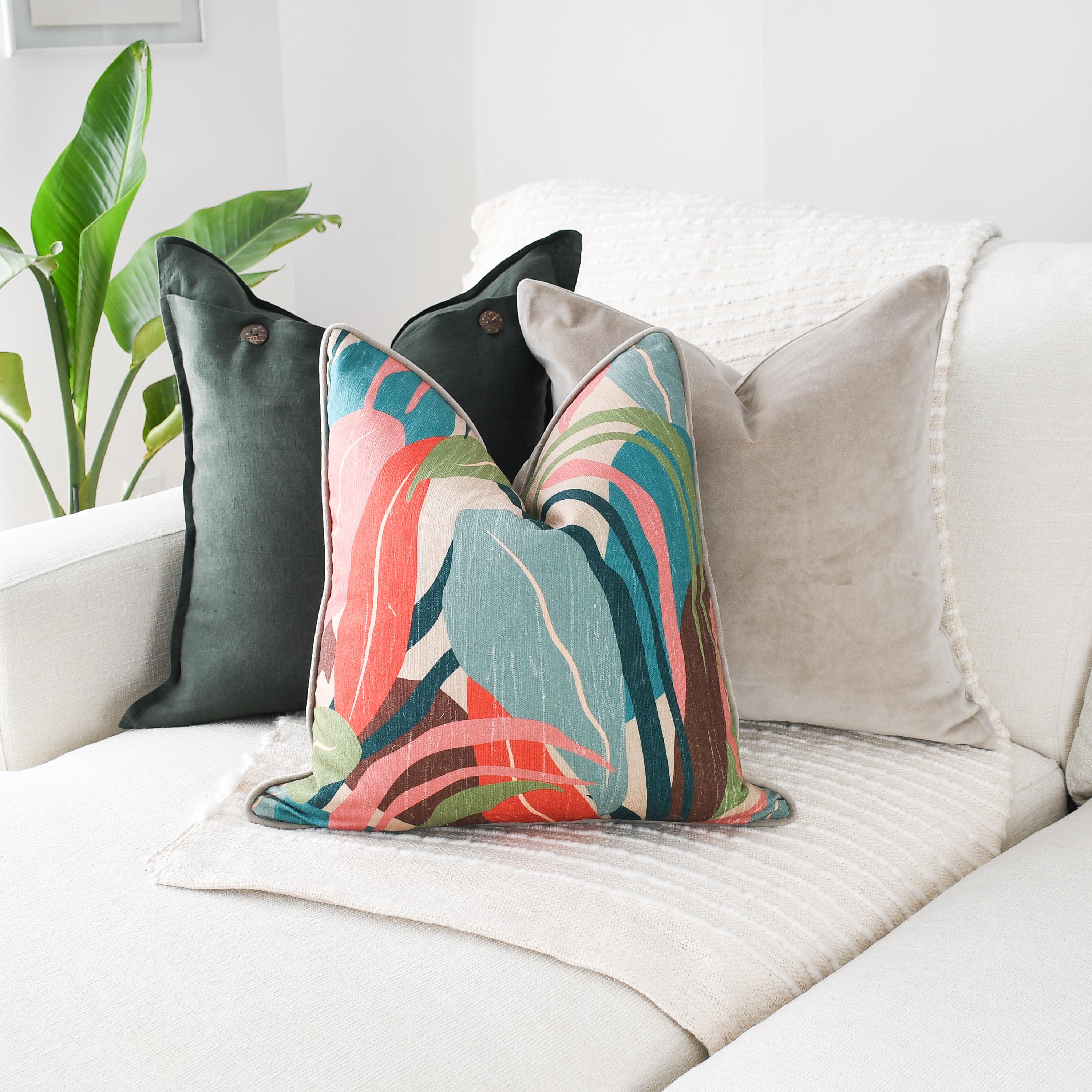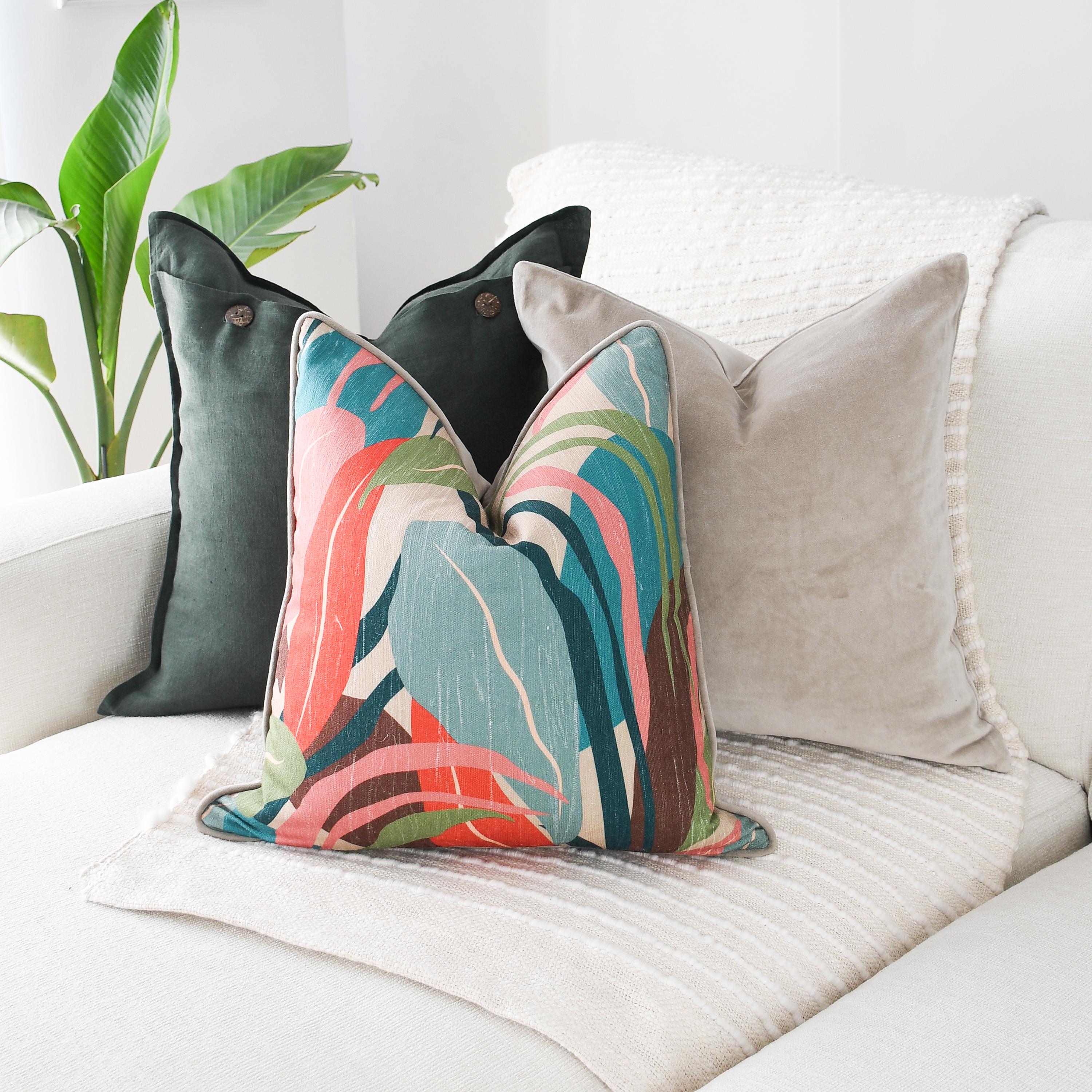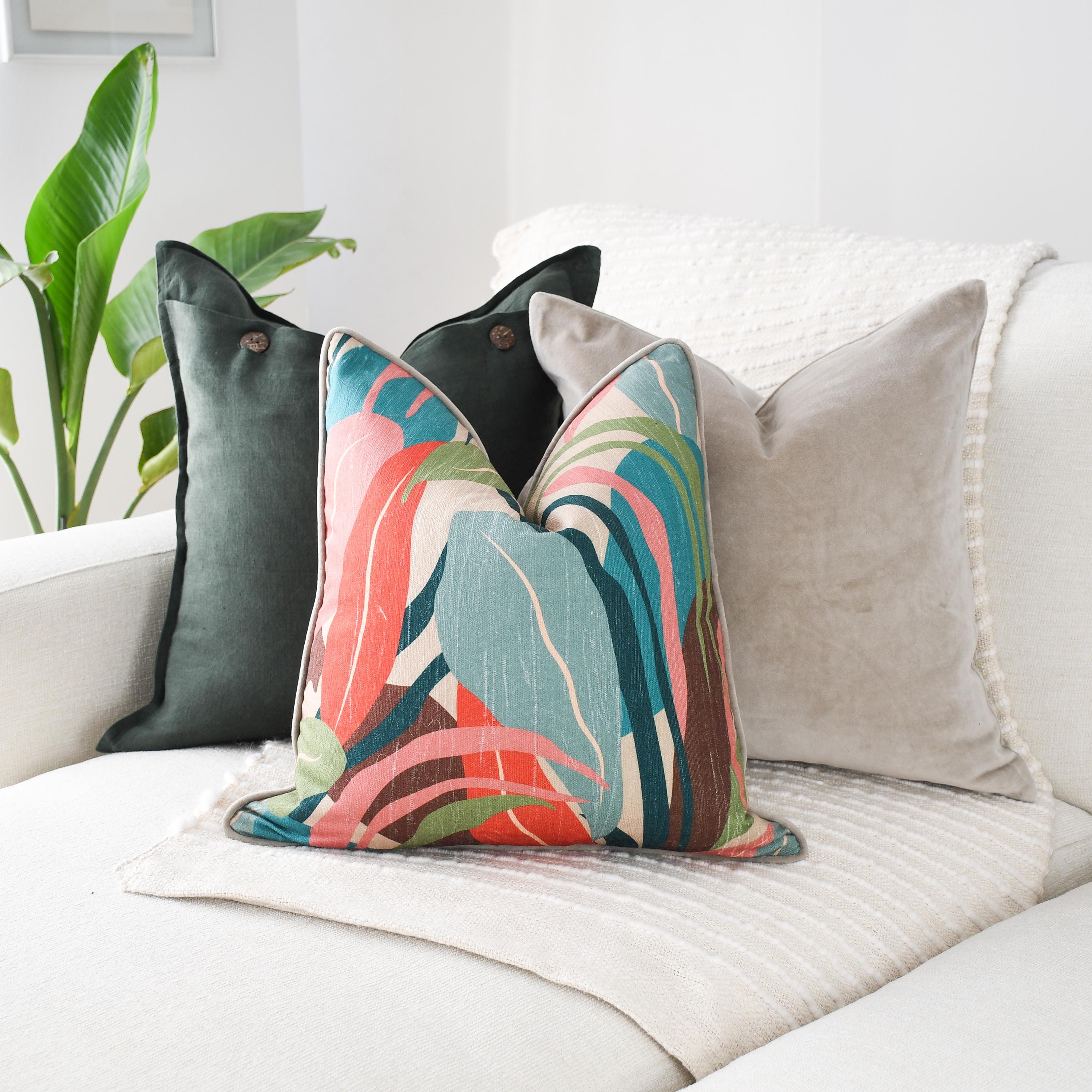 The floral pillow brings instant energy to the arrangement with sweeping botanical shapes in teal, coral, blush, olive, and deep berry. The woven texture adds a subtle sheen and movement, while the gray velvet backing introduces depth and softness.