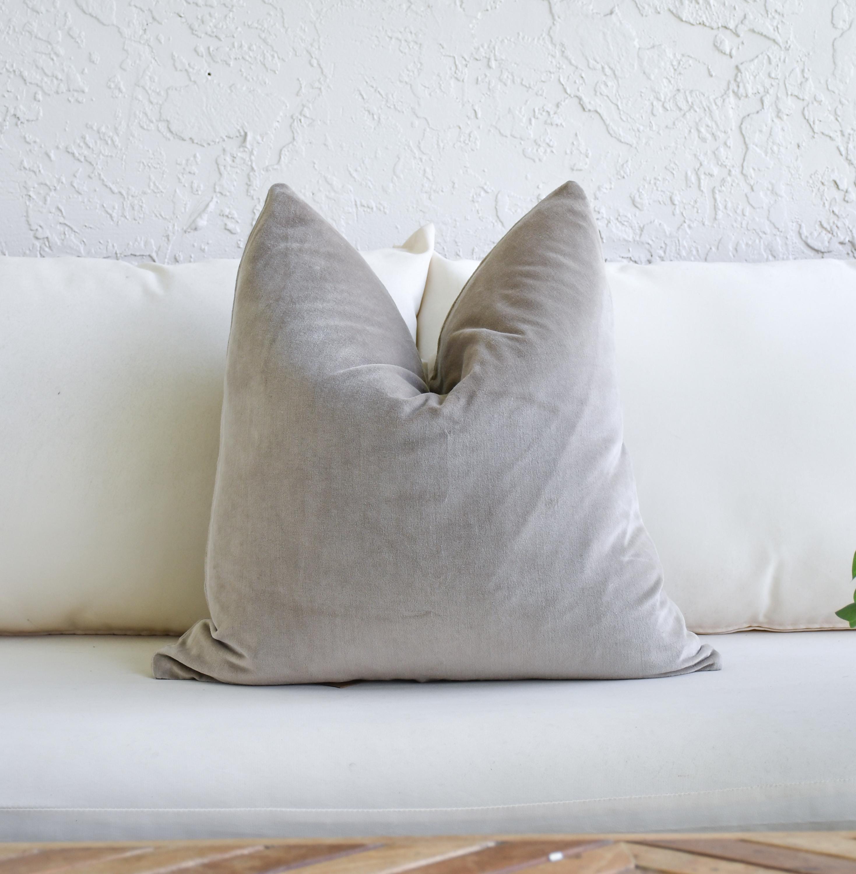 The gray velvet pillow enhances the palette with a smooth, plush finish that feels elegant and calming. Its neutral tone acts as the perfect backdrop, balancing the vibrancy of the floral print.