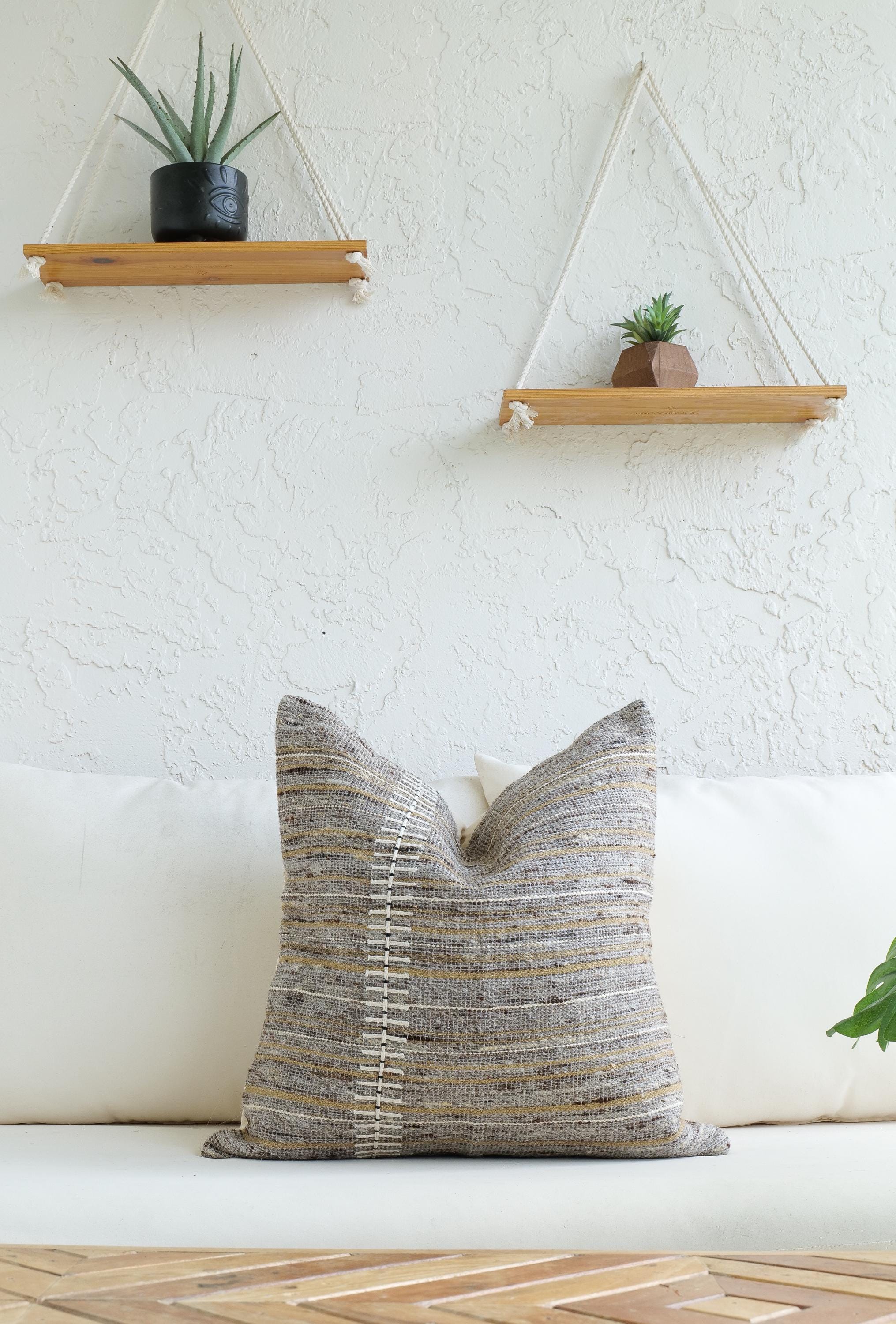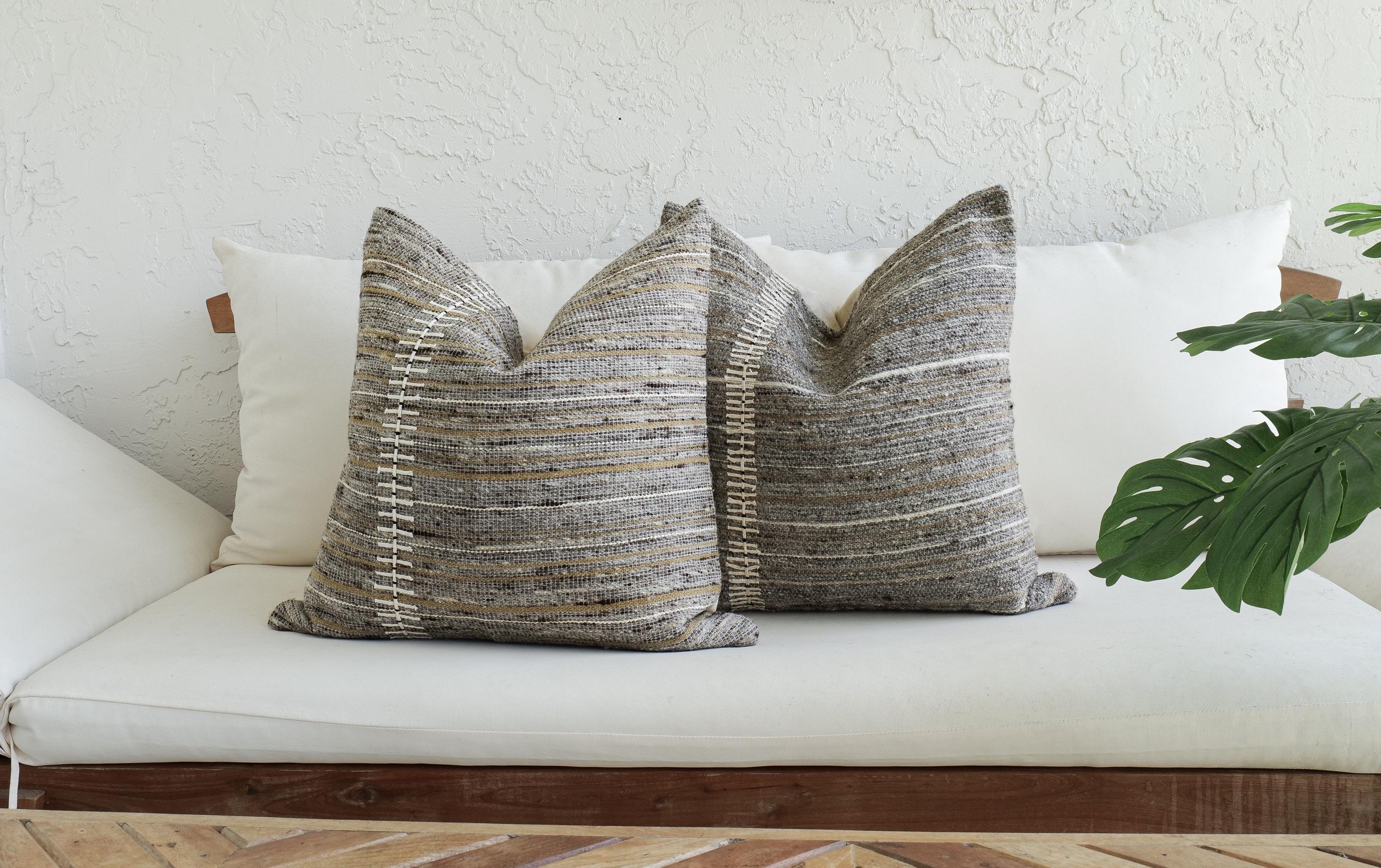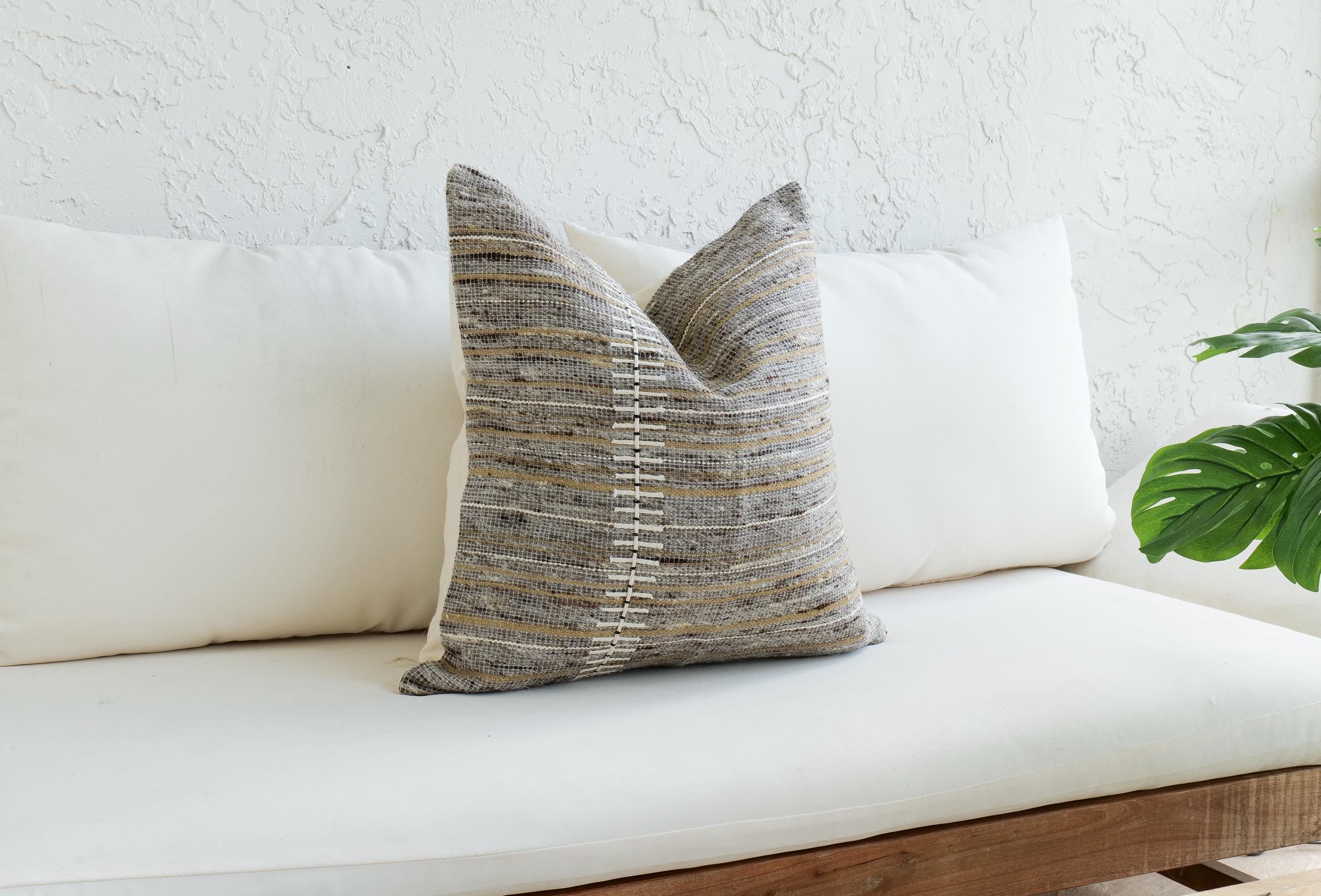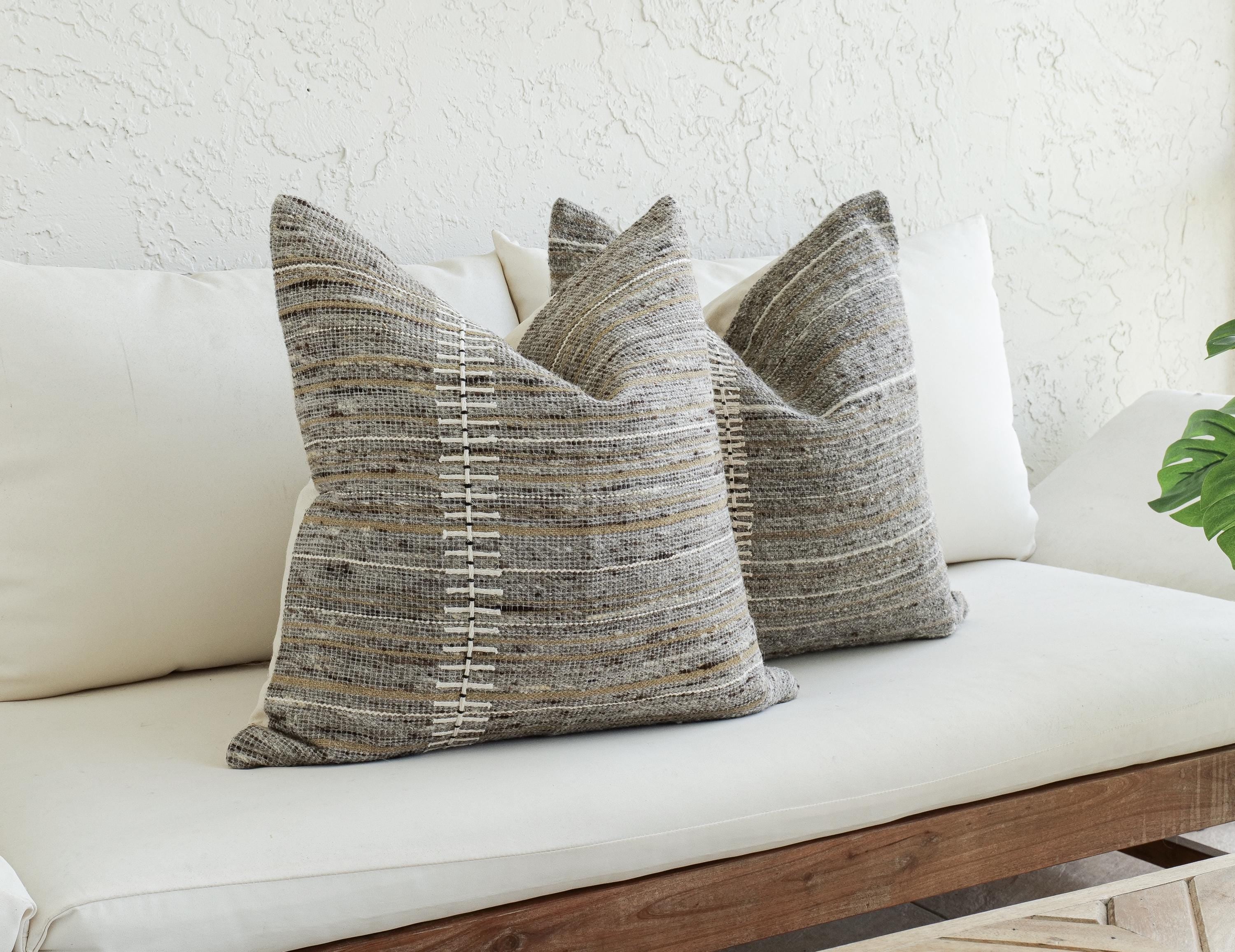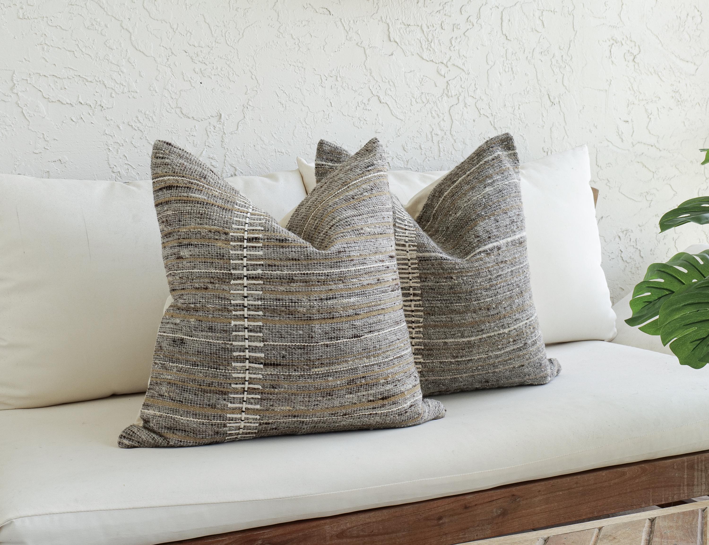 Elevate your living space with these gray and tan wool pillow covers, handwoven for a richly textured, artisan look. Perfect for boho, modern, or farmhouse-style homes, this design blends earthy tones with cozy, natural fibers—making it an ideal accent for your couch, bed, or reading nook. Whether purchased individually or as a coordinated set, these decorative cushions add warmth and handcrafted charm to any neutral or rustic interior. Their unique stripe detailing adds subtle visual interest while remaining timeless and versatile.