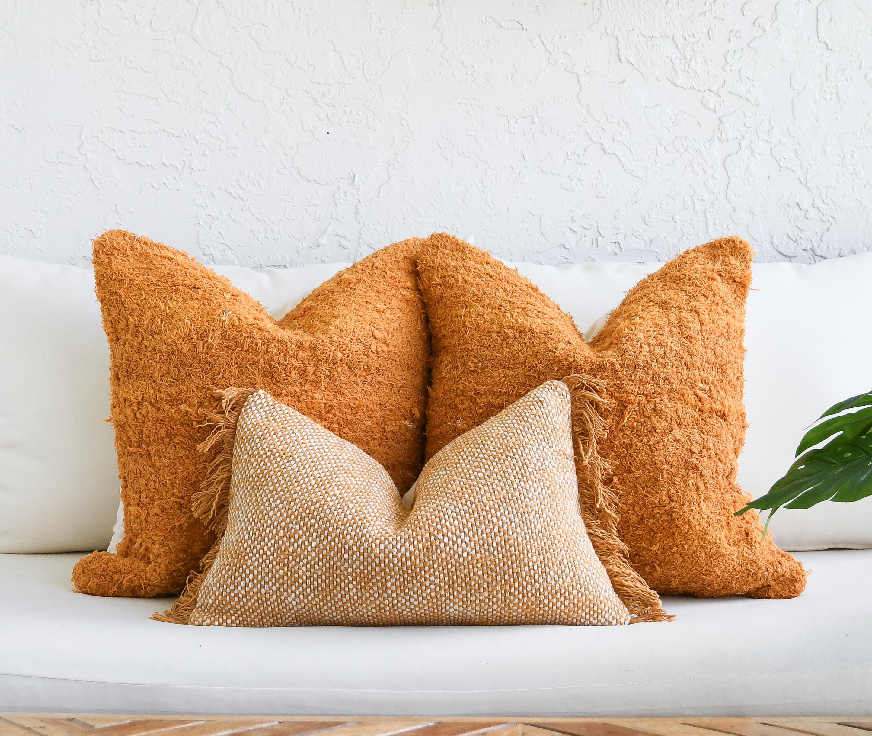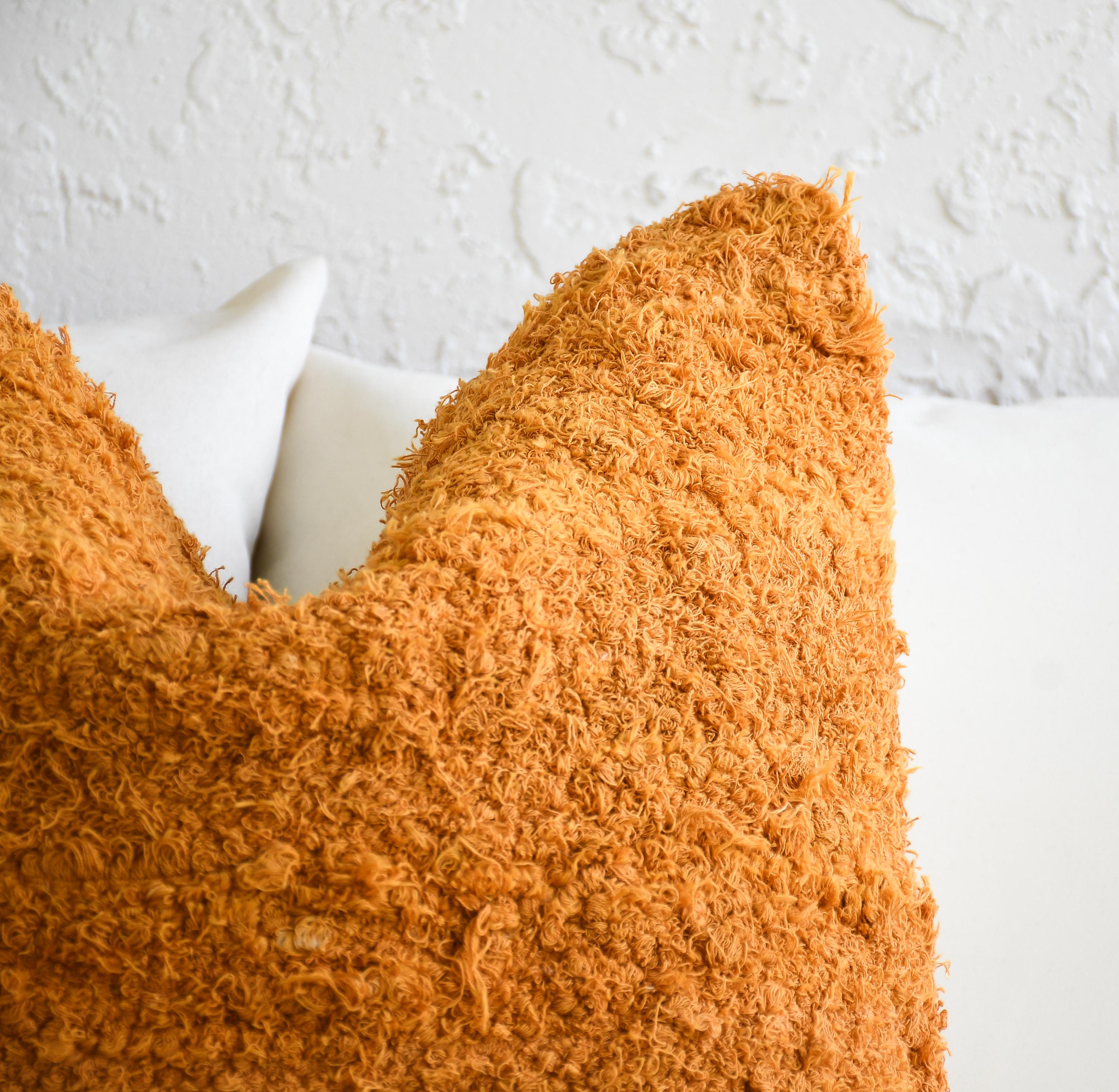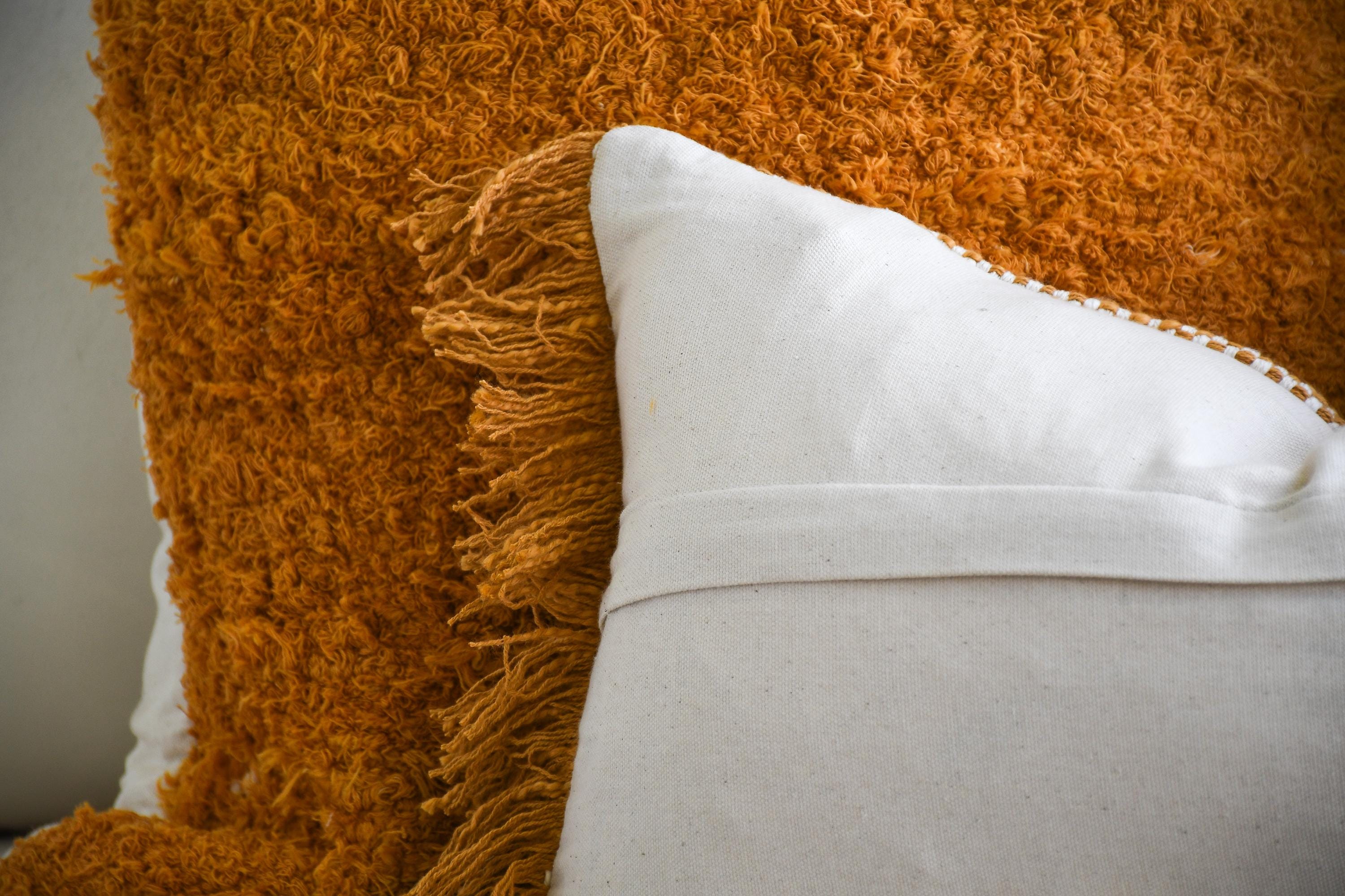 These beautiful cotton pillows use hand woven fabrics imported from India (Pillow Insert NOT included). This warm, texture-forward pillow set brings rich golden tones and inviting depth to any space. Featuring two mustard-orange looped terry cotton pillows with a soft, curly, shag-like finish and one handwoven cotton lumbar with subtle fringe and earthy orange tones, this bundle is designed to make a space feel instantly cozy and styled.