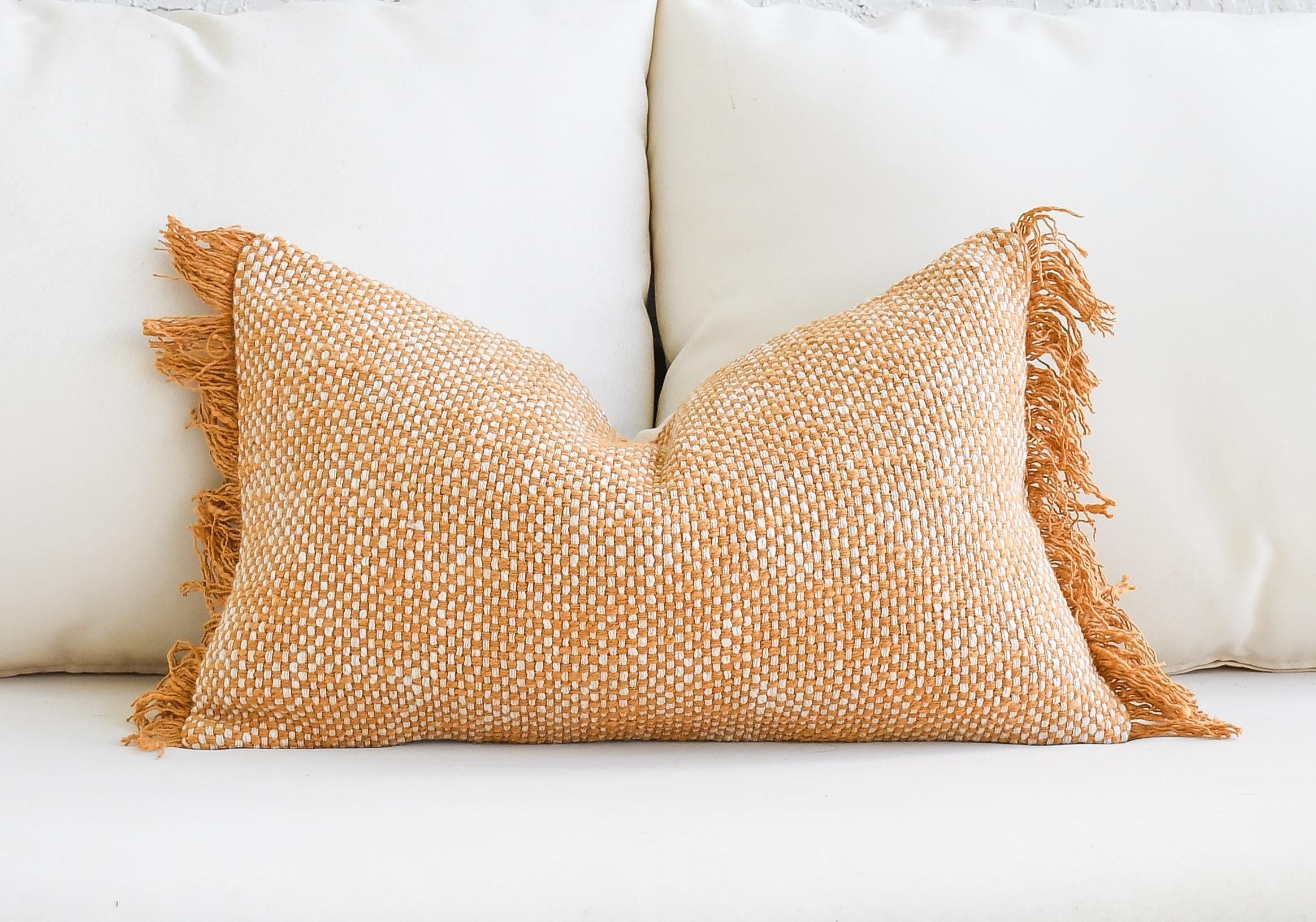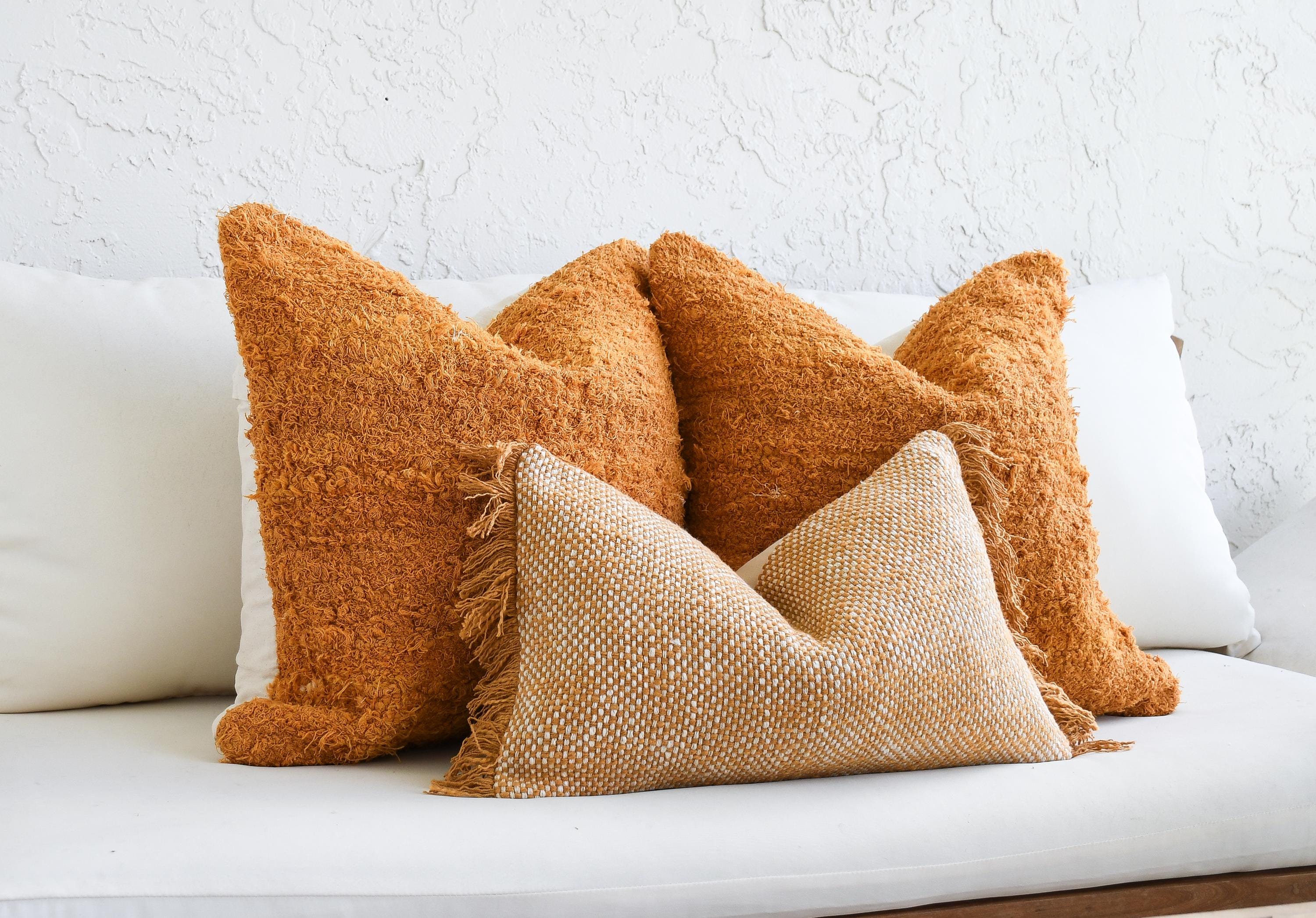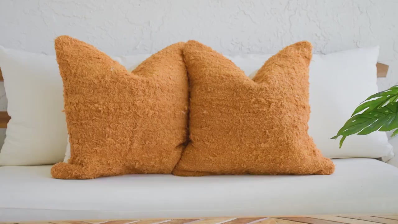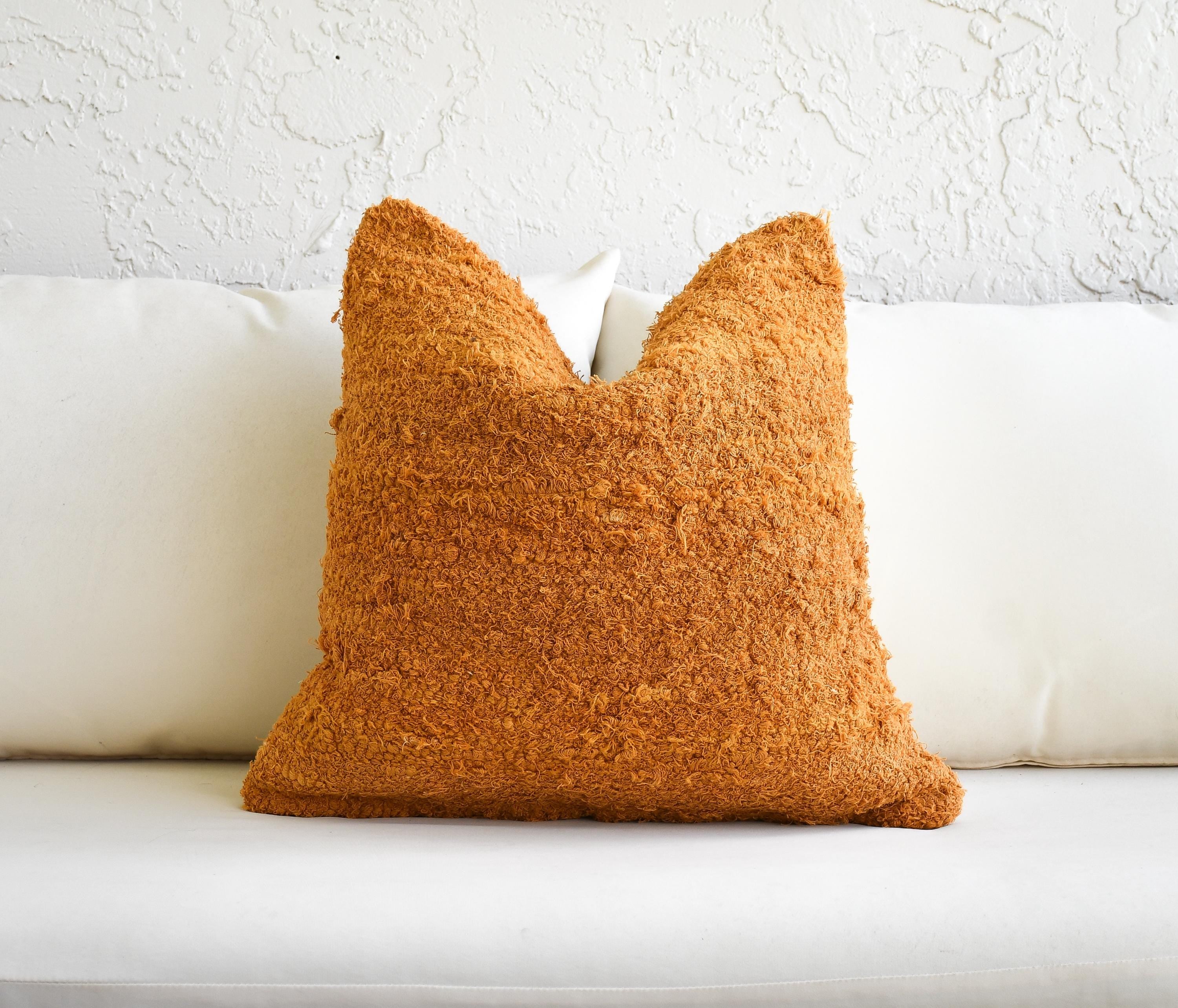 These beautiful cotton pillows use hand woven fabrics imported from India (Pillow Insert NOT included). This warm, texture-forward pillow set brings rich golden tones and inviting depth to any space. Featuring two mustard-orange looped terry cotton pillows with a soft, curly, shag-like finish and one handwoven cotton lumbar with subtle fringe and earthy orange tones, this bundle is designed to make a space feel instantly cozy and styled.