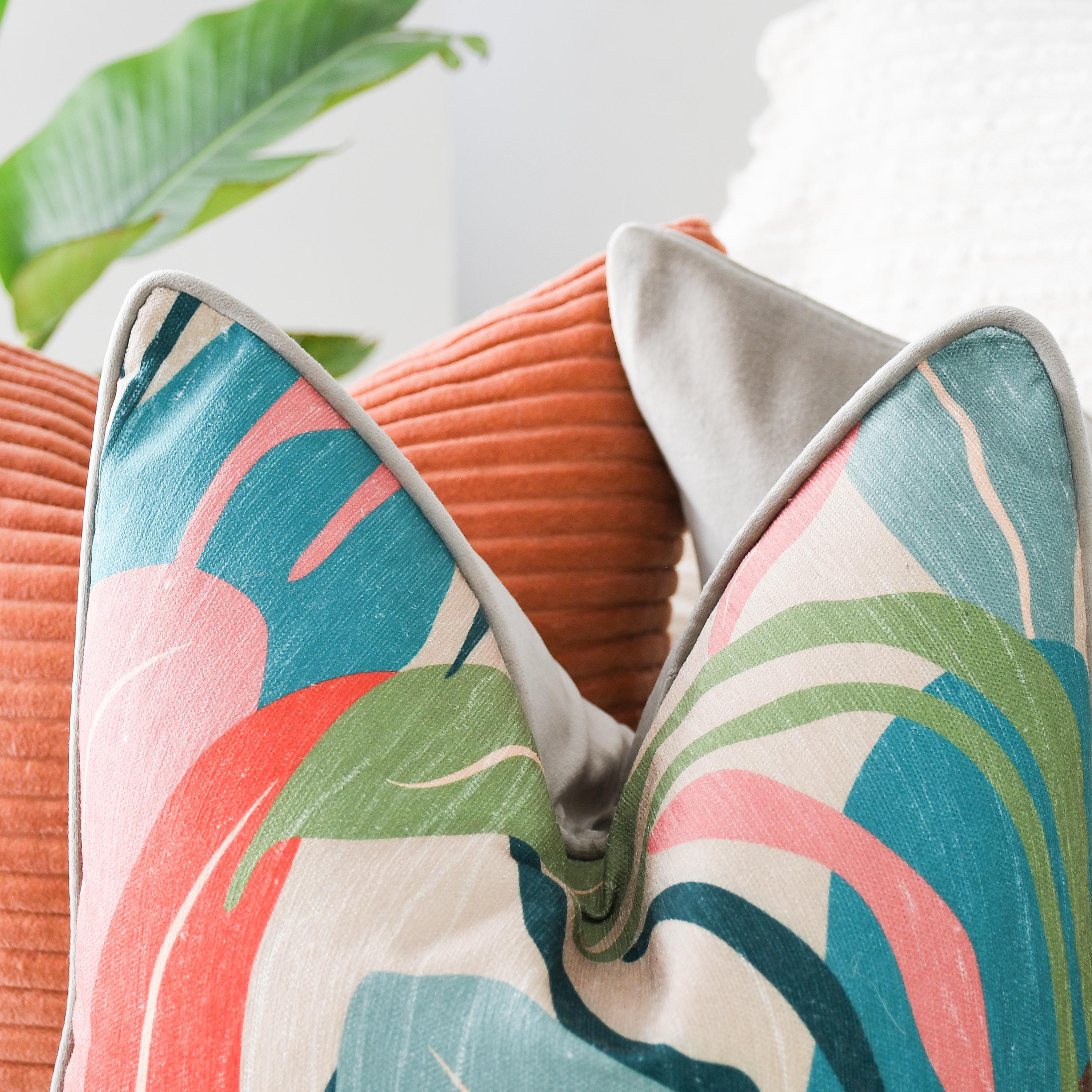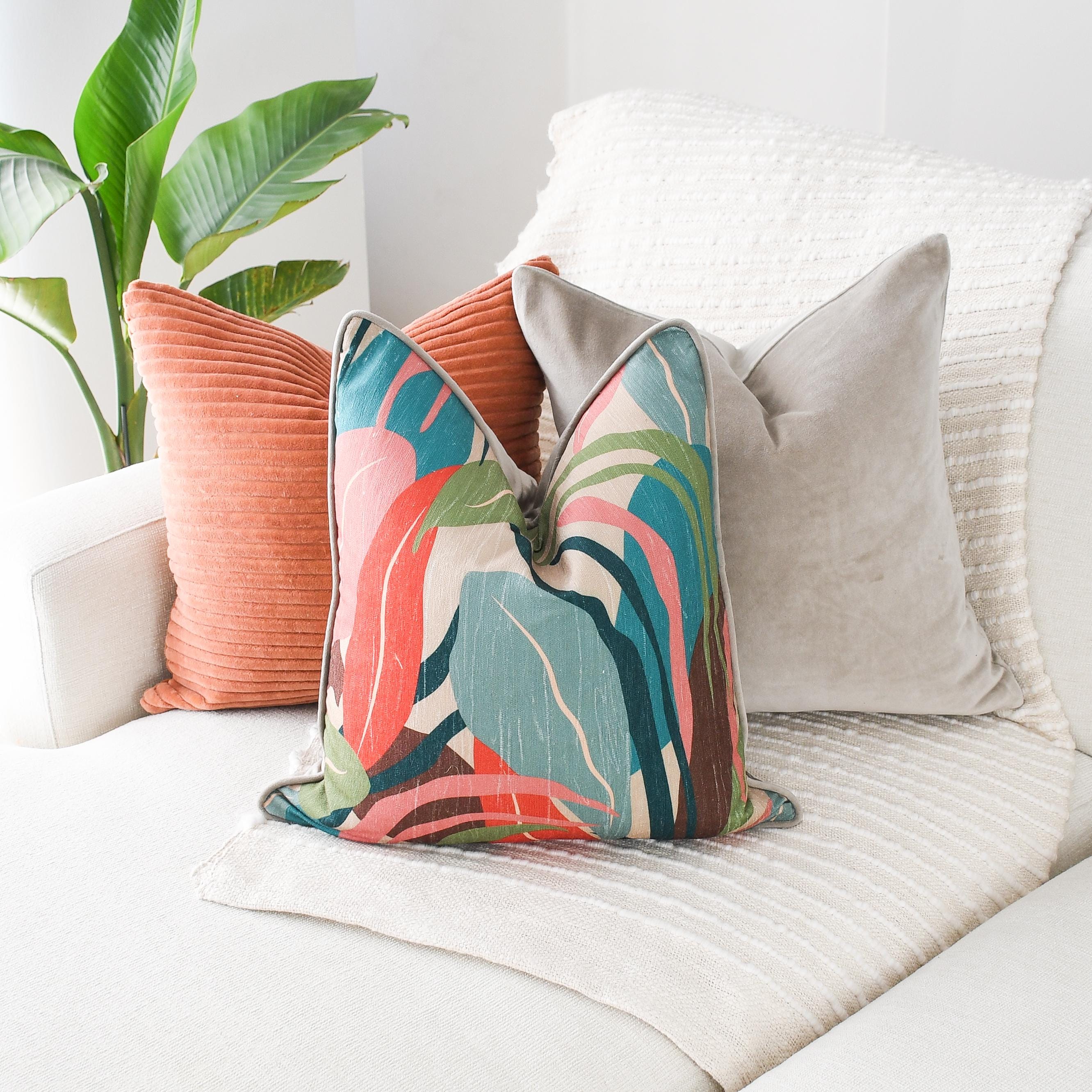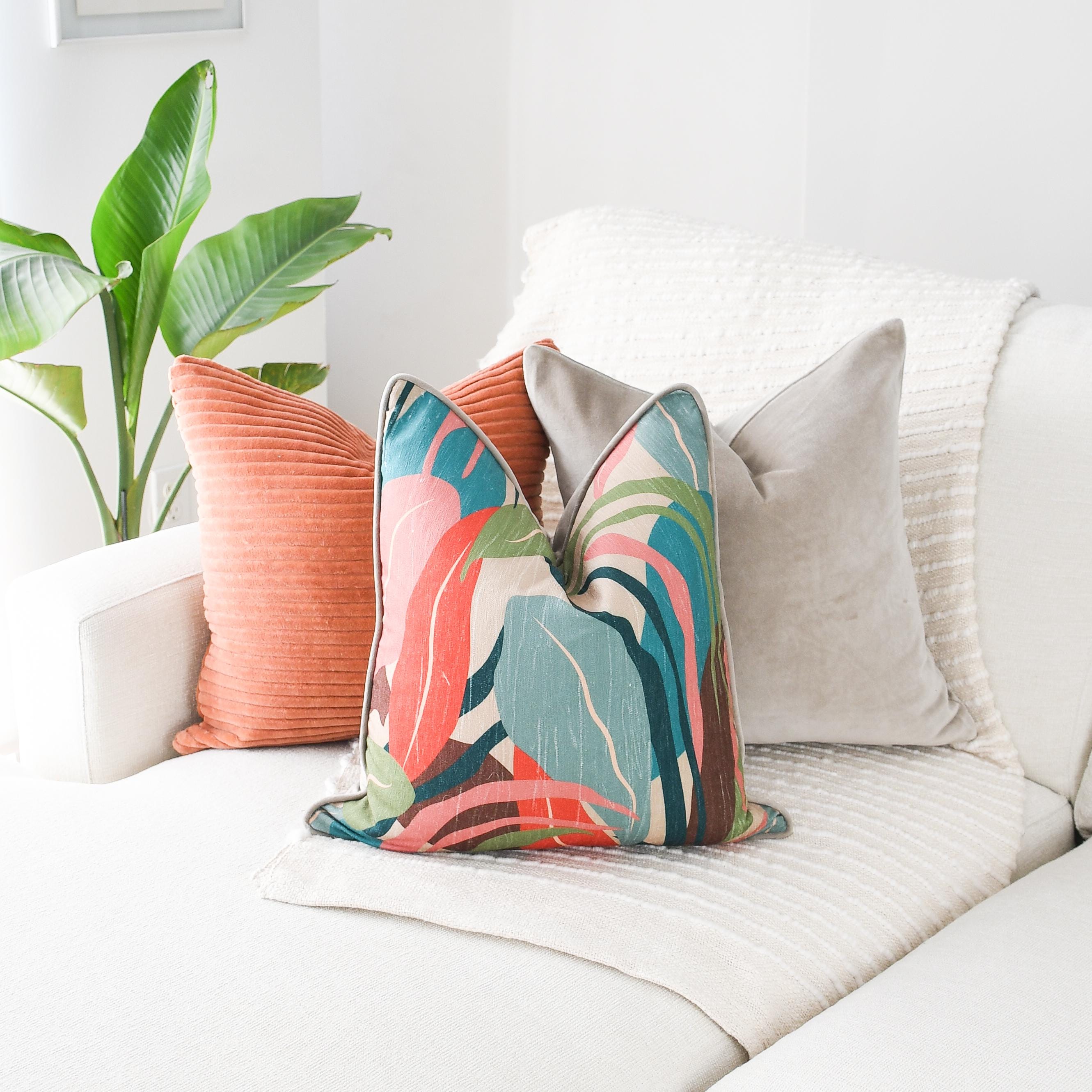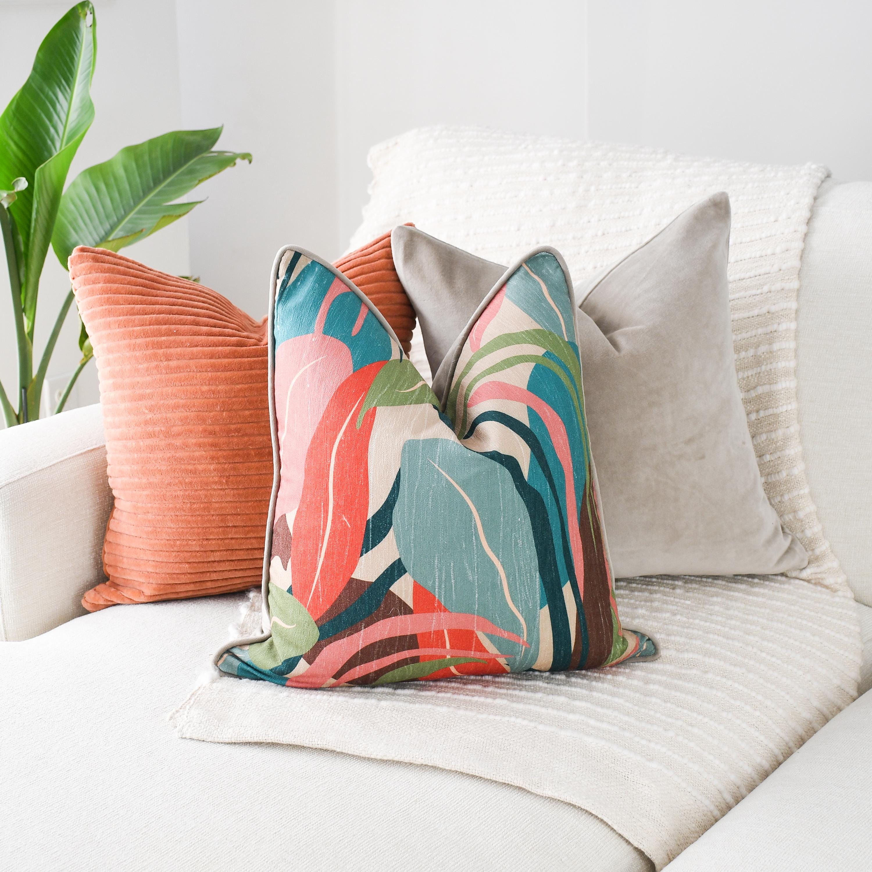 These cotton pillows use hand woven fabrics imported from India (Pillow Insert NOT included). Refresh your space with this beautifully curated Tropical 3-Pillow Cover Set, thoughtfully designed to blend color, texture, and modern style. The set includes a vibrant tropical floral cotton cover with a soft grey velvet back, a peach velvet corduroy pillow with a geometric textured finish, and a double-sided gray velvet cover for a luxurious neutral balance. Each piece is handmade with a hidden zipper for a clean, polished look. Perfect for styling sofas, beds, or accent chairs, this set brings warmth, depth, and a curated designer feel to any home. (Pillow Insert NOT included)