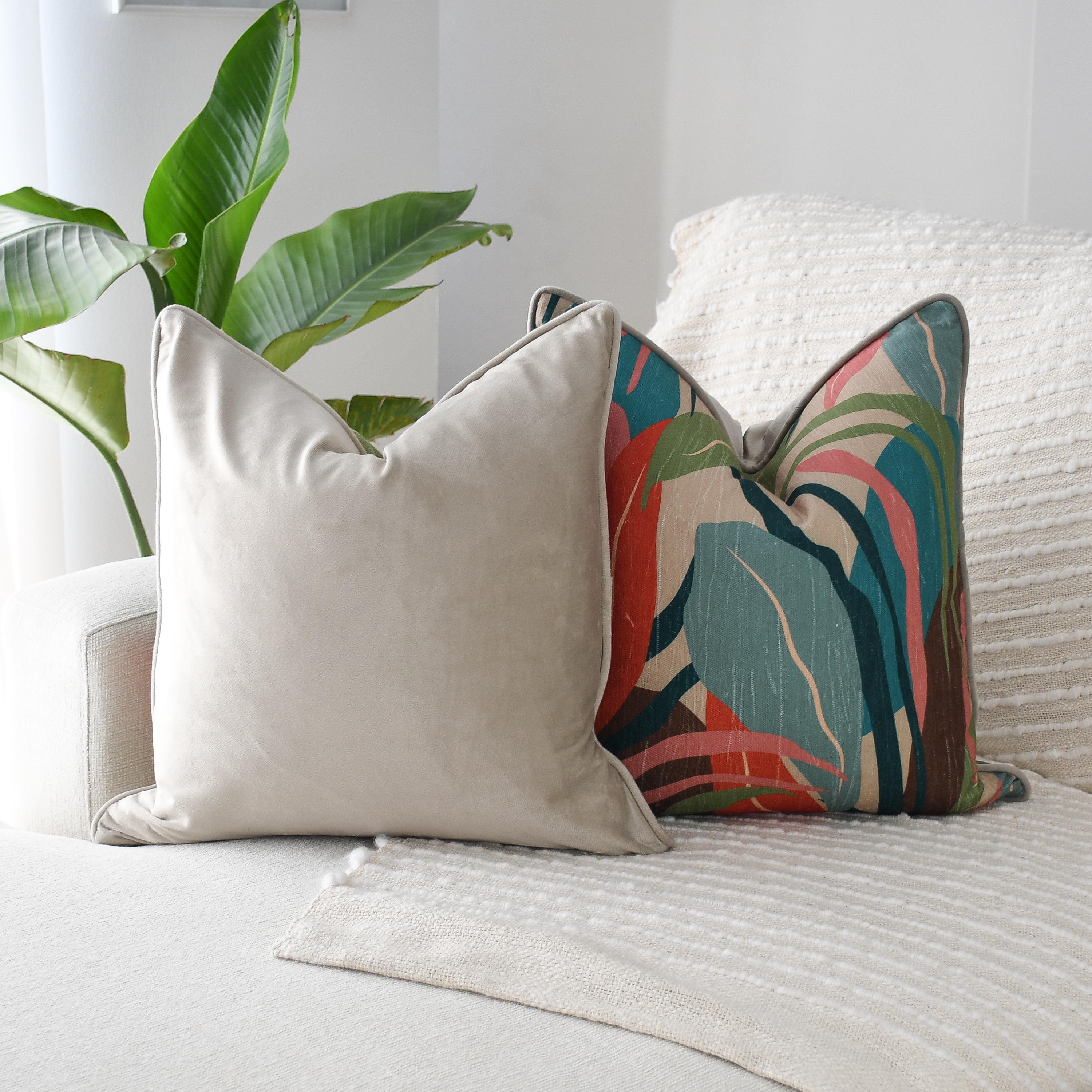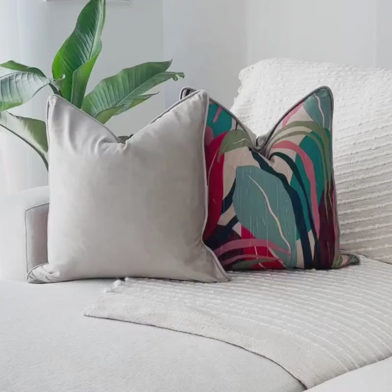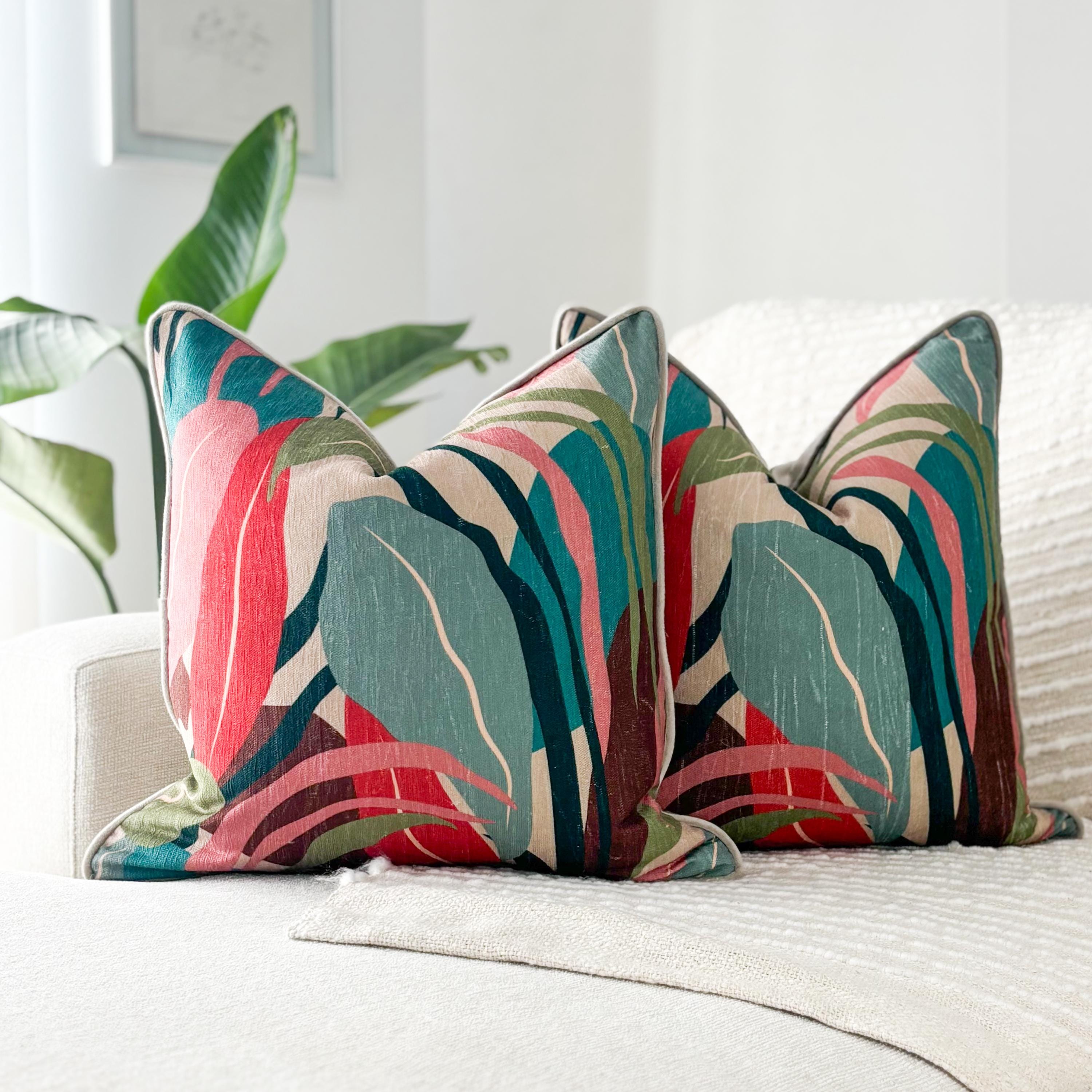 These beautiful pillows use hand woven fabrics imported from India. (Pillow Insert NOT included). Bring artful vibrancy into your home with our Tropical Floral Designer Pillow Cover, a bold 18x18 accent that instantly transforms any space. The front showcases a stunning painterly botanical pattern in saturated shades of teal, coral, blush, olive, and deep berry, creating a lively, flowing composition that feels both modern and organic.